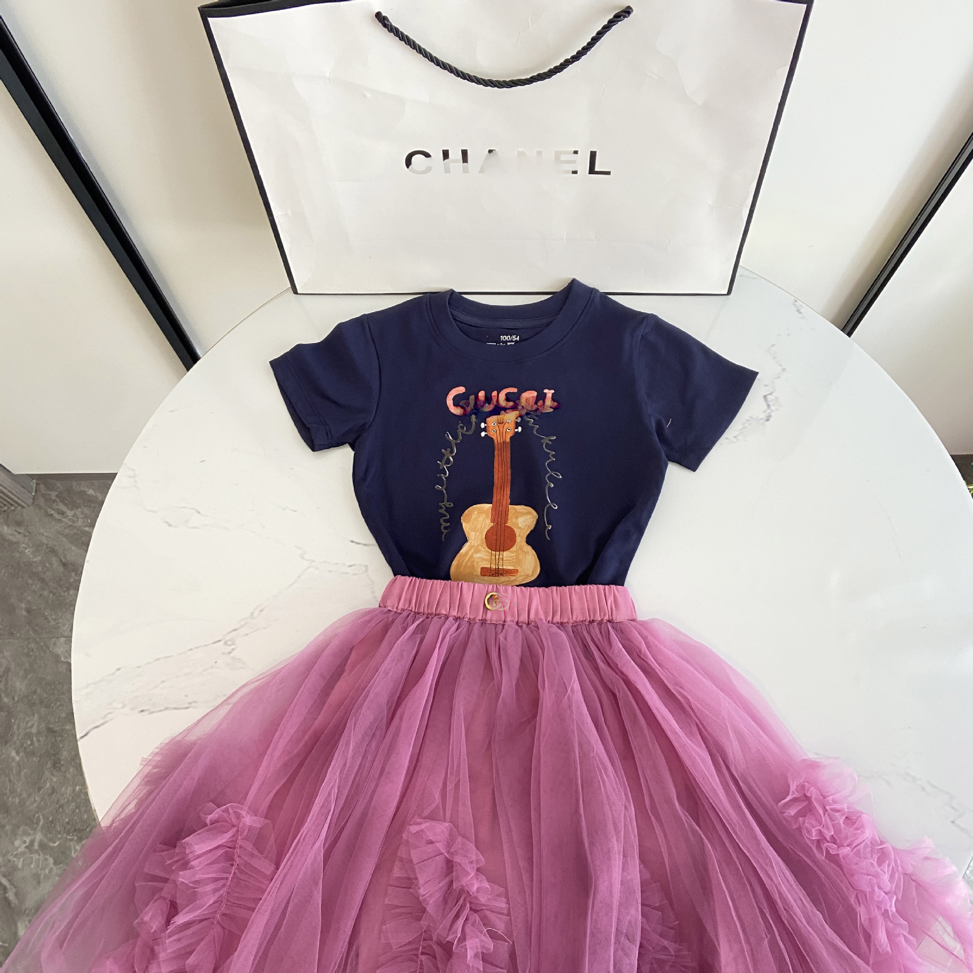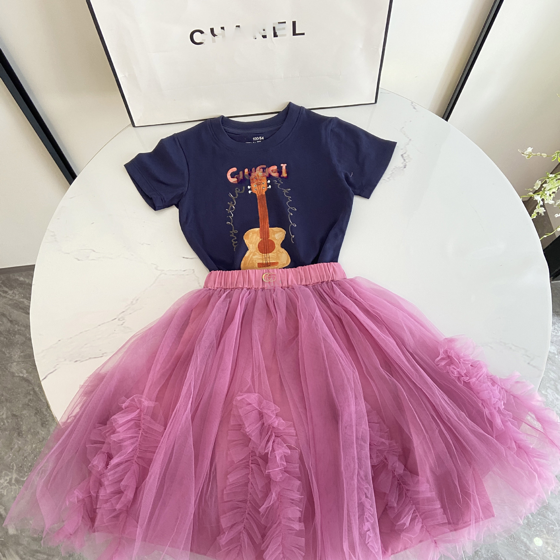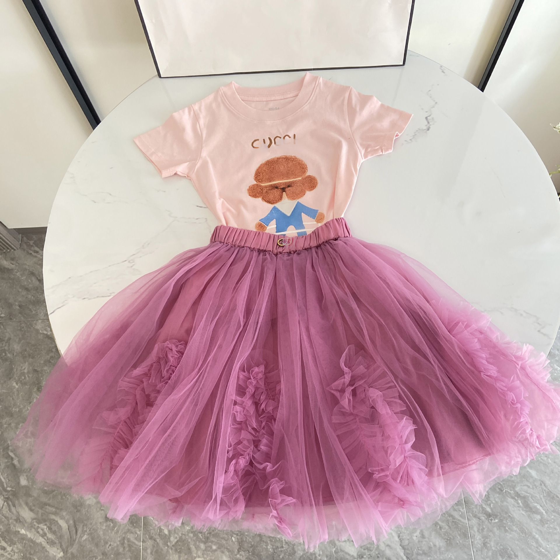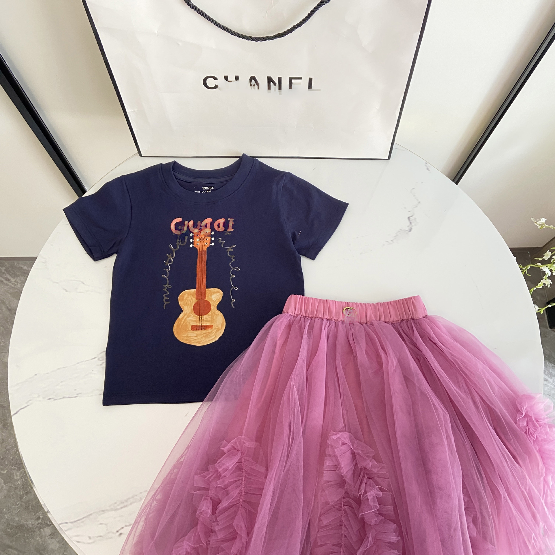 2025 새로운 여름 소녀 티셔츠 + 보라색 스커트 순수 코튼 반팔 프린트 탑 퍼프 스커트 유행 여성스토어 가기