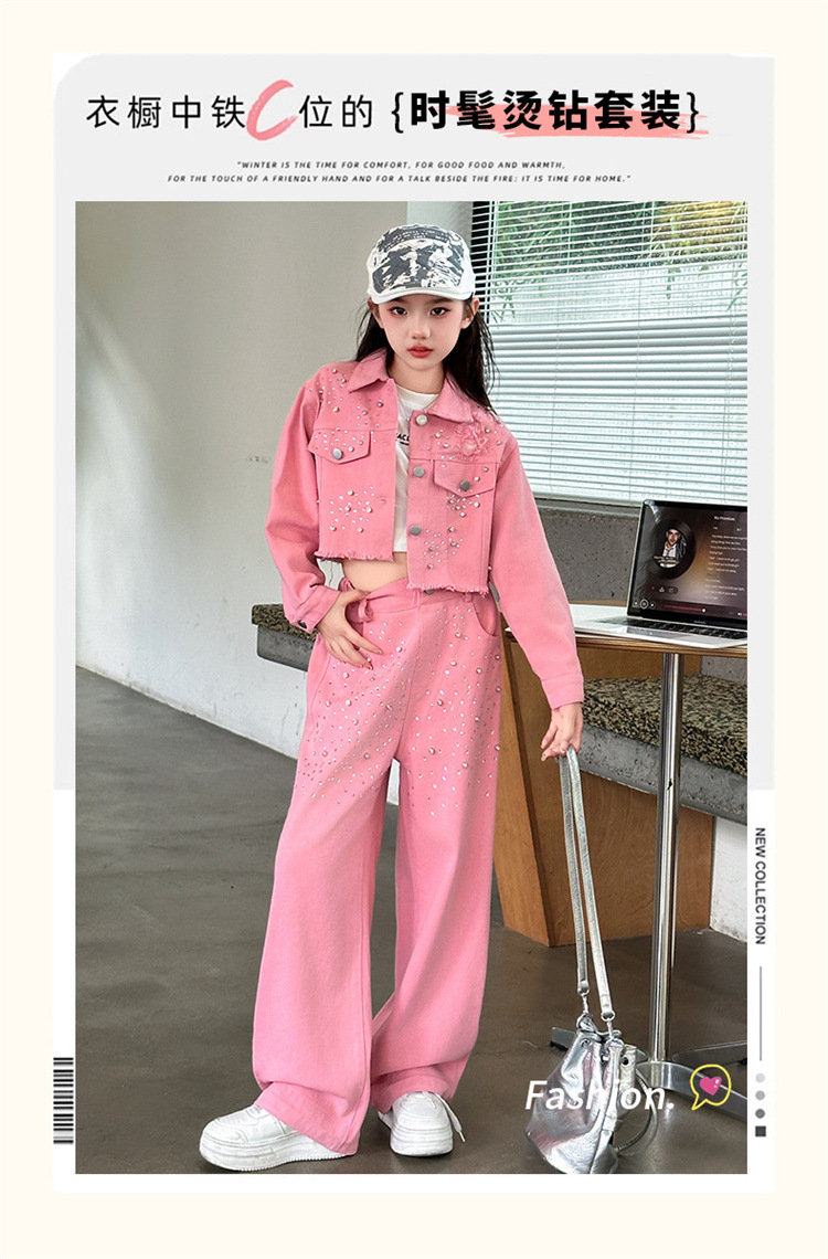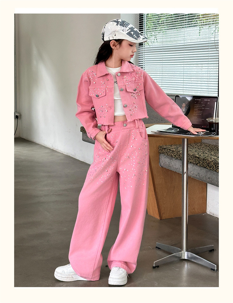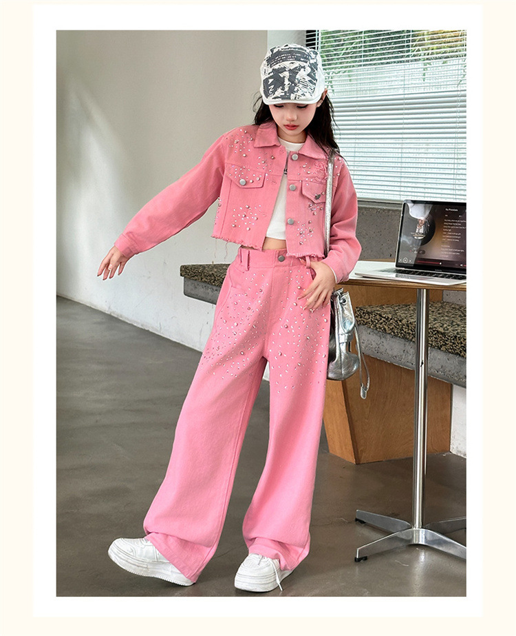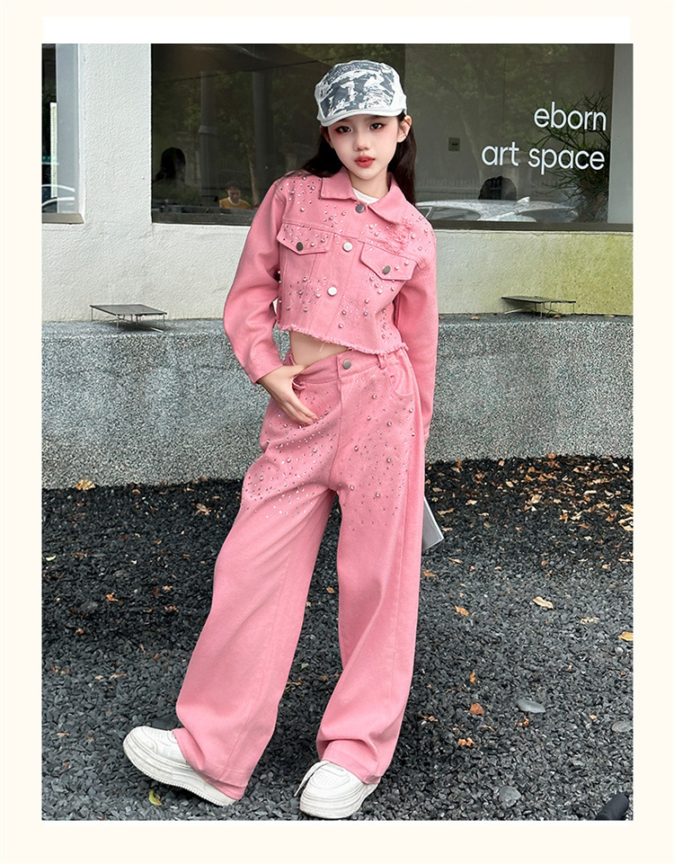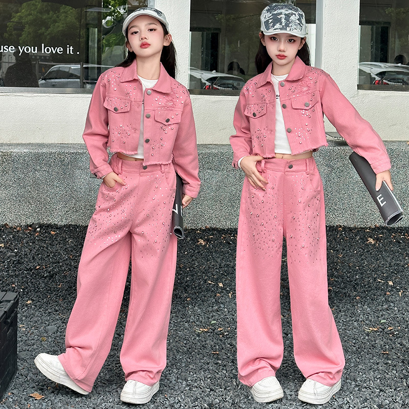여자 고급 우아한 핑크 데님 2025 세트 신설 봄 가을 어린이 한국 패션 핫 라인스톤 투피스 세트스토어 가기
