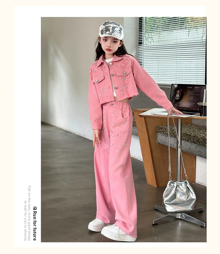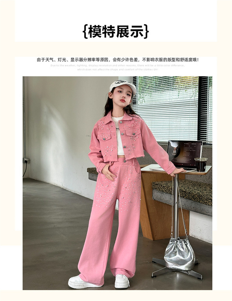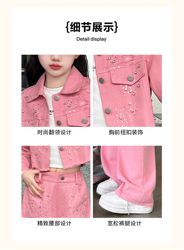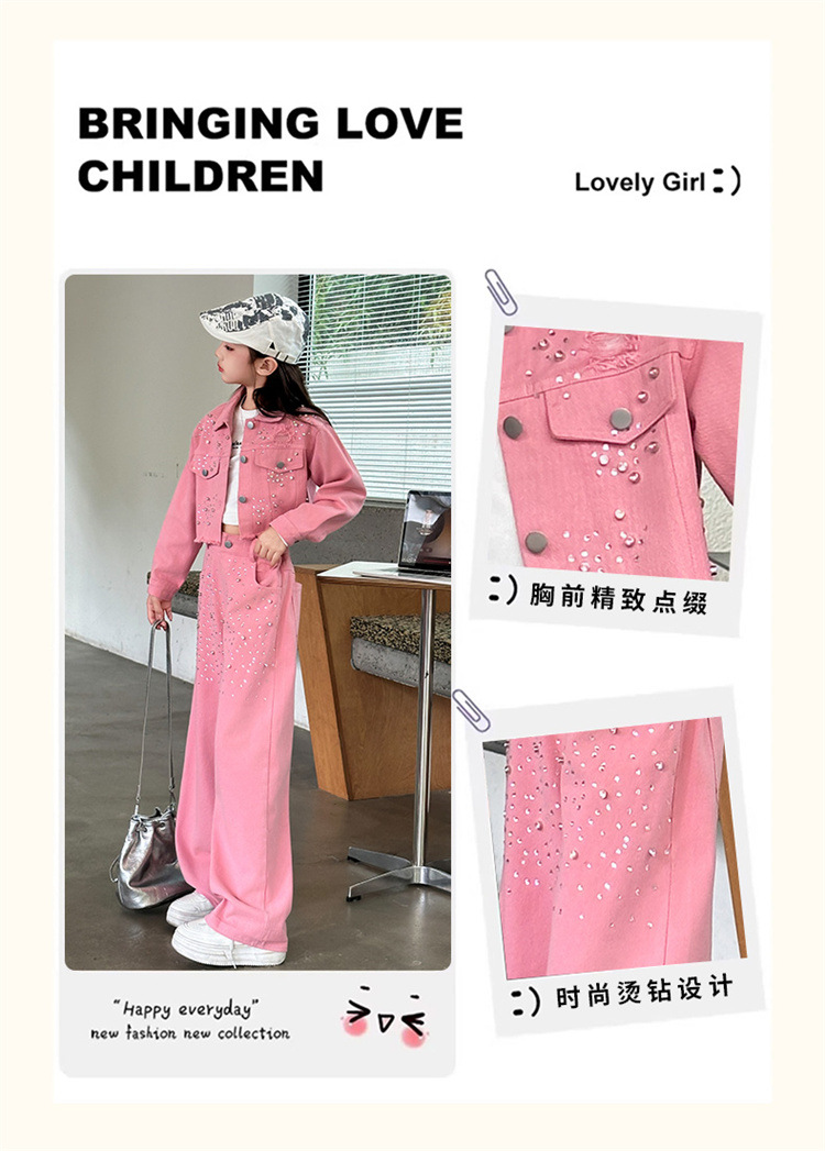 여자 고급 우아한 핑크 데님 2025 세트 신설 봄 가을 어린이 한국 패션 핫 라인스톤 투피스 세트스토어 가기