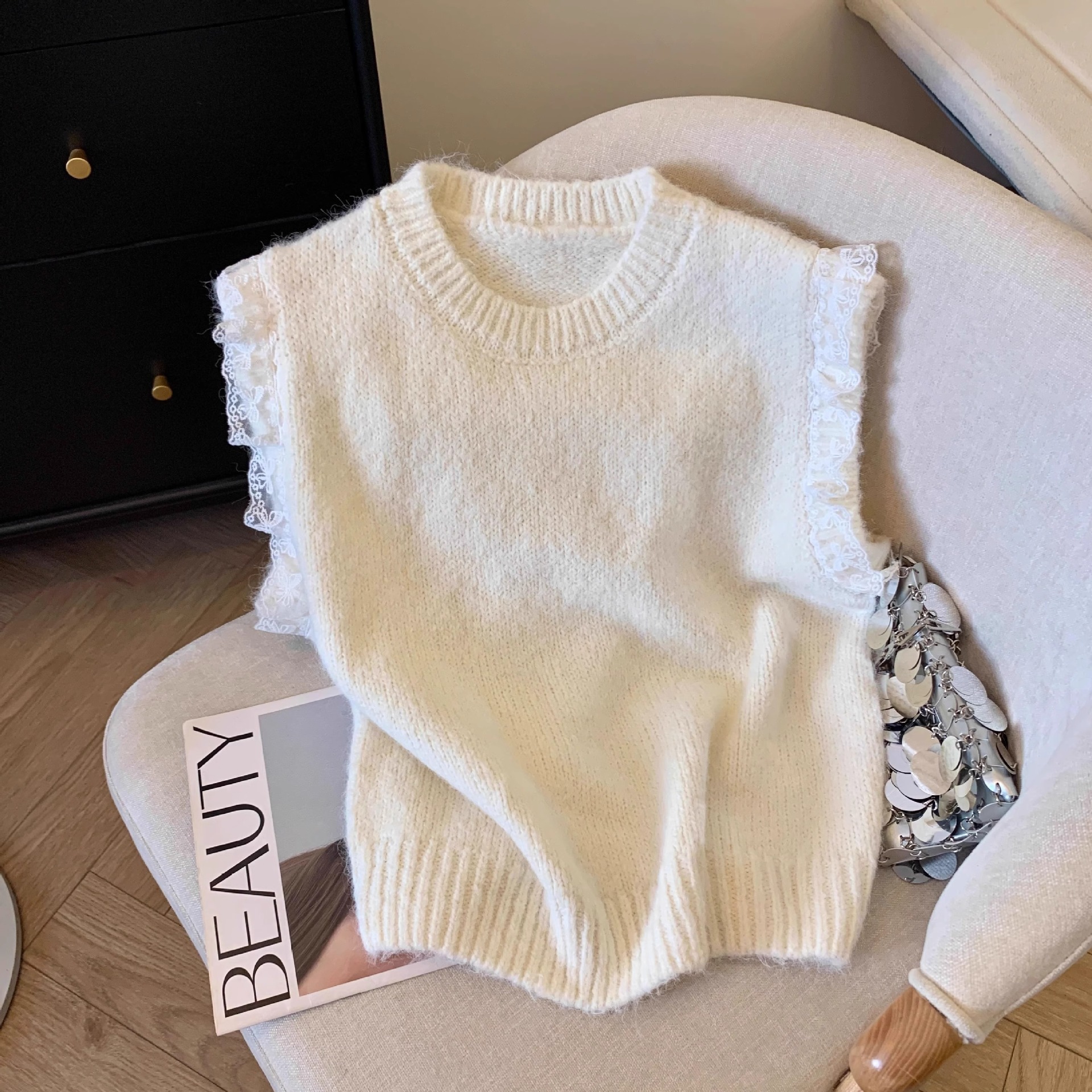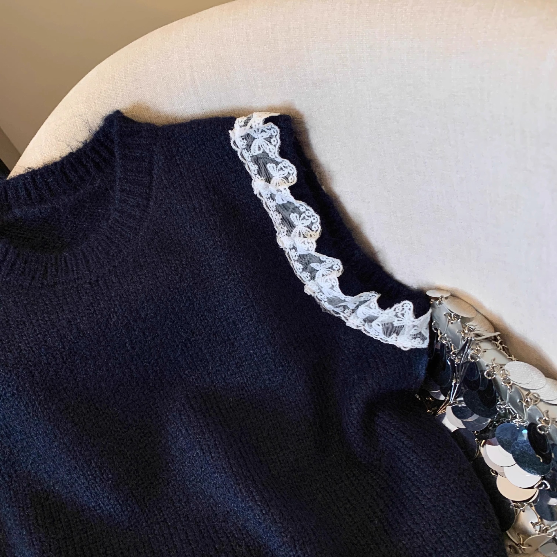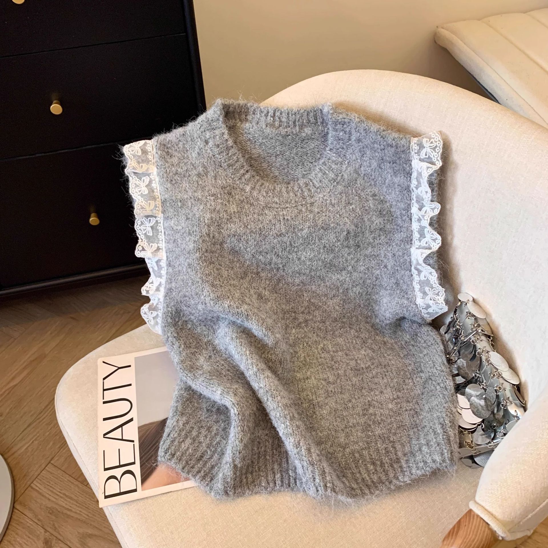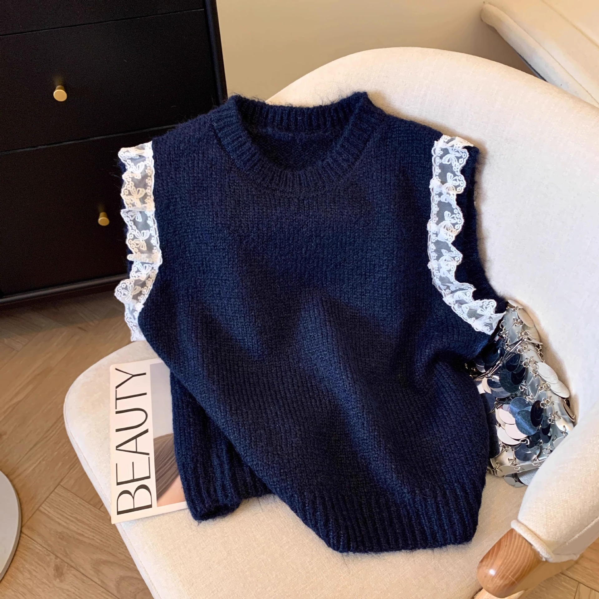빈티지 레이스 바느질 민소매 니트 조끼 여성의 봄과 가을 둥근 목 느슨한 게으른 스타일 서양식 스웨터 탑