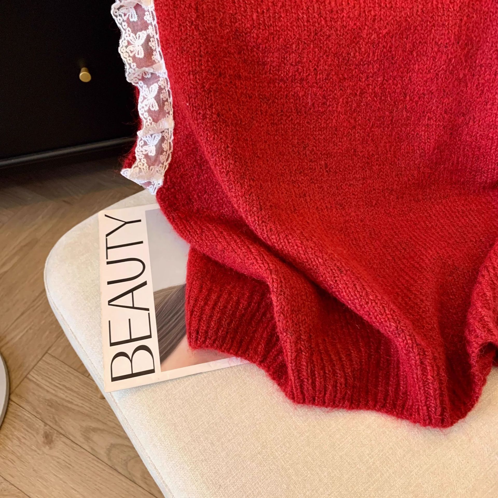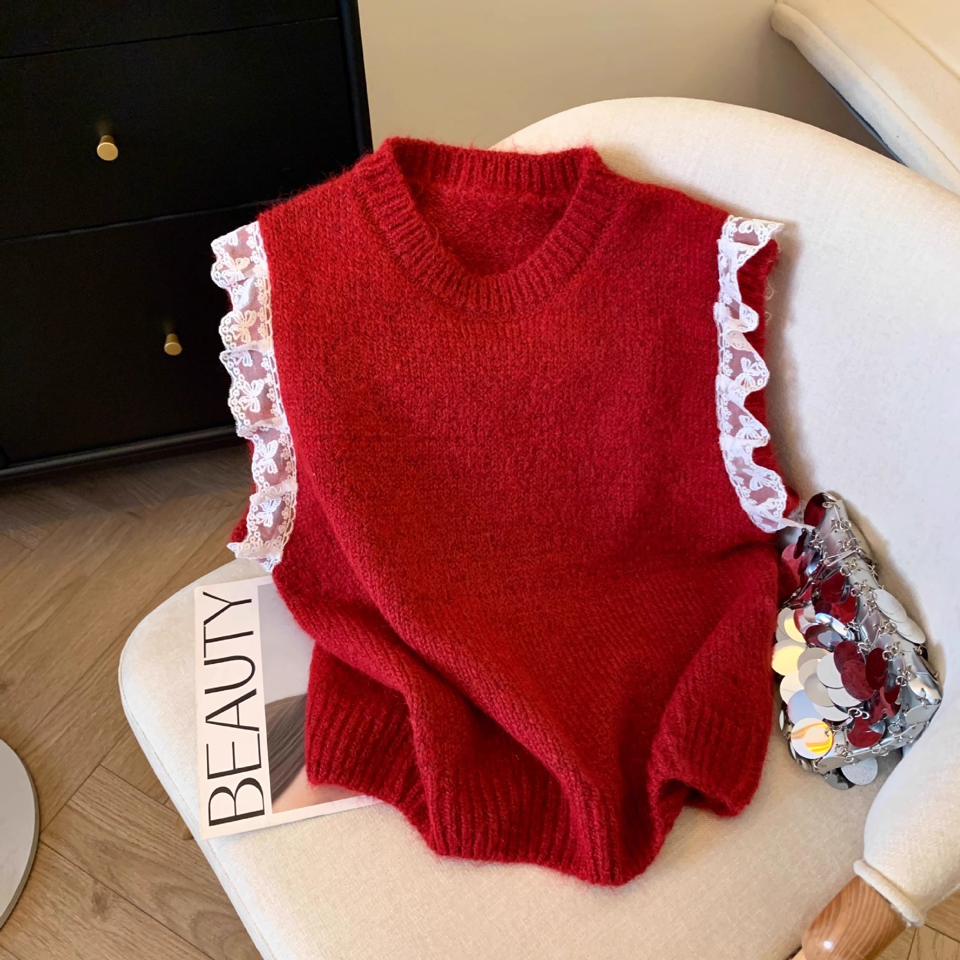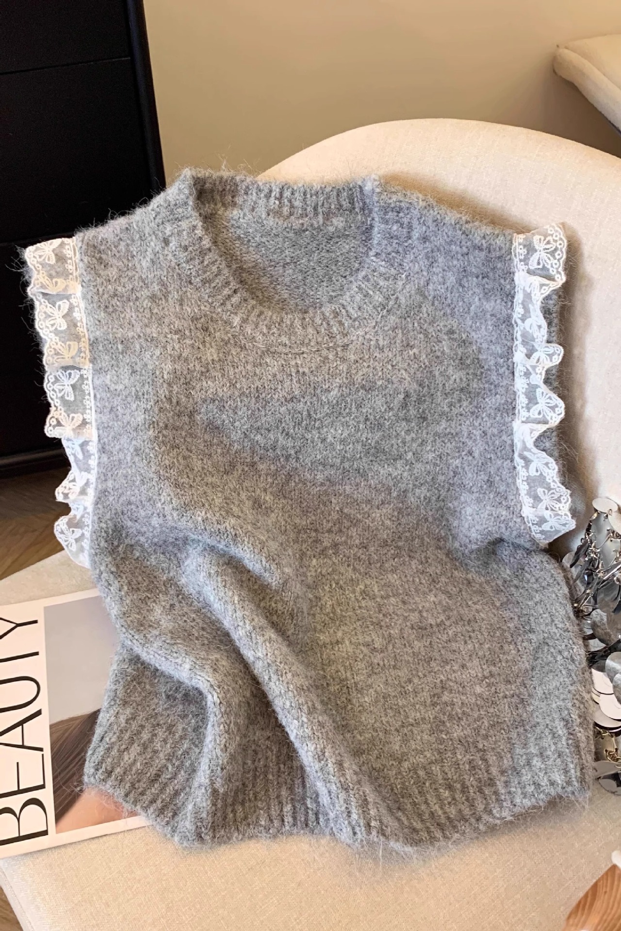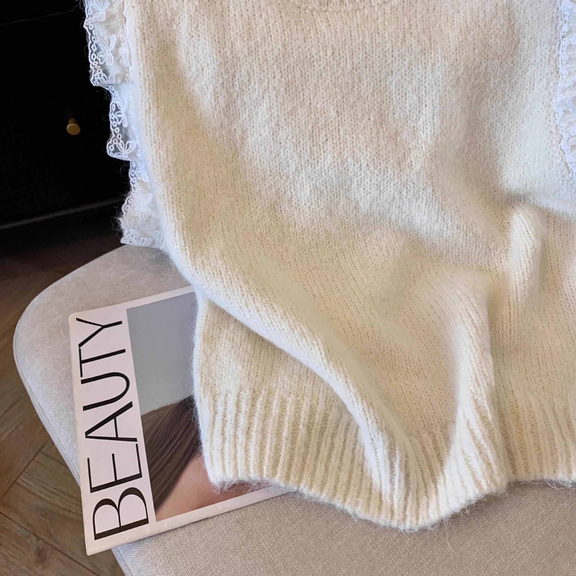 빈티지 레이스 바느질 민소매 니트 조끼 여성의 봄과 가을 둥근 목 느슨한 게으른 스타일 서양식 스웨터 탑