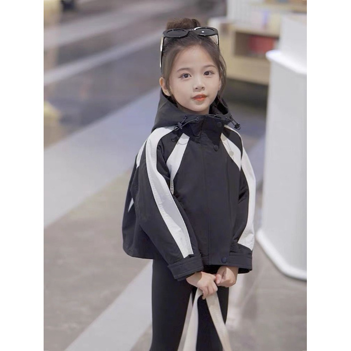 소녀 충전 재킷 봄 2024 새로운 스타일 중대형 키즈 소녀 십대 대조 컬러 후드 자켓 트렌디 한 아우터스토어 가기