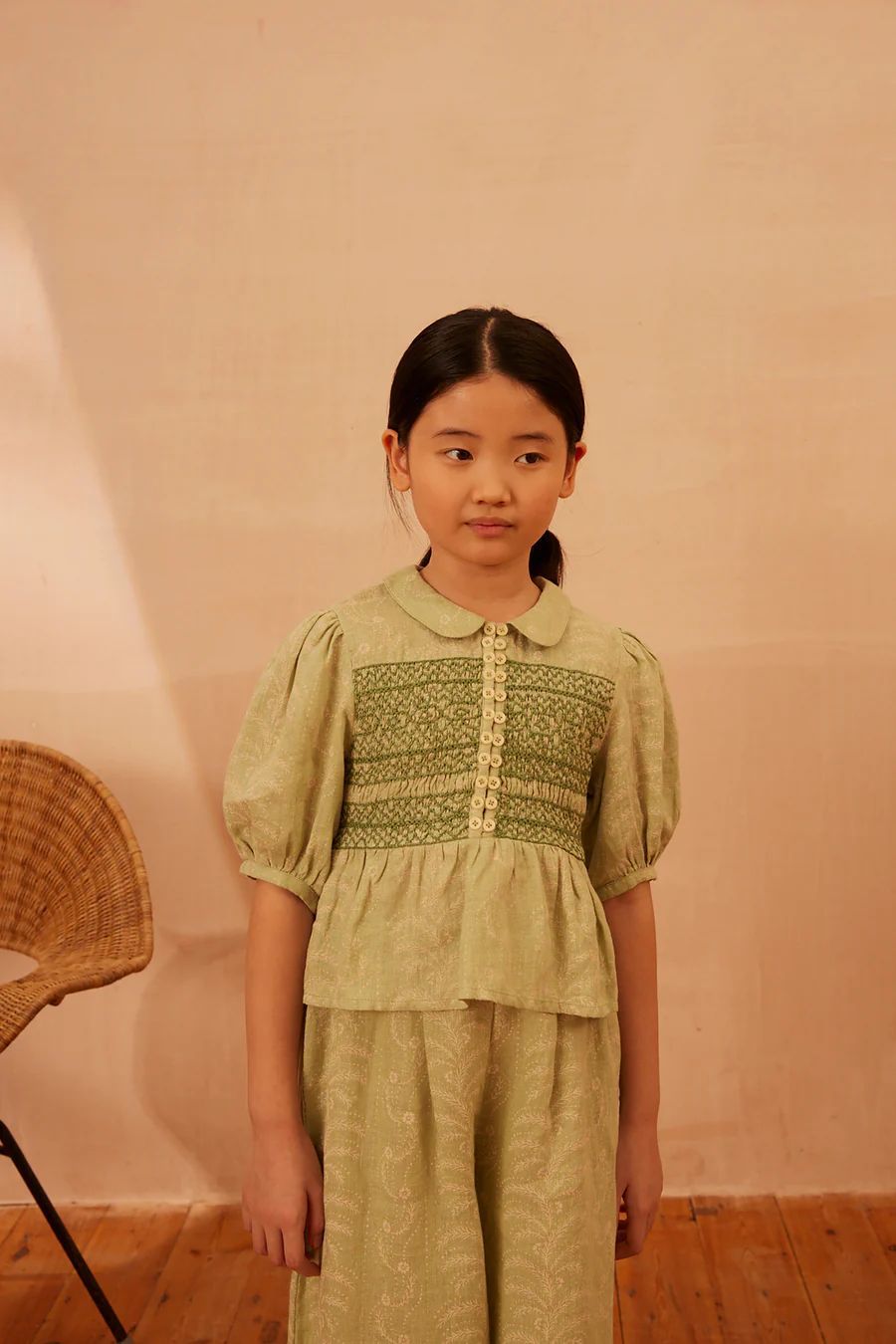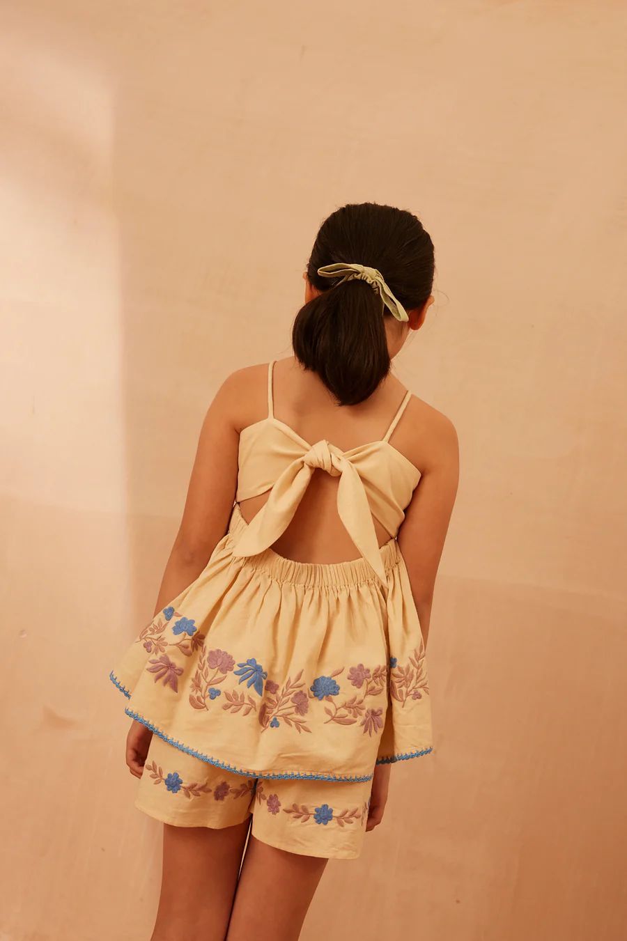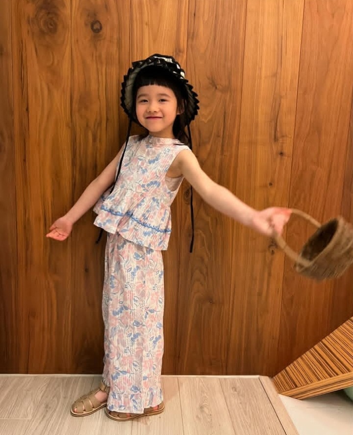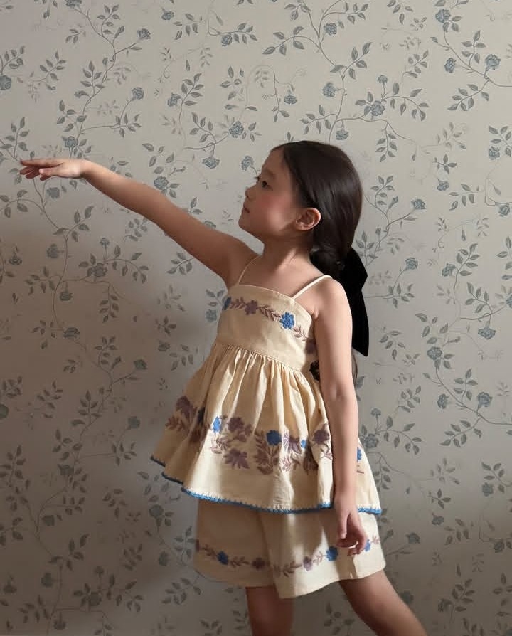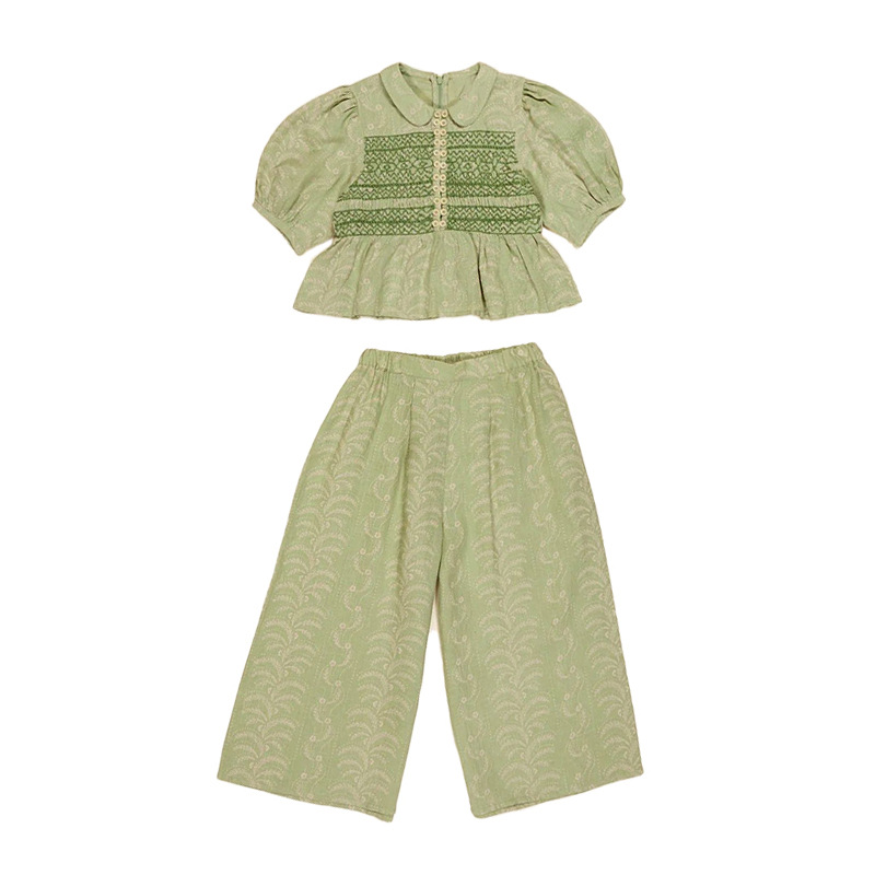 어린이 세트 2025 여름 apo 새로운 소녀 목가적 인 스타일 Gaoding 중공업 최고 반바지 투피스 세트