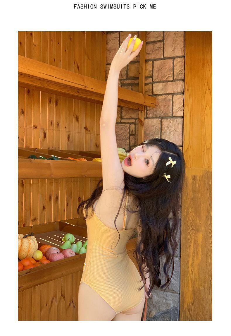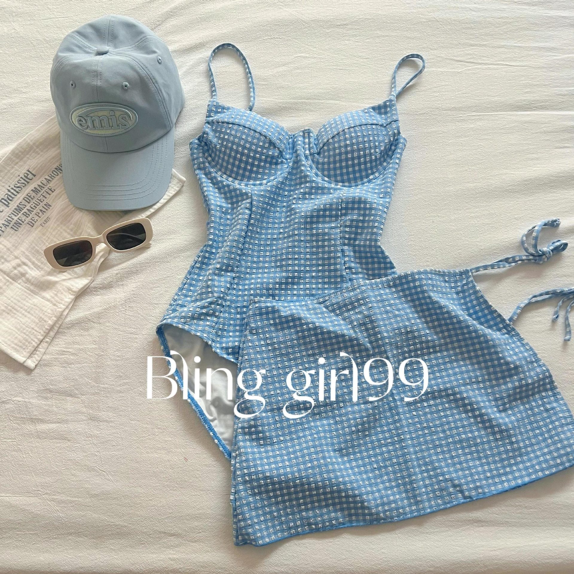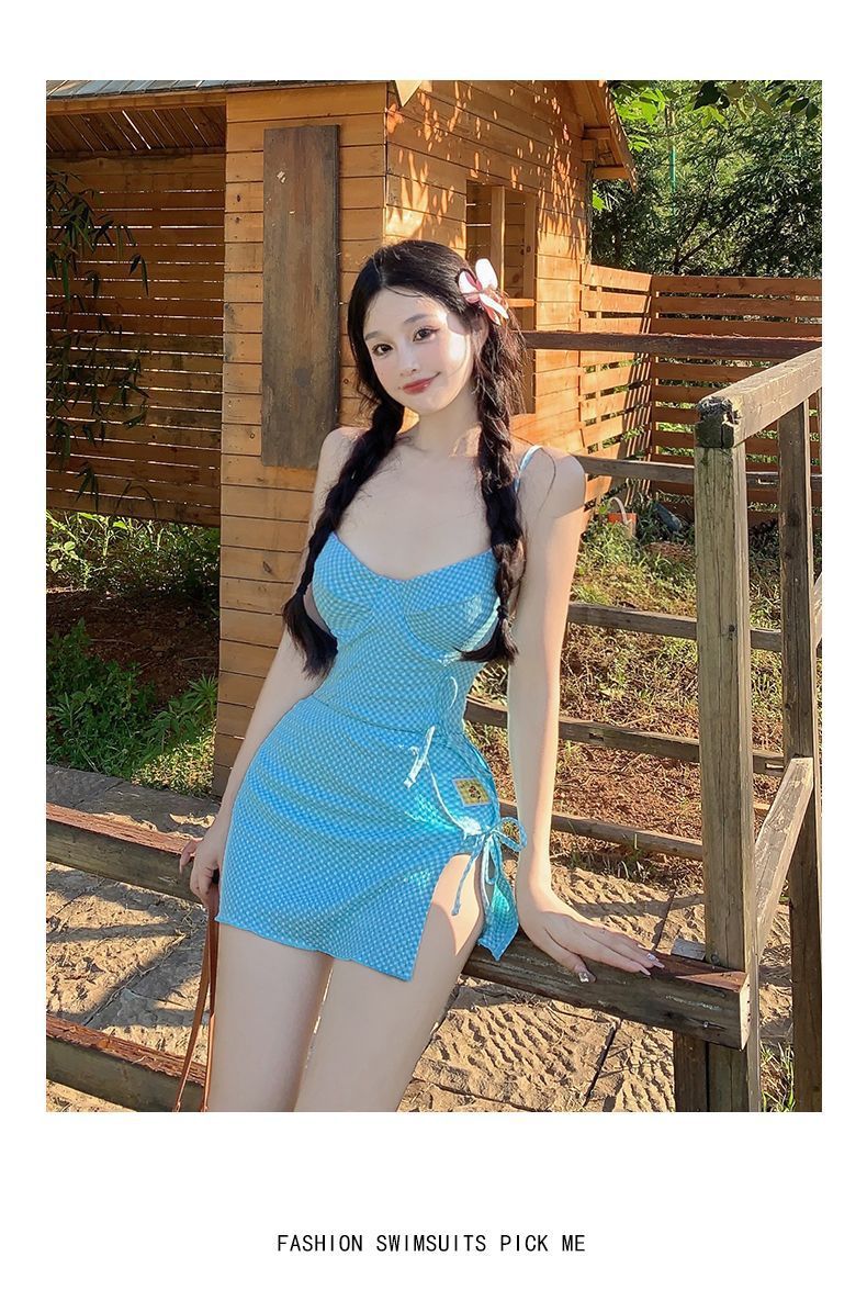 새로운 도파민 블루 슬링 순수한 섹시한 스커트 스타일 수영복 여성 격자 무늬 온천 귀여운 슈퍼 페어리