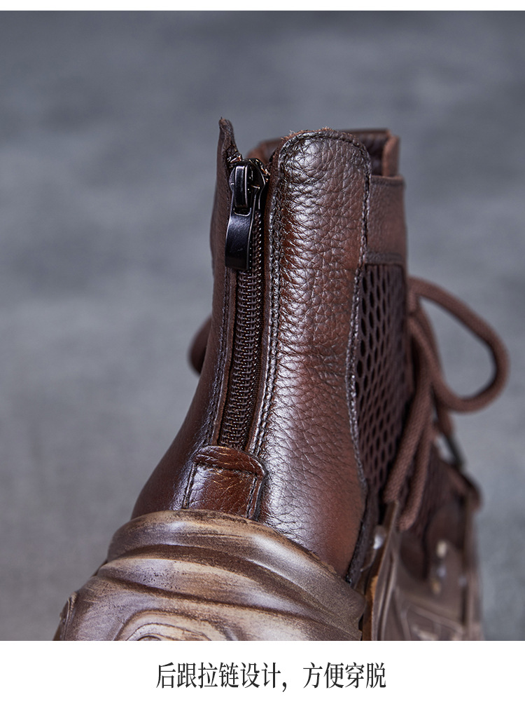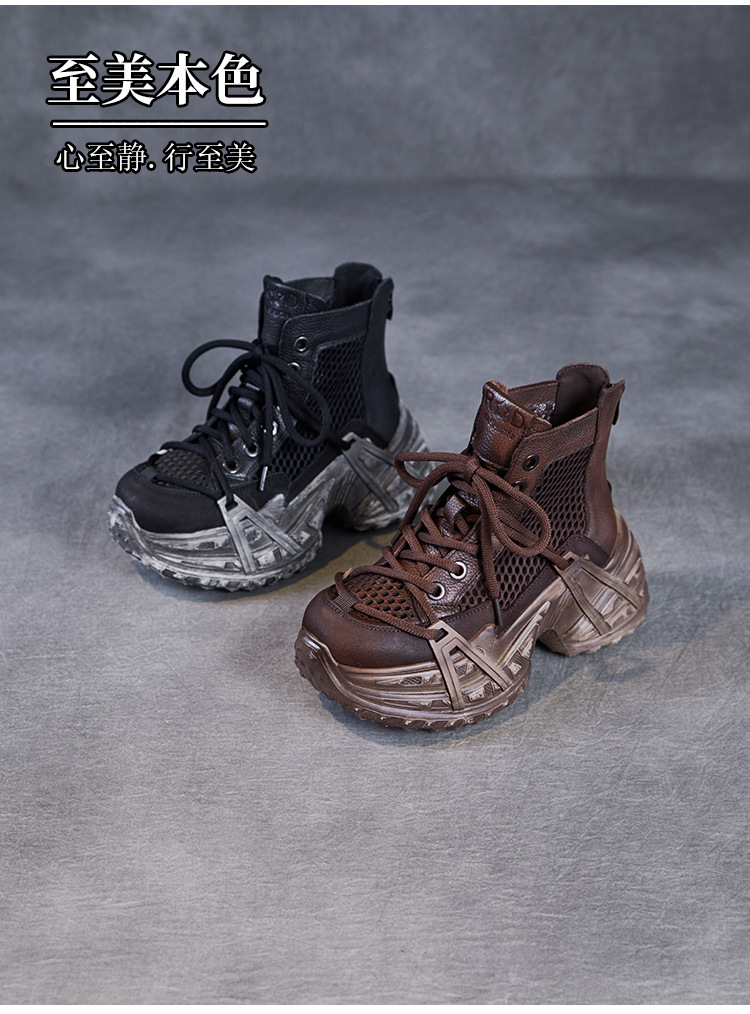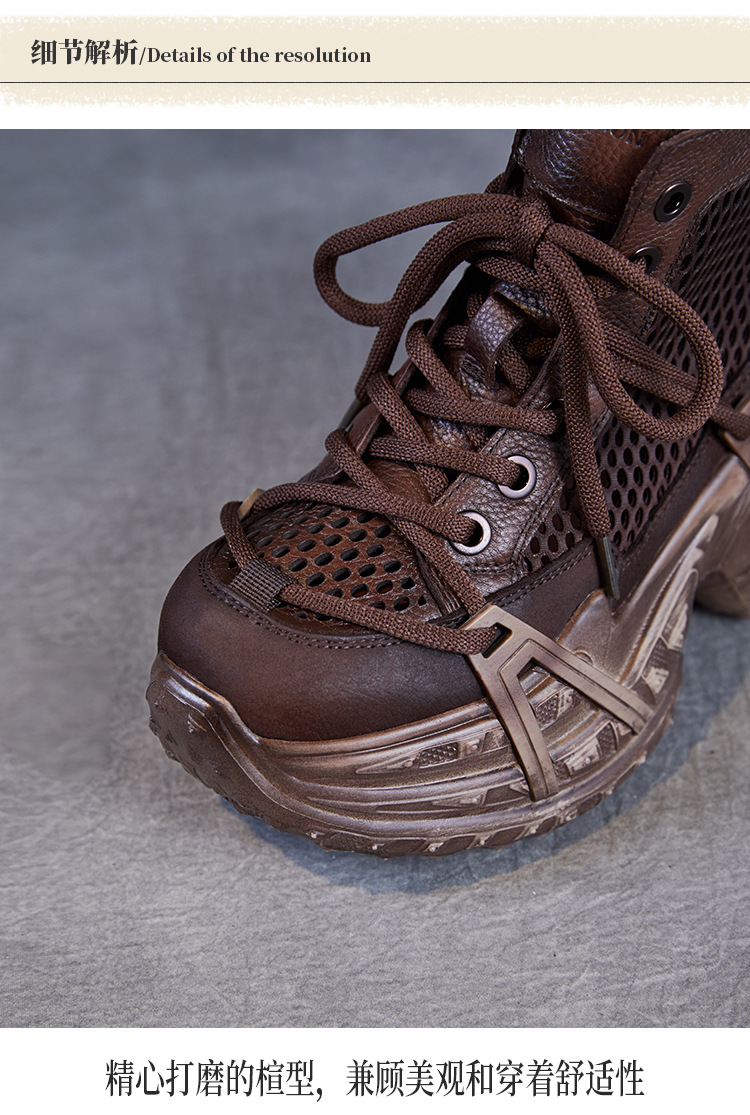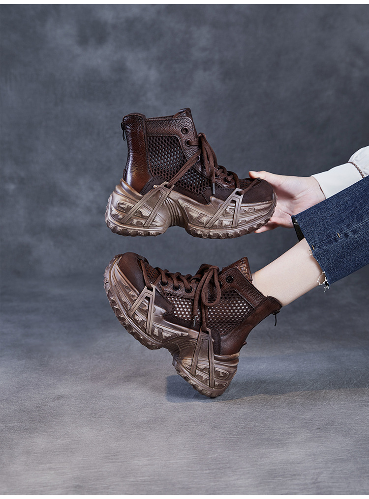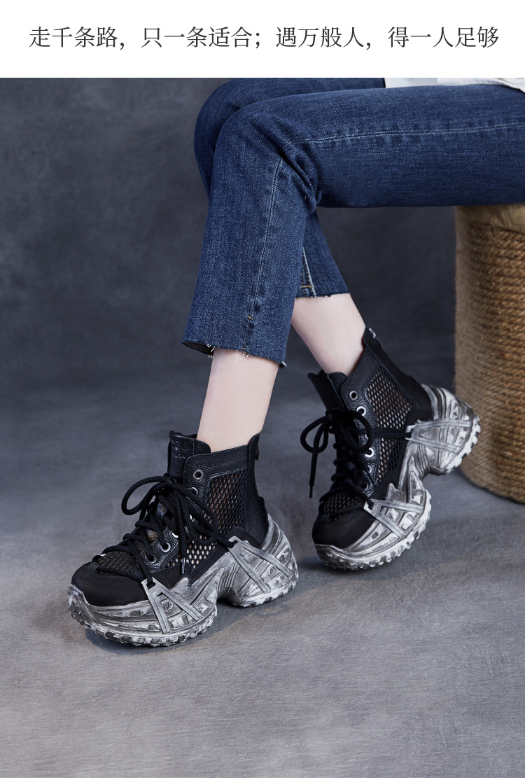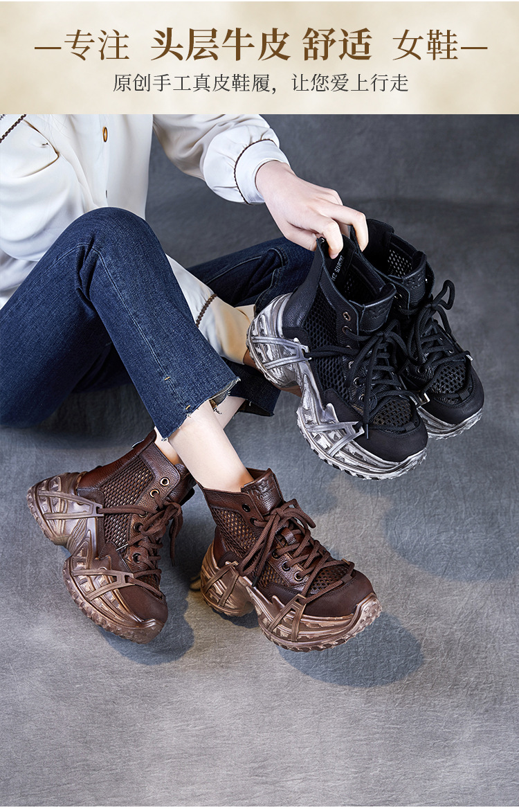 미국에 2025 년 봄과 여름 정품 가죽 두꺼운 밑창 증가 Cowhide Roman 플랫폼 짧은 메쉬 부츠 여성 통기성 패션 샌들