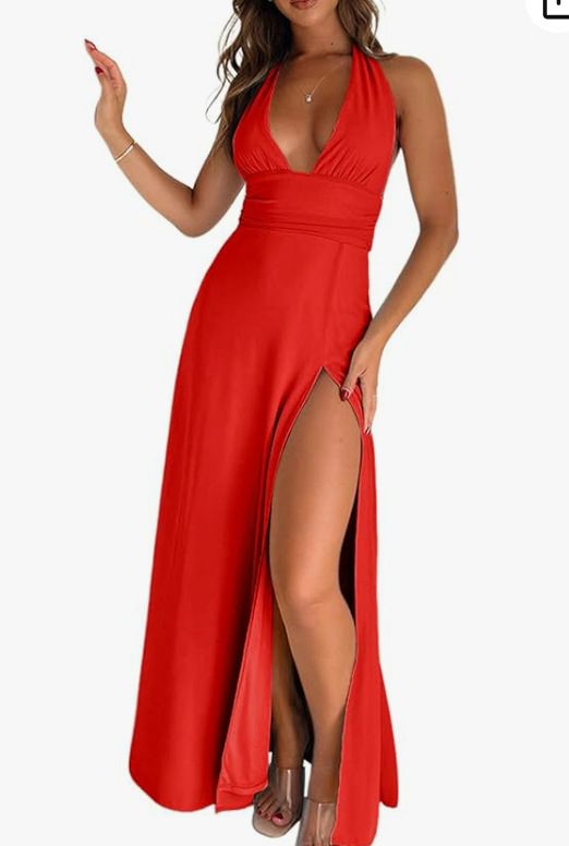 2025 년 봄 새. 유럽과 미국 여성의 우아한 목 V-Neck 슬릿 긴 단색 원피스스토어 가기