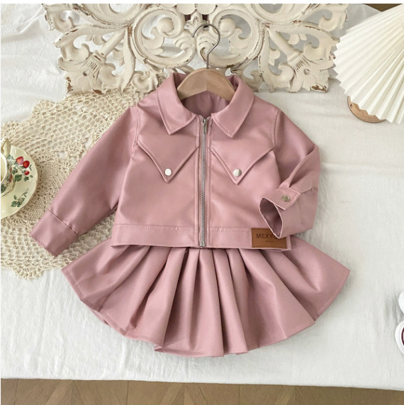 소녀의 가을 PU 가죽 세트 소녀의 한국 스타일 유행 베어러 옷 어린이 가죽 재킷 주름 치마 투피스 세트