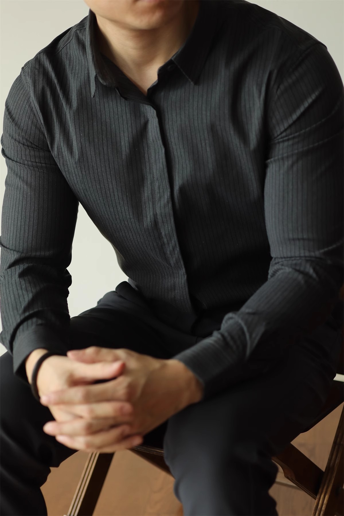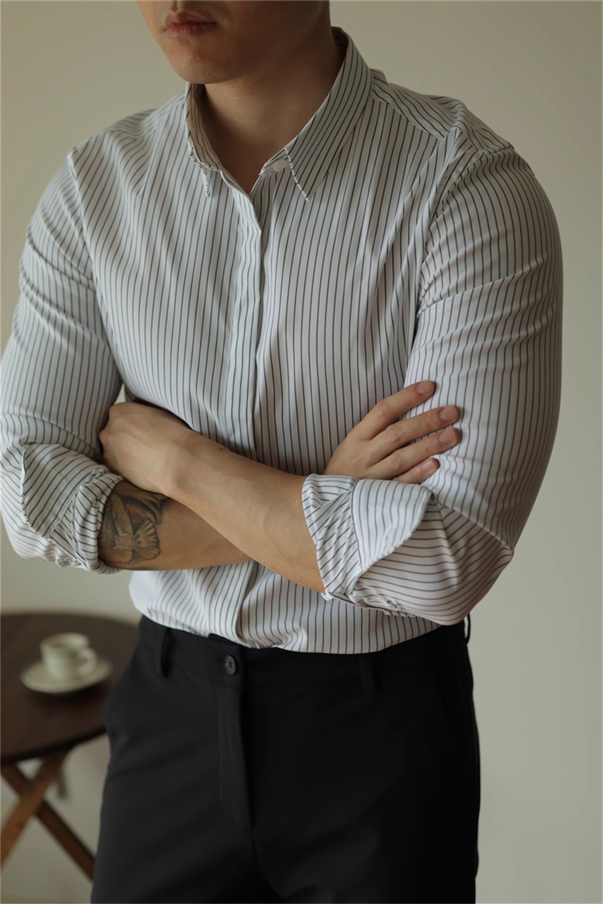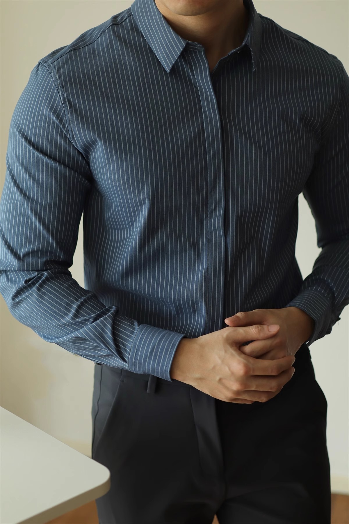 【도시 비즈니스 시리즈】다림질 필요 없는 주름 방지 스트라이프 디센트 플래킷 긴팔 셔츠 남성용 봄/가을 출퇴근 셔츠스토어 가기