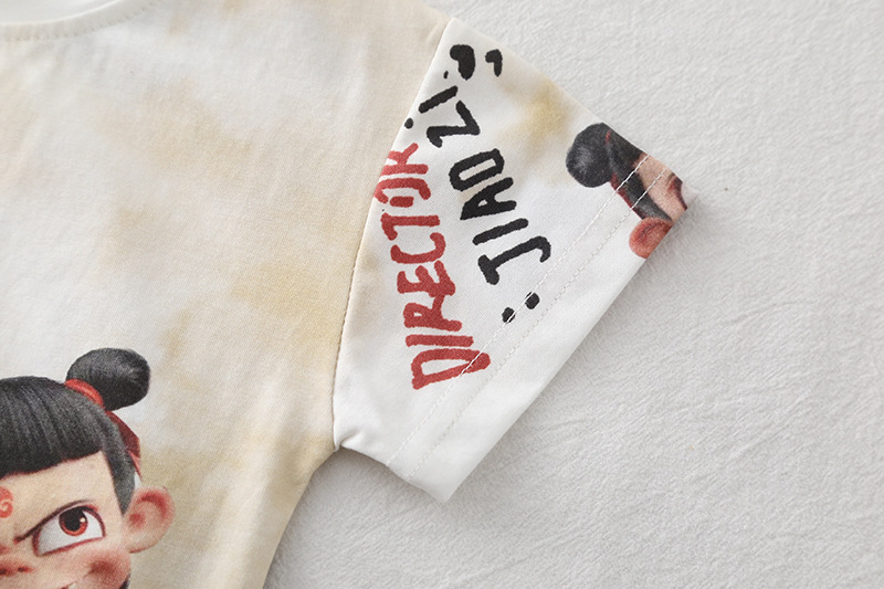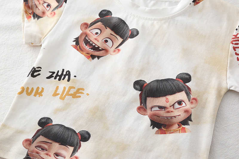 Nezha 검은 눈 만화 머리 귀여운 어린이 여름 티셔츠 중소 어린이 만화 면 짧은 소매