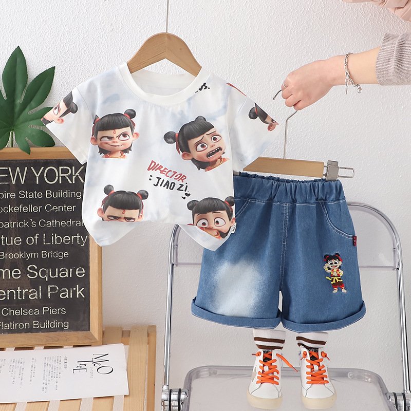 Nezha 검은 눈 만화 머리 귀여운 어린이 여름 티셔츠 중소 어린이 만화 면 짧은 소매스토어 가기