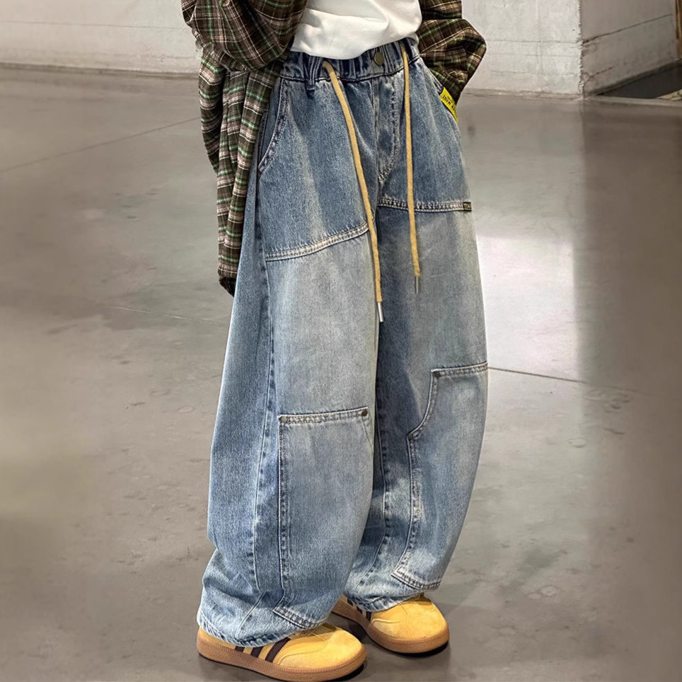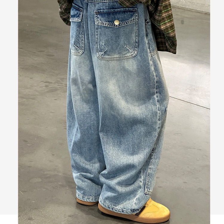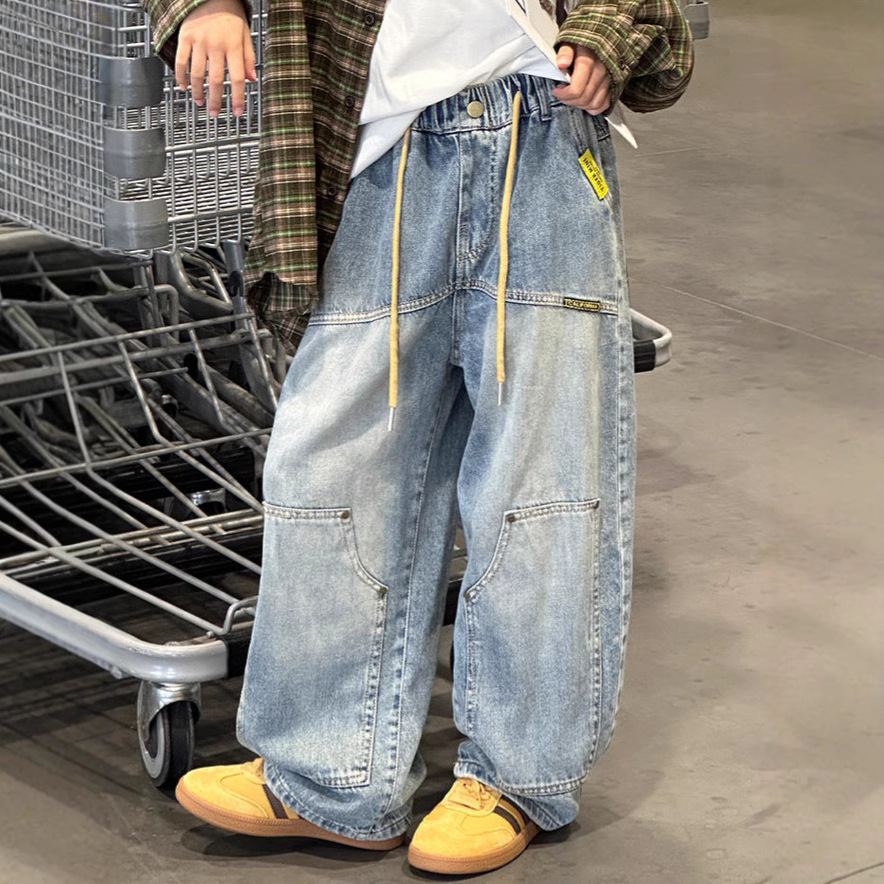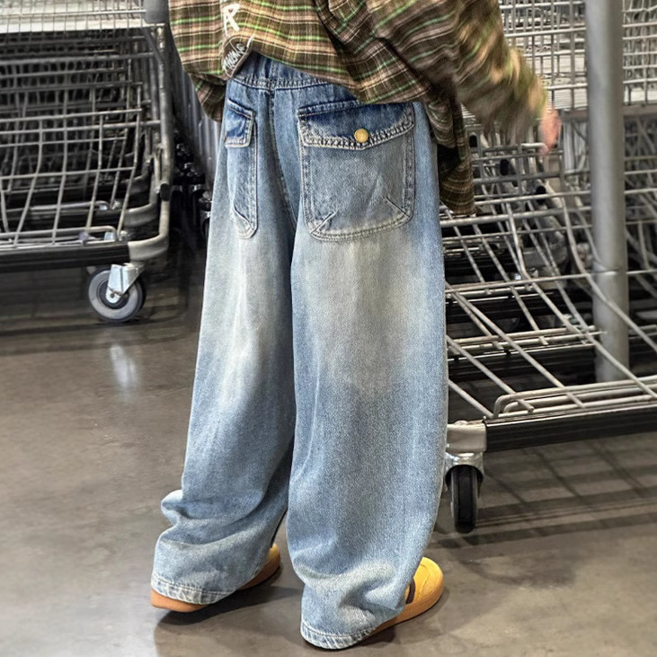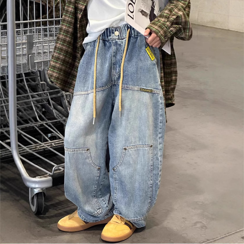 소년의 봄과 가을 더미 청바지 2025 새로운 어린이 봄 착용 느슨한 스트레이트 다리 바지 소년의 유행 넓은 다리 바지스토어 가기