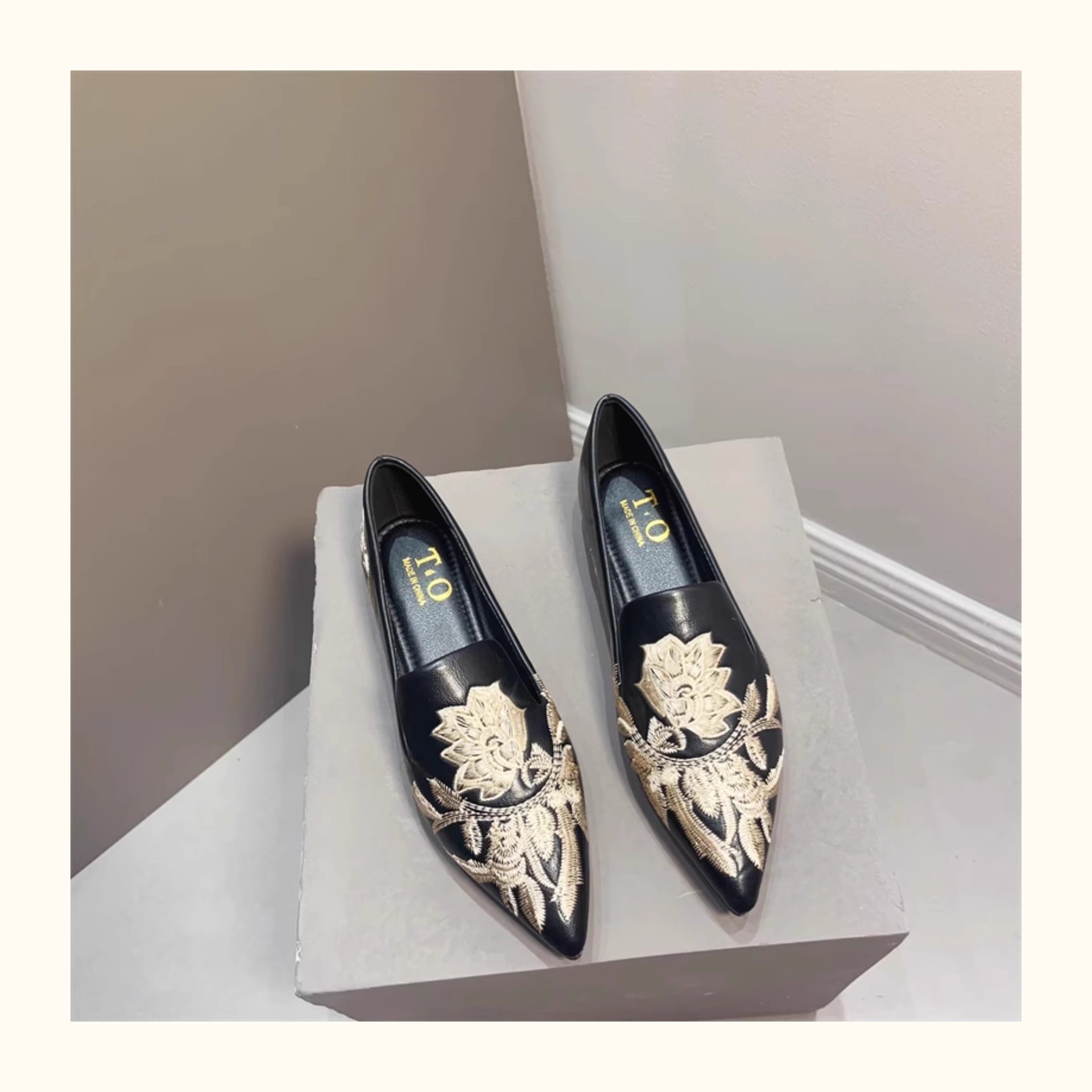 새로운 중국 스타일 국가 스타일 자수 꽃 포인팅 플랫 신발 여성의 봄과 가을 새로운 복고풍 스타일 부드러운 바닥 가죽 완두콩 신발스토어 가기