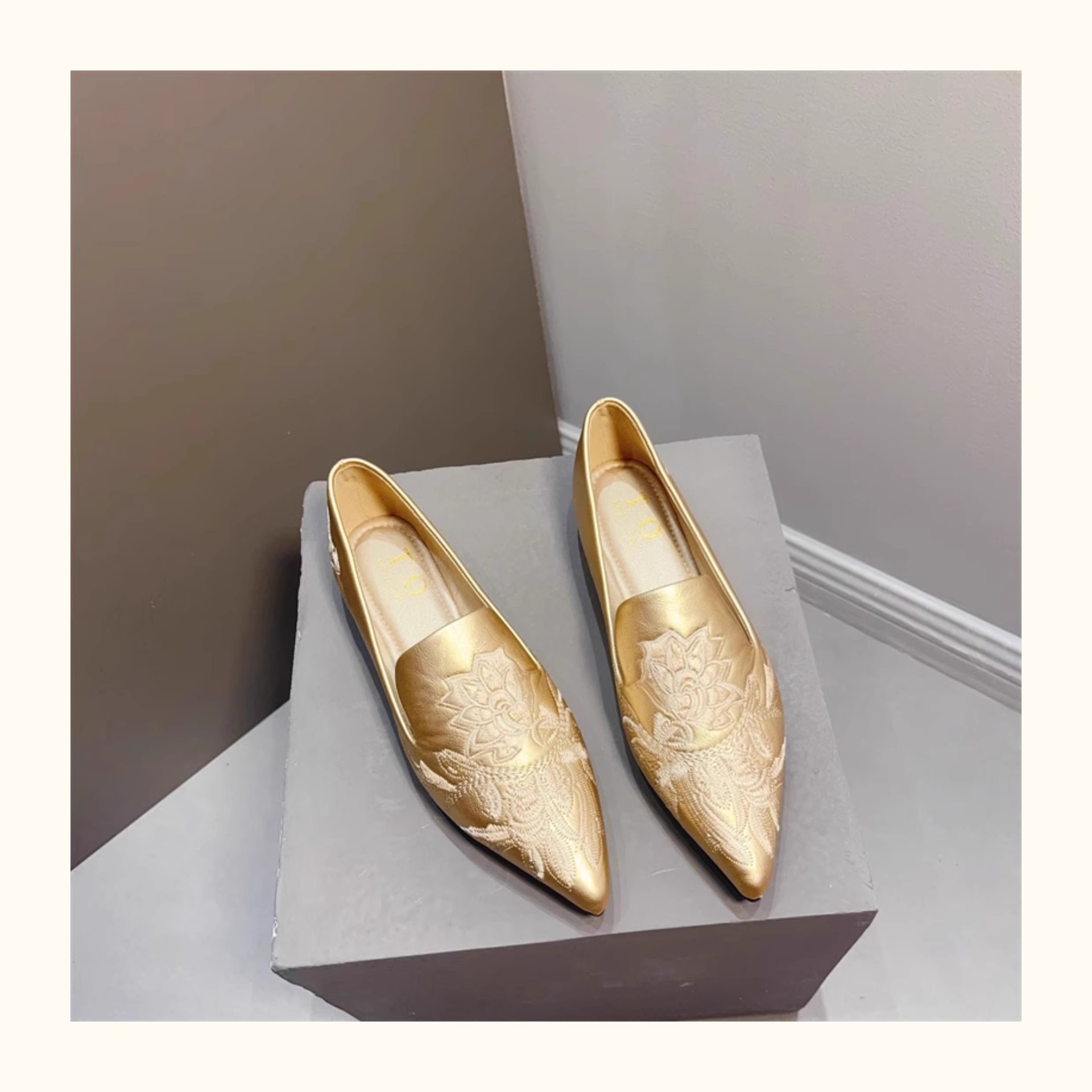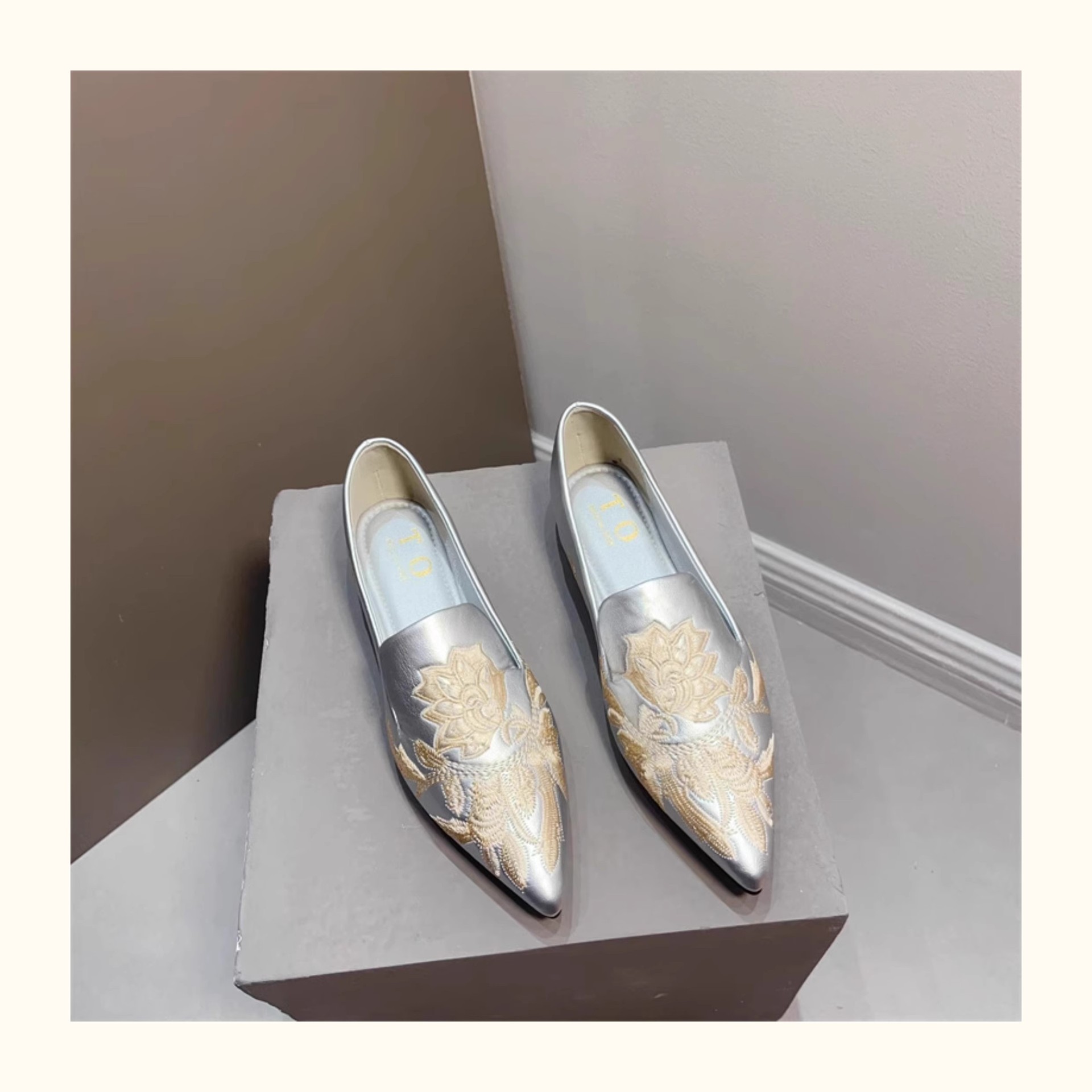 새로운 중국 스타일 국가 스타일 자수 꽃 포인팅 플랫 신발 여성의 봄과 가을 새로운 복고풍 스타일 부드러운 바닥 가죽 완두콩 신발