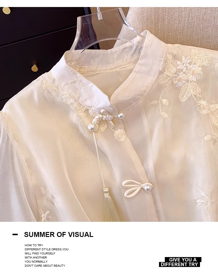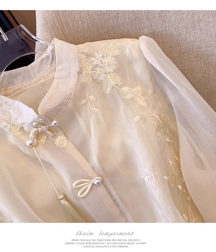 중국 스타일 자수 쉬폰 셔츠 봄 새로운 중국 레트로 버클 수직 칼라 우아한 탑 셔츠 A3171