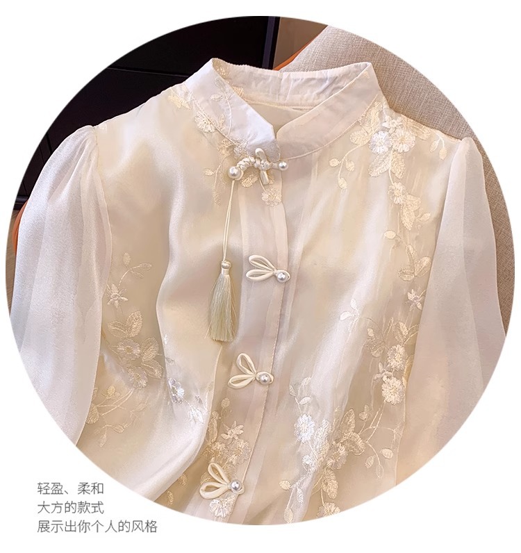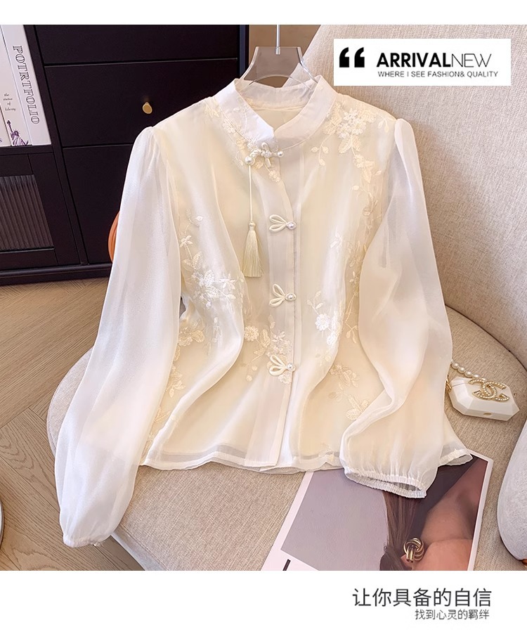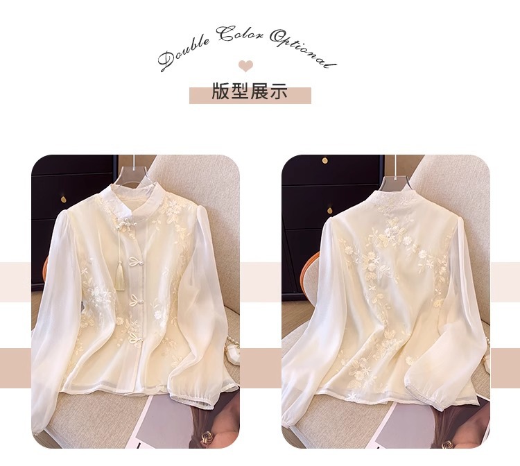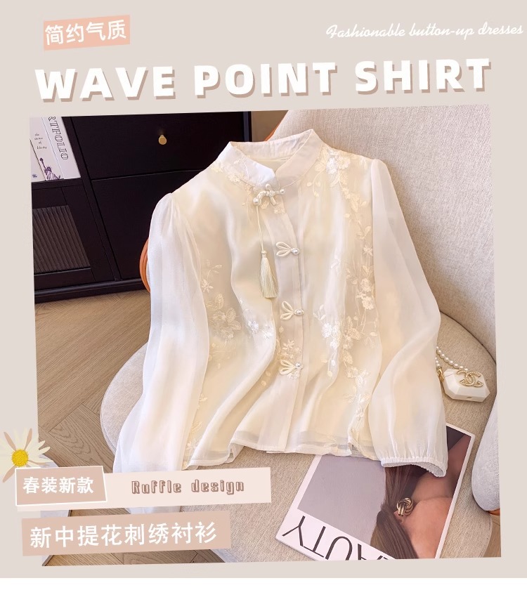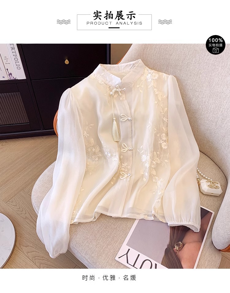 중국 스타일 자수 쉬폰 셔츠 봄 새로운 중국 레트로 버클 수직 칼라 우아한 탑 셔츠 A3171스토어 가기