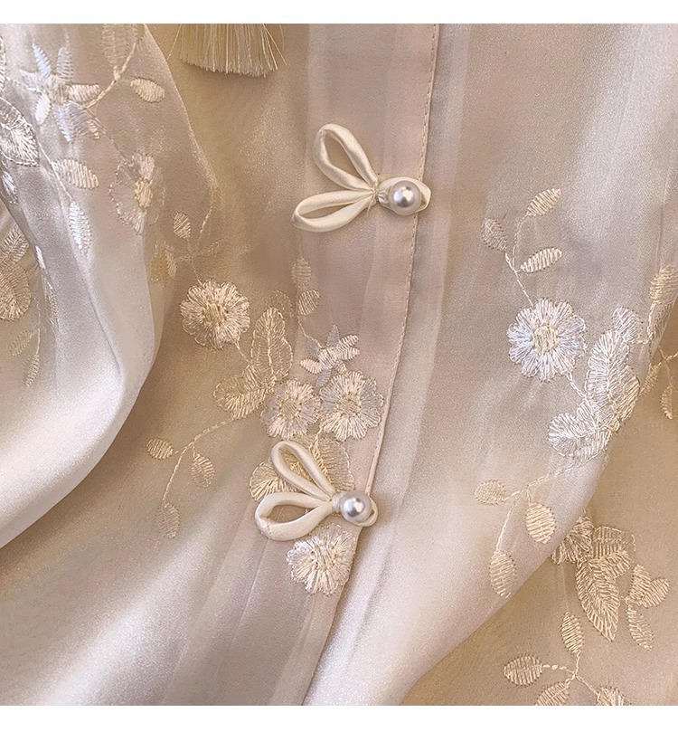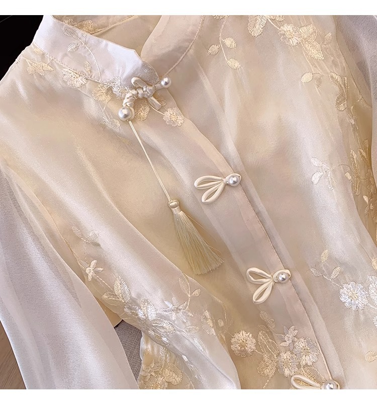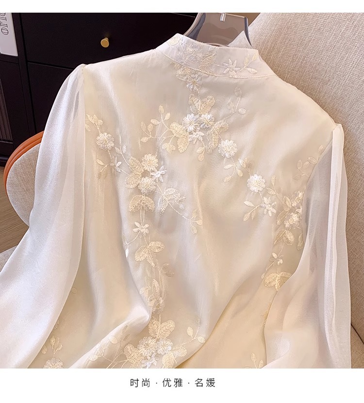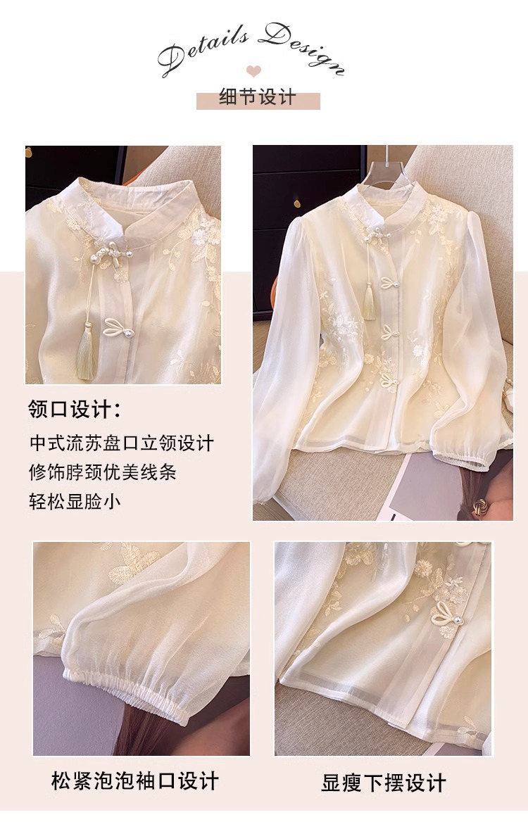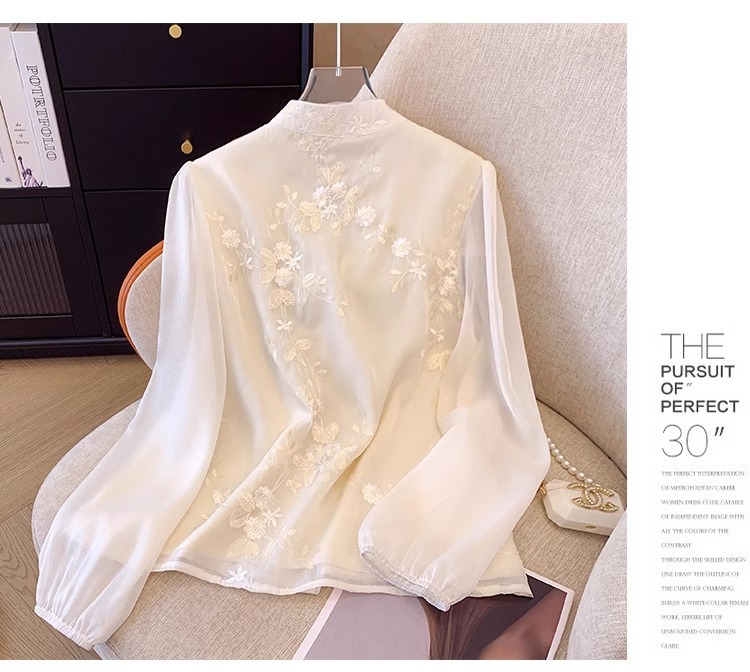 중국 스타일 자수 쉬폰 셔츠 봄 새로운 중국 레트로 버클 수직 칼라 우아한 탑 셔츠 A3171스토어 가기
