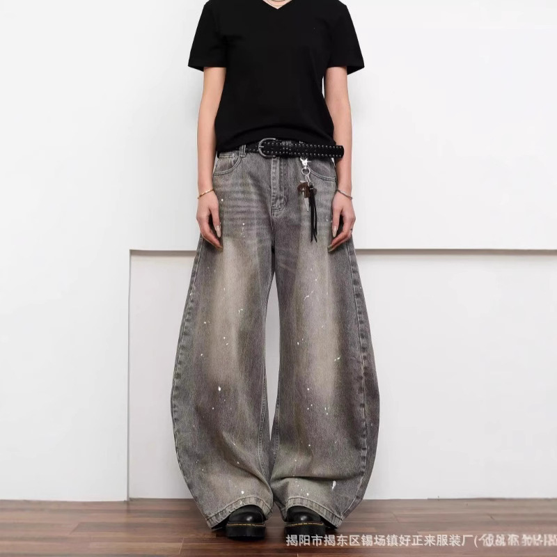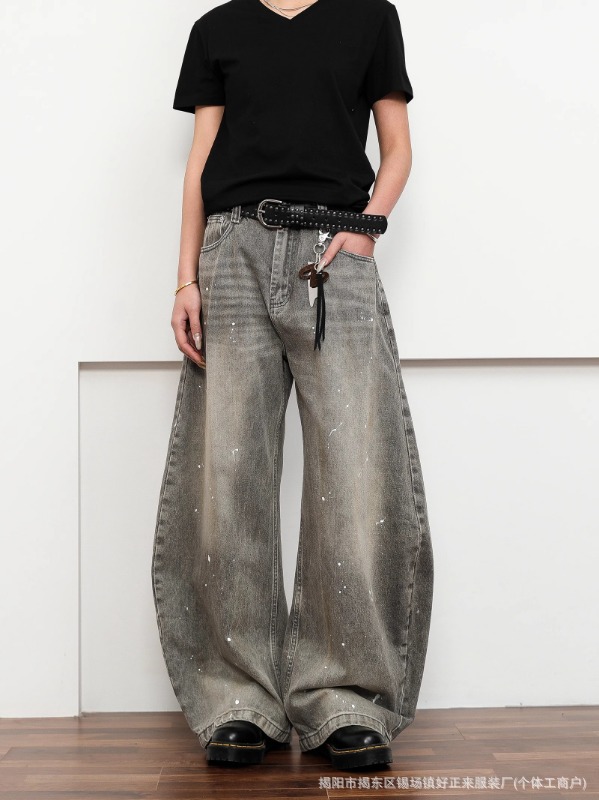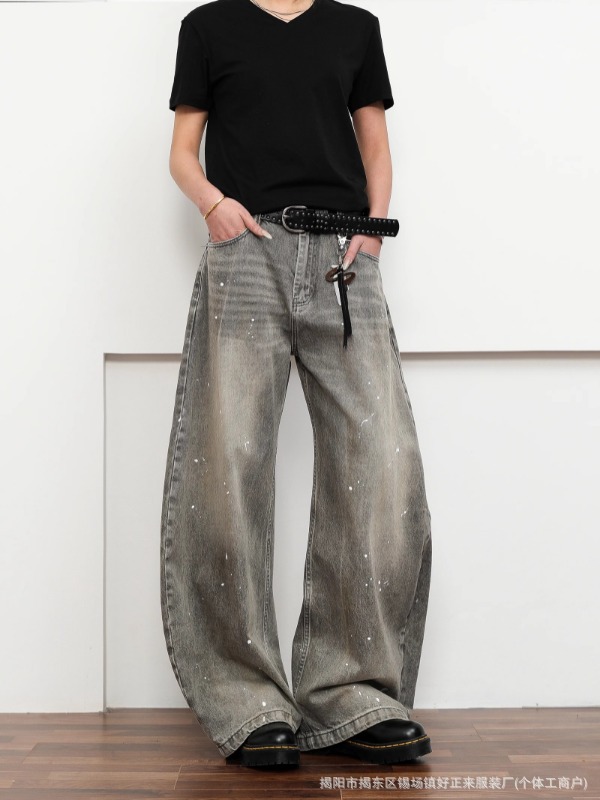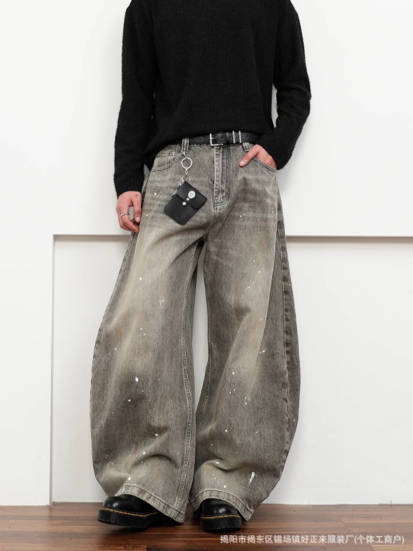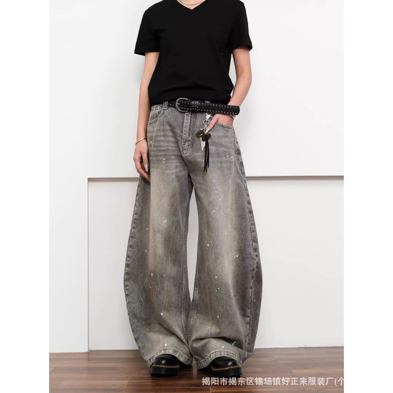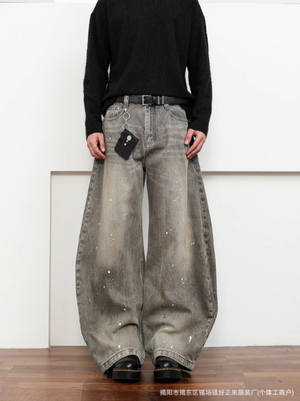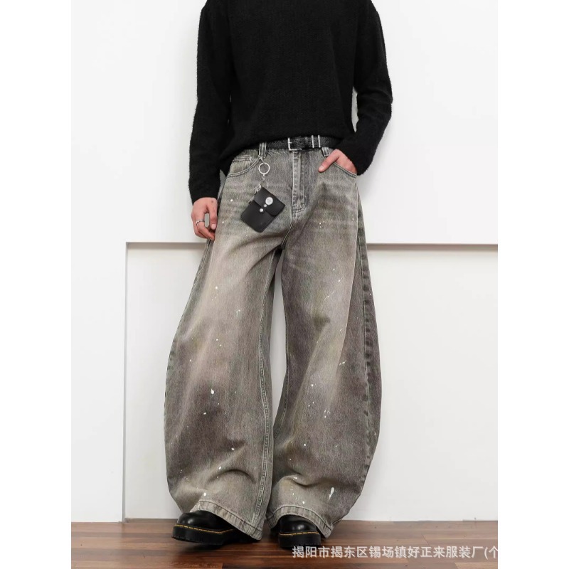 미국 스타일 빈티지 오래 된 회색 스플래시 잉크 시미 타르 청바지 트렌디 한 브랜드 스트리트 느슨한 넓은 다리 트렌디 한 바지 남성과 여성스토어 가기