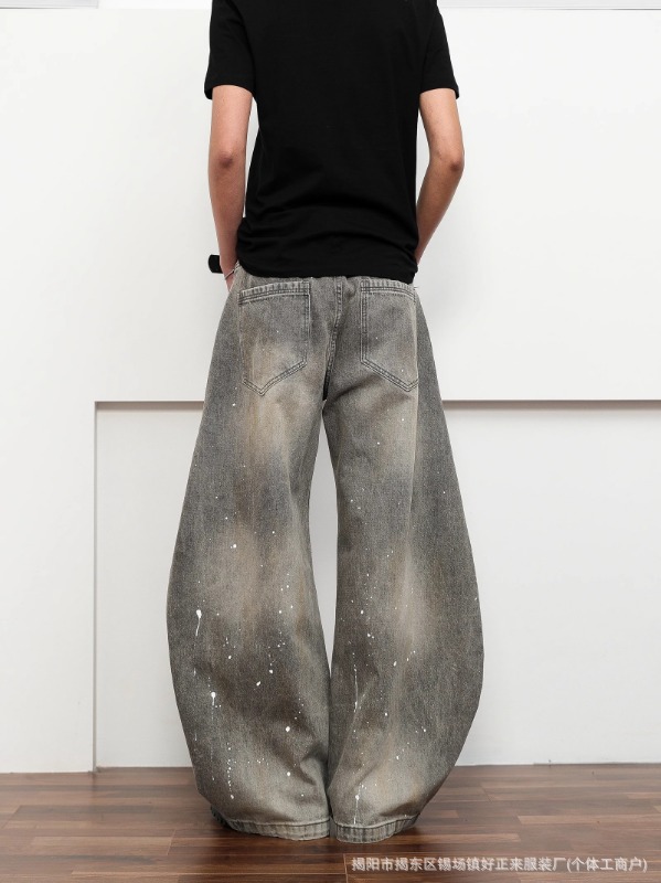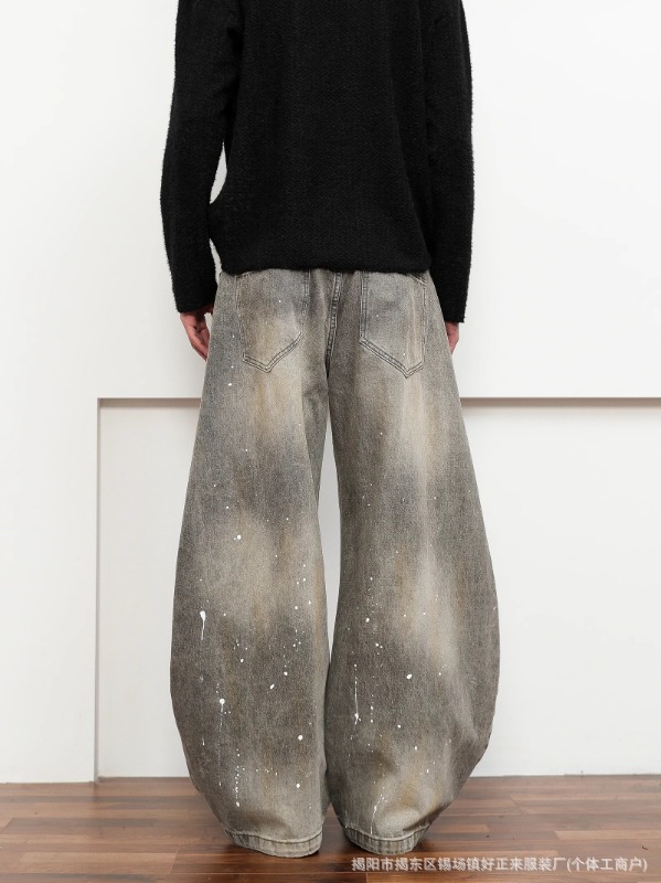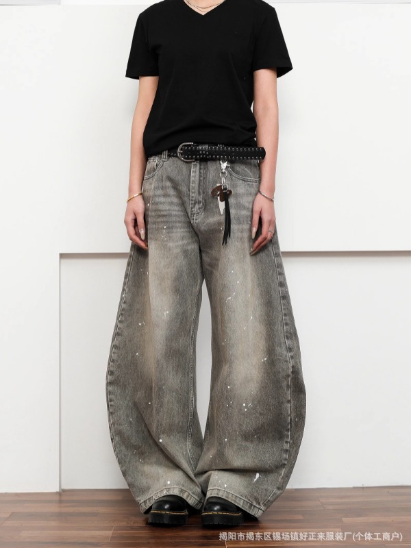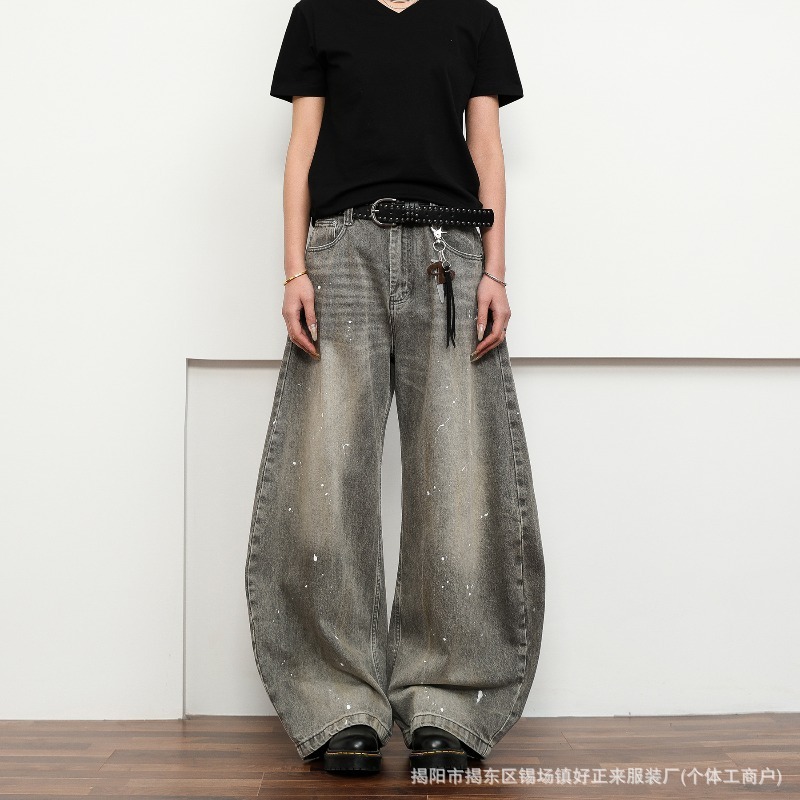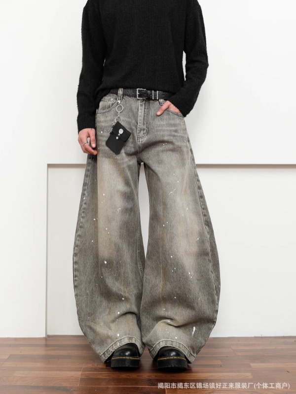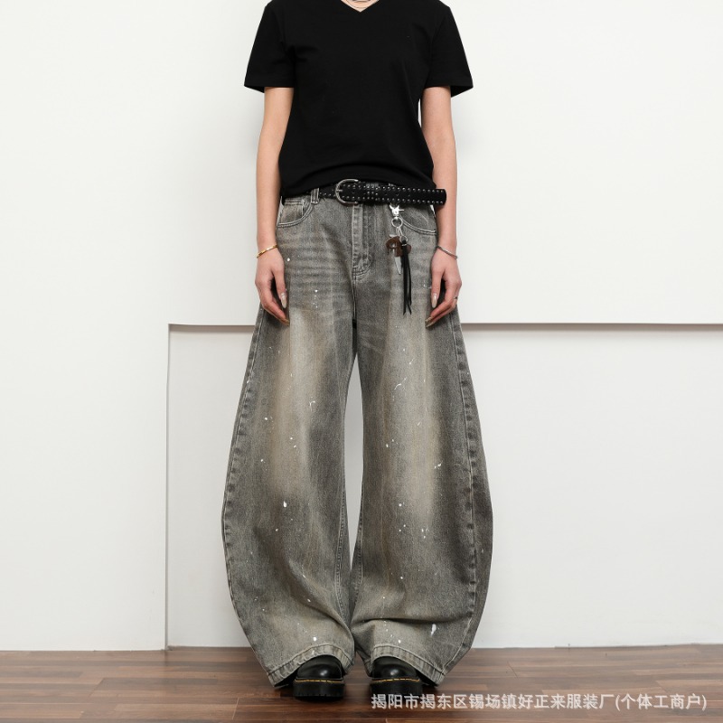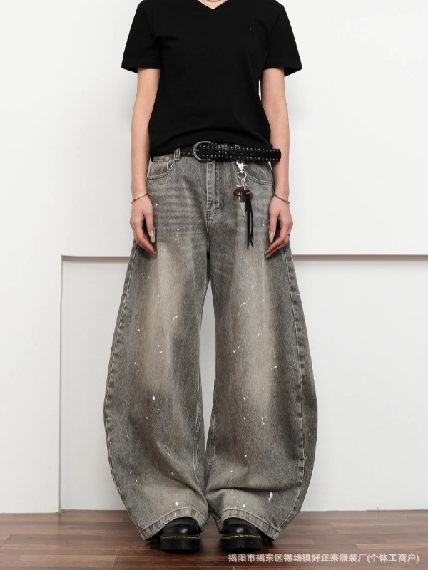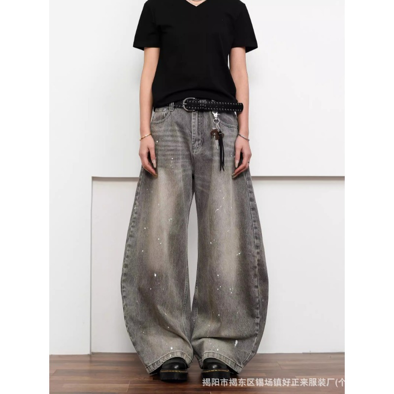 미국 스타일 빈티지 오래 된 회색 스플래시 잉크 시미 타르 청바지 트렌디 한 브랜드 스트리트 느슨한 넓은 다리 트렌디 한 바지 남성과 여성스토어 가기