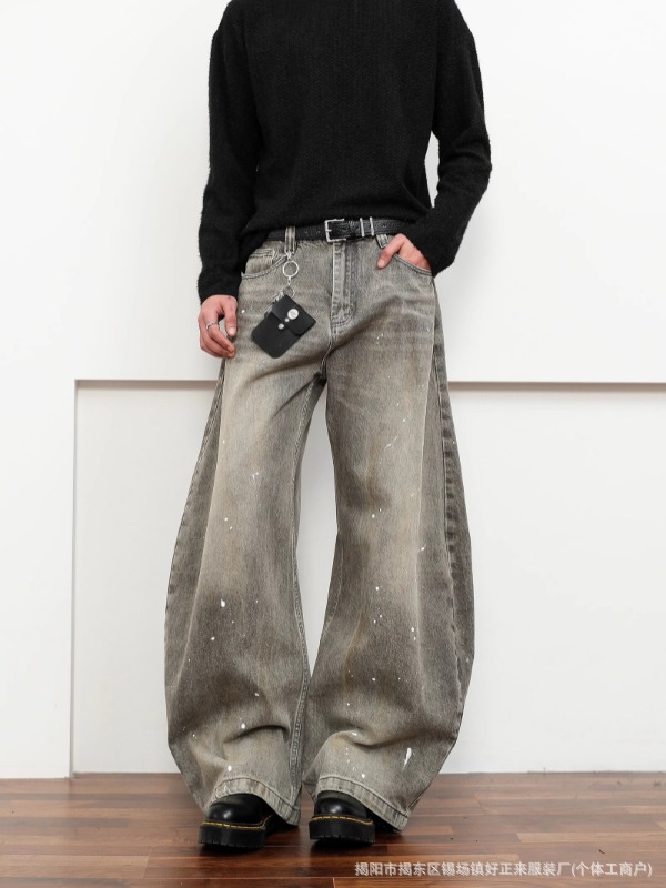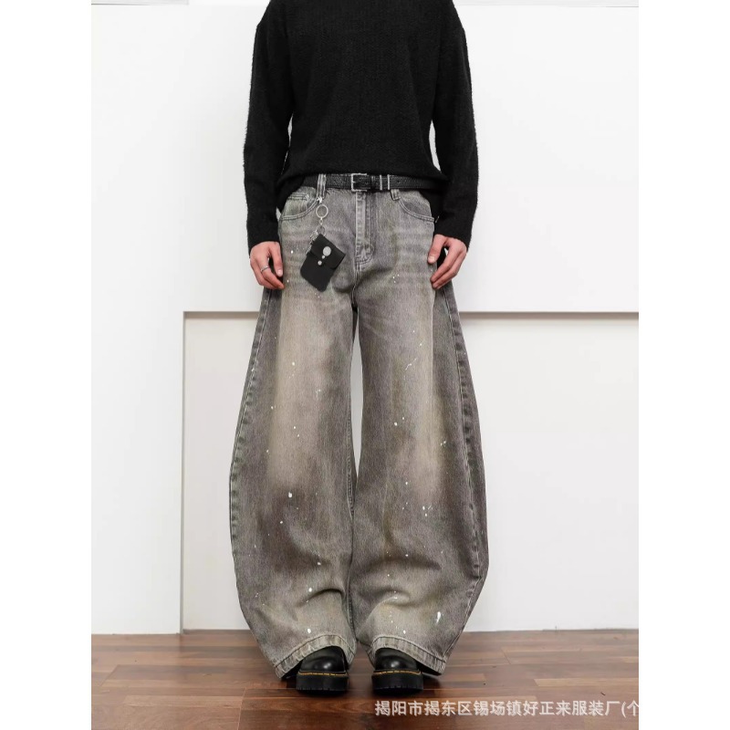 미국 스타일 빈티지 오래 된 회색 스플래시 잉크 시미 타르 청바지 트렌디 한 브랜드 스트리트 느슨한 넓은 다리 트렌디 한 바지 남성과 여성
