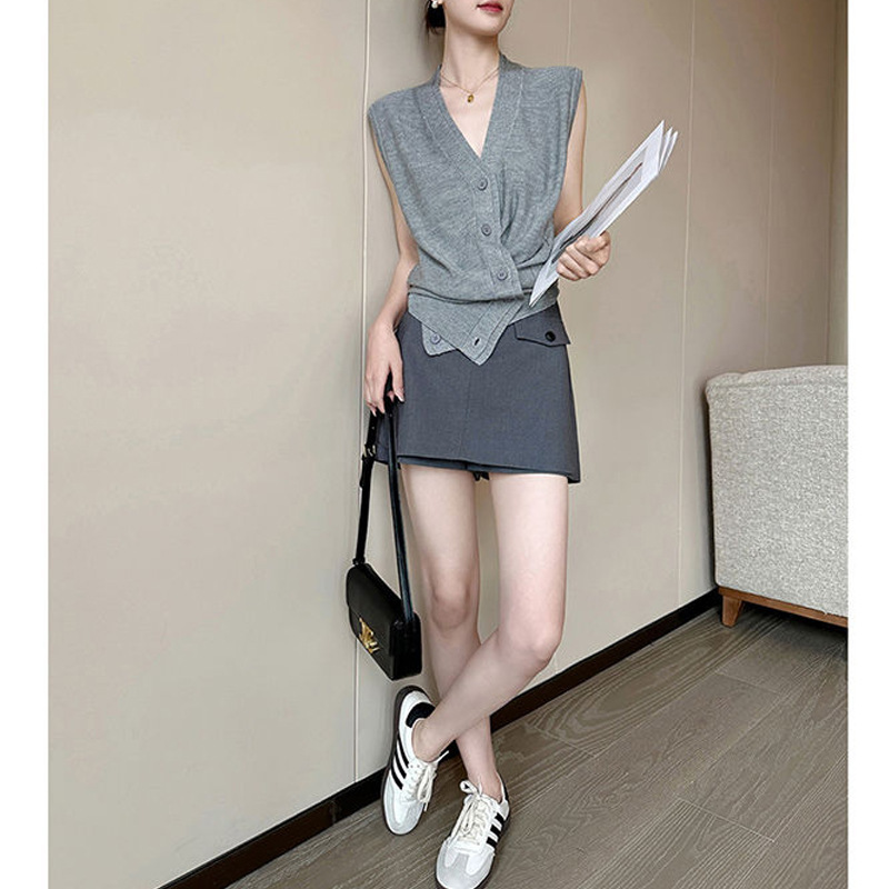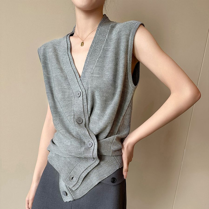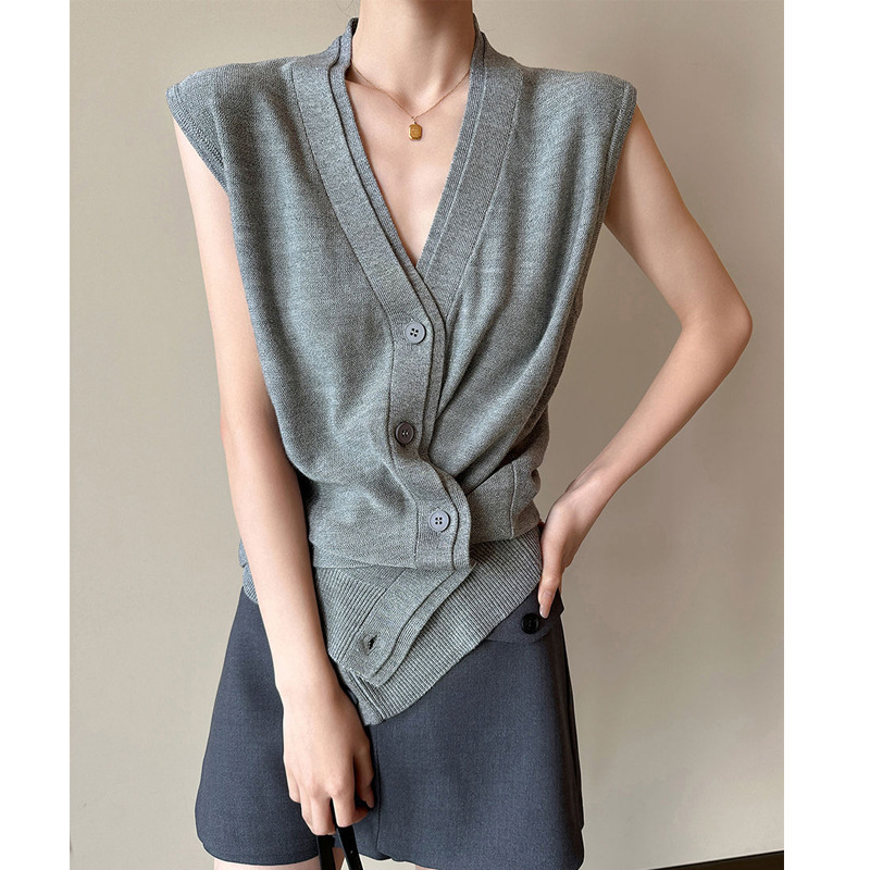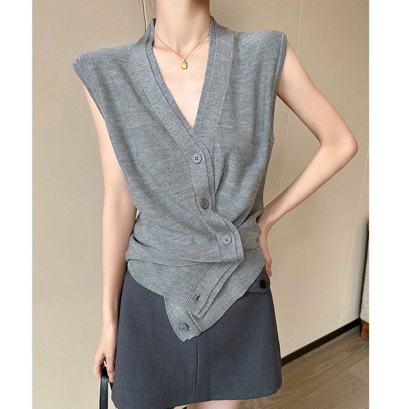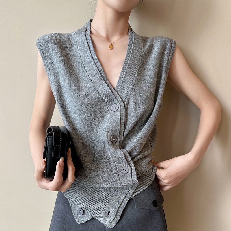 고급 그레이 V 넥 민소매 작은 조끼 여성 여름 디자인 센스 페이크 투피스 스택 올 매치 우아한 탑