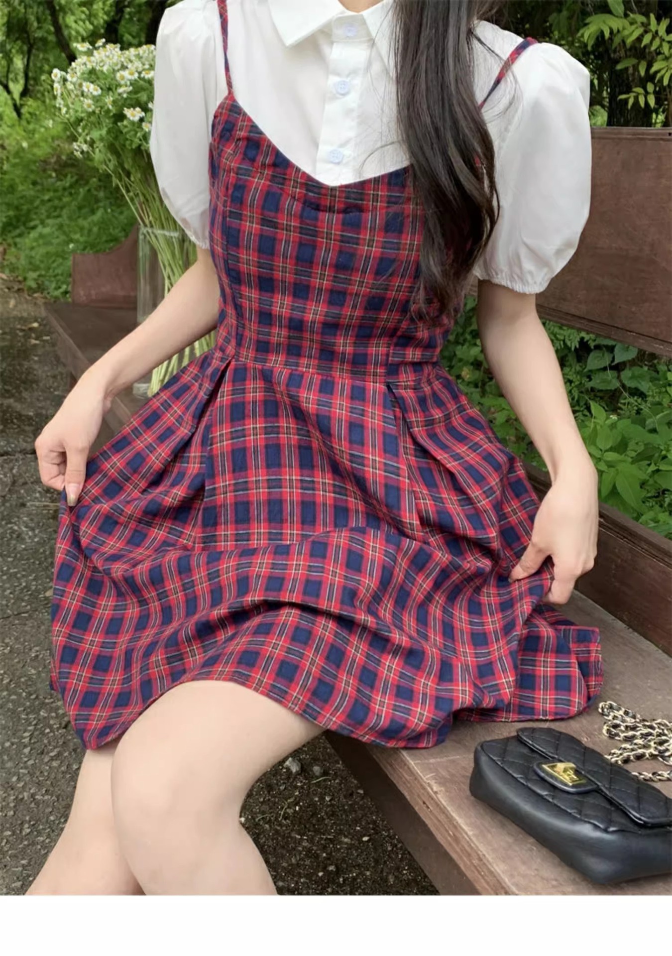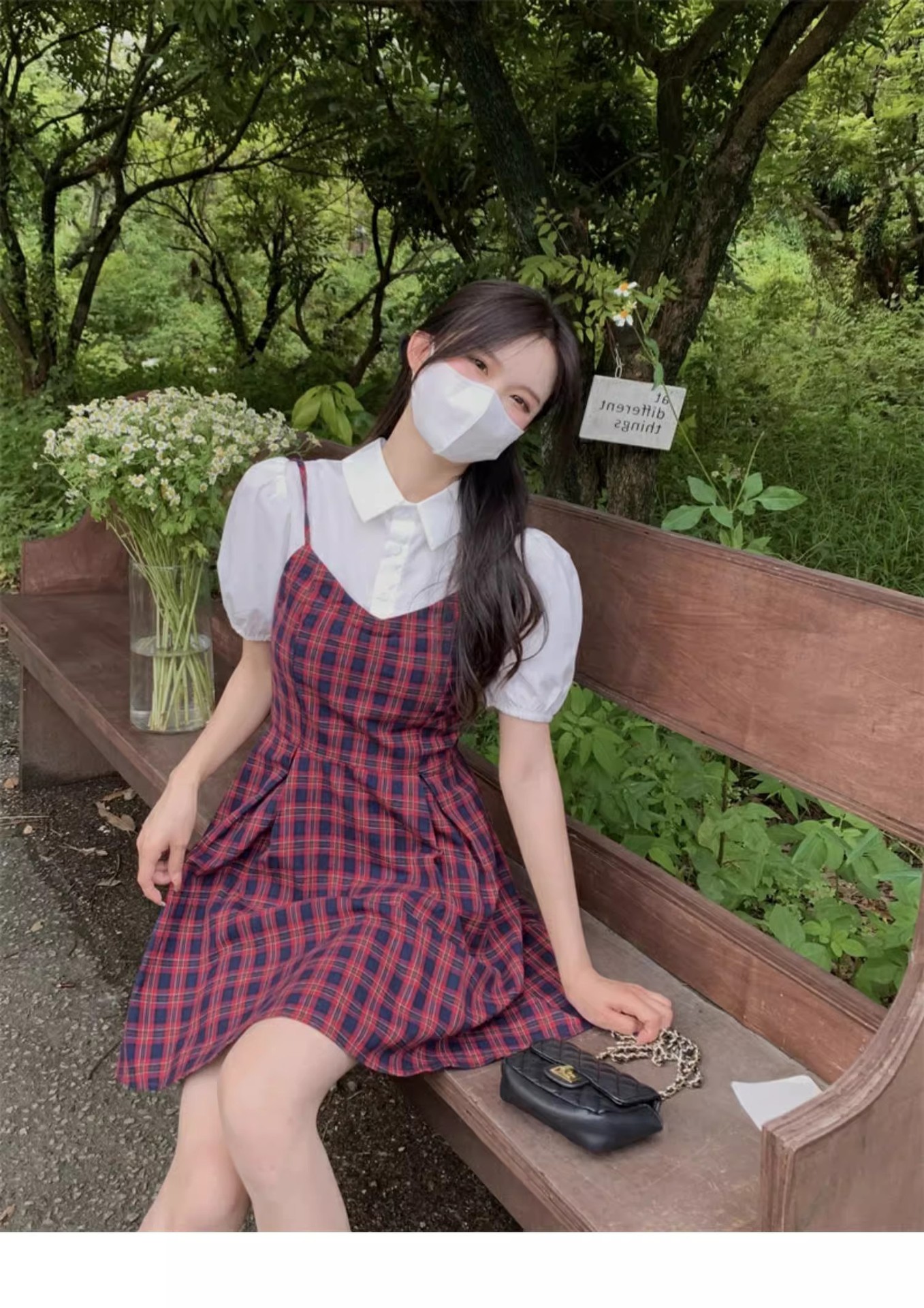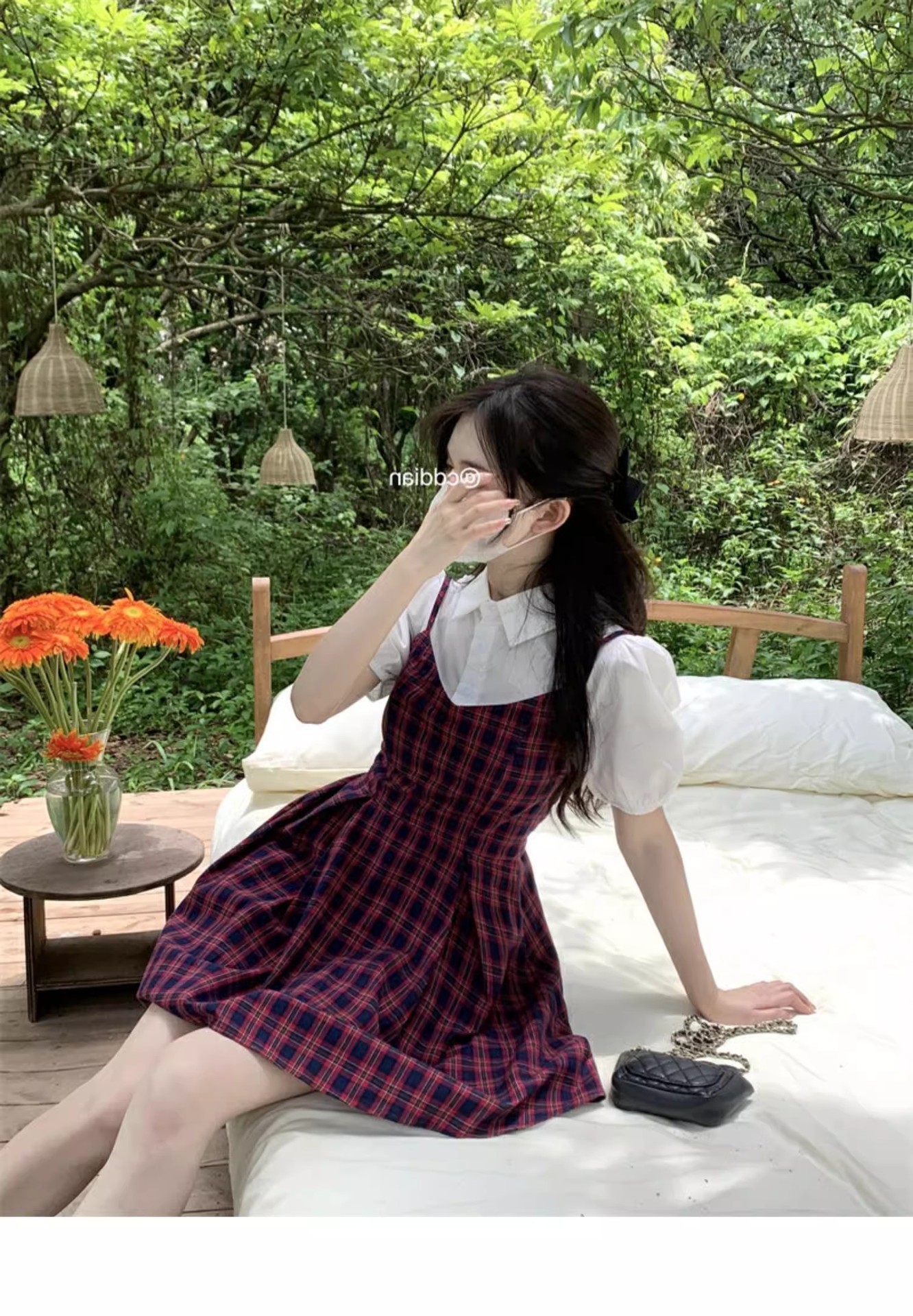대학 스타일의 버블 슬리브 원피스 여성 여름 질감 고급 우아한 허리 가짜 투피스 격자 무늬 스커트