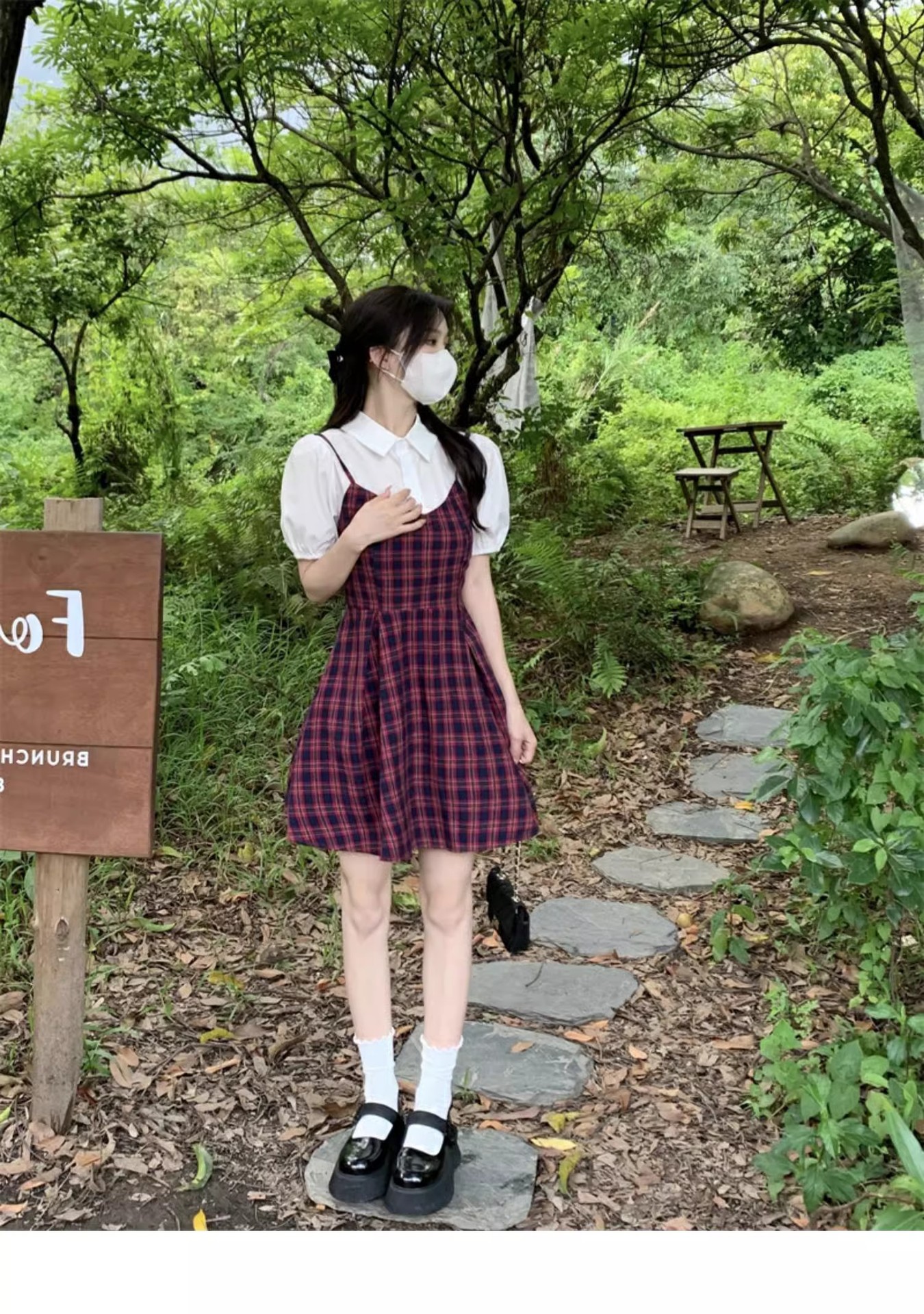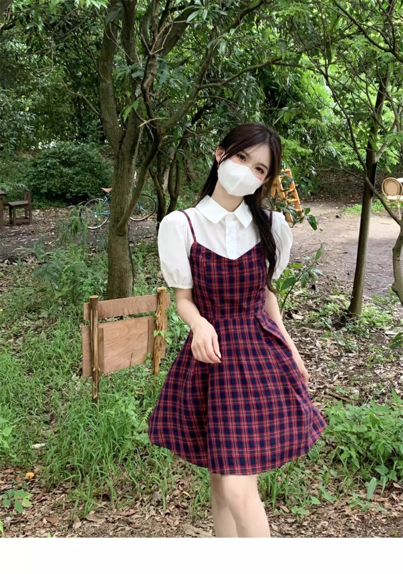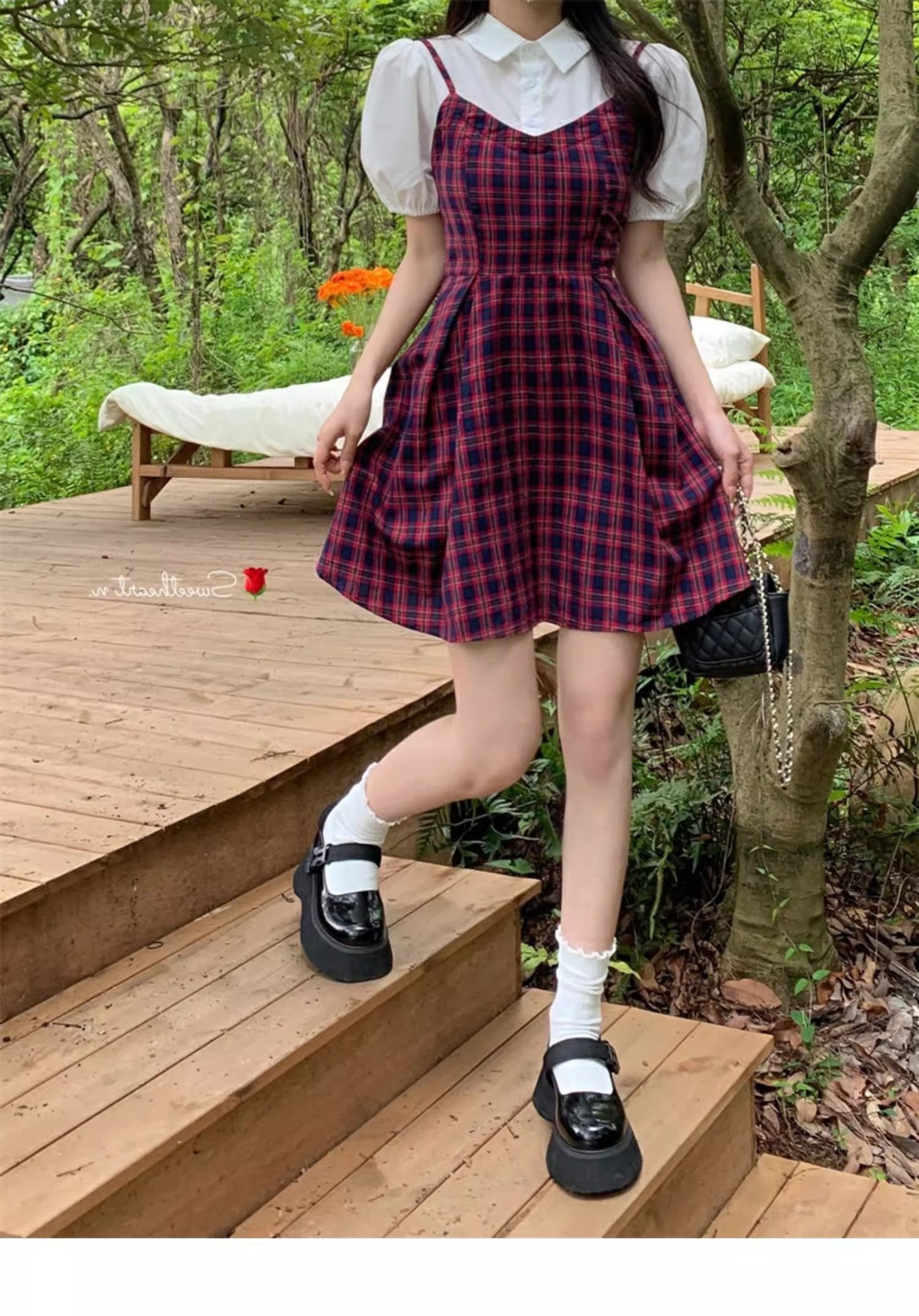 대학 스타일의 버블 슬리브 원피스 여성 여름 질감 고급 우아한 허리 가짜 투피스 격자 무늬 스커트
