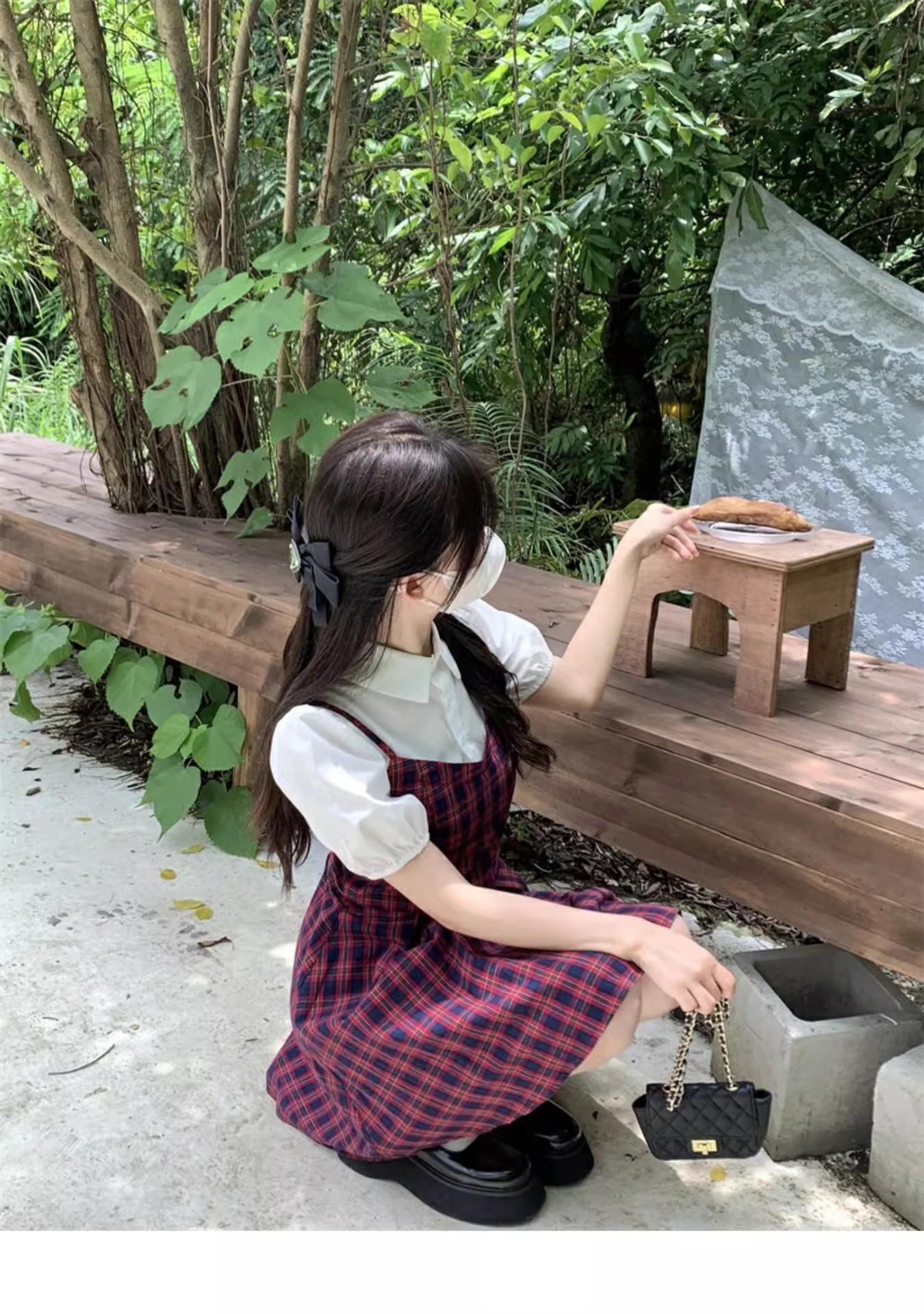 대학 스타일의 버블 슬리브 원피스 여성 여름 질감 고급 우아한 허리 가짜 투피스 격자 무늬 스커트스토어 가기