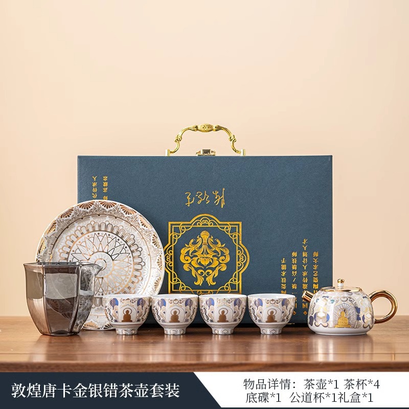 Chen Desheng Dunhuang 금박을 입힌 쿵푸 차 세트 세트 한 냄비 두 컵 티 포트 티 컵 고급 집들이 생일 선물스토어 가기