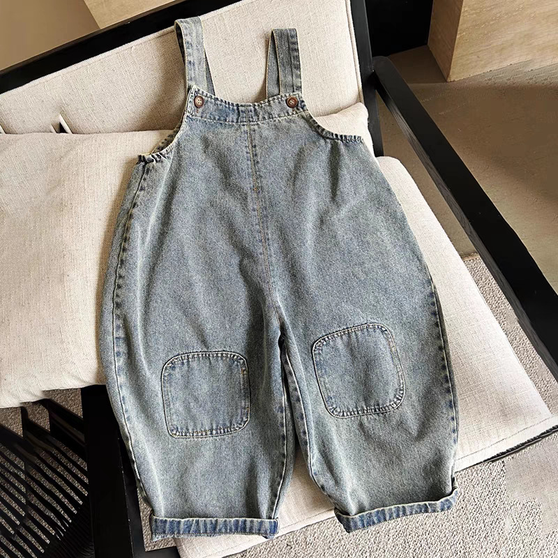 봄과 가을 여성 아동복 스트래피 바지 아기 세련된 어린이 독특한 유행 한국 스타일 유행 루즈 레트로 패치 청바지스토어 가기