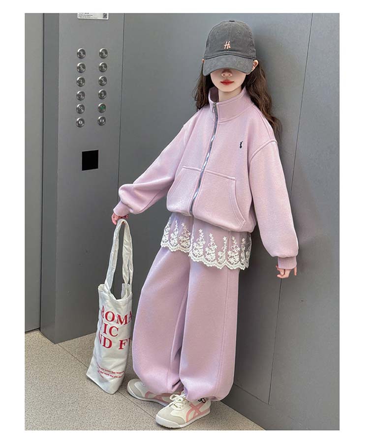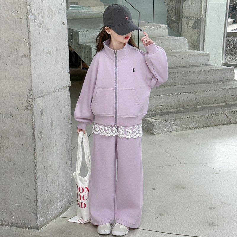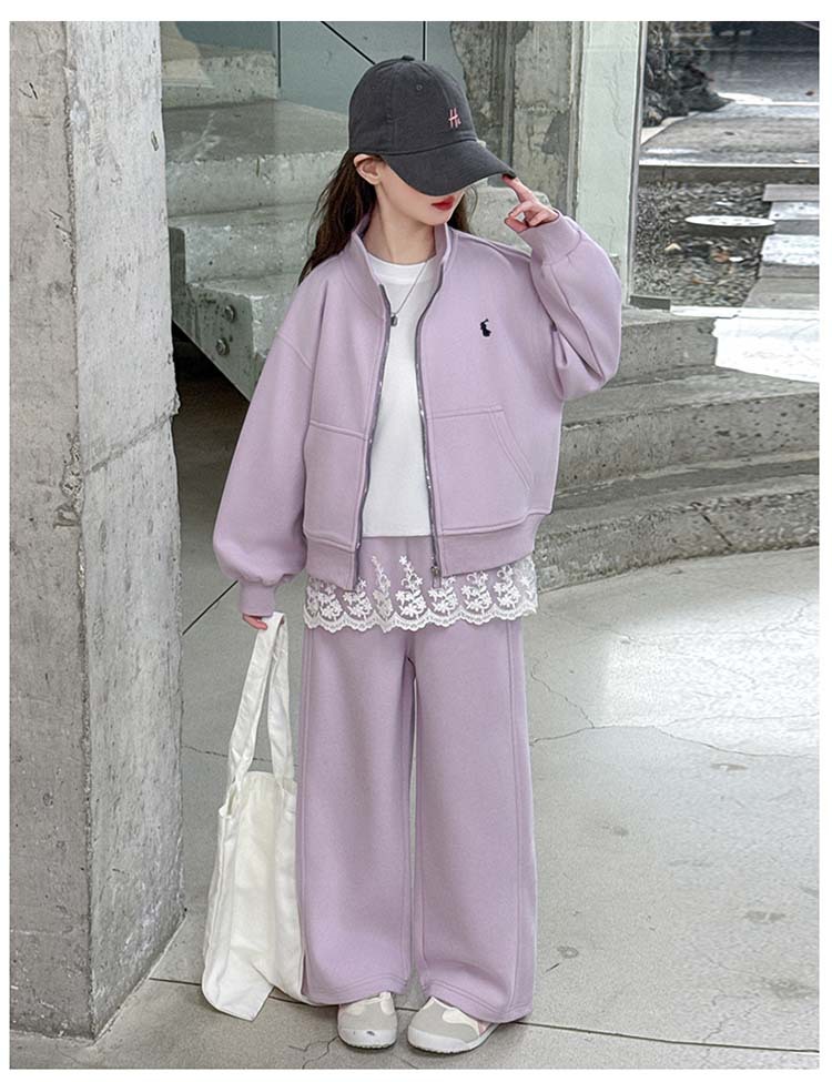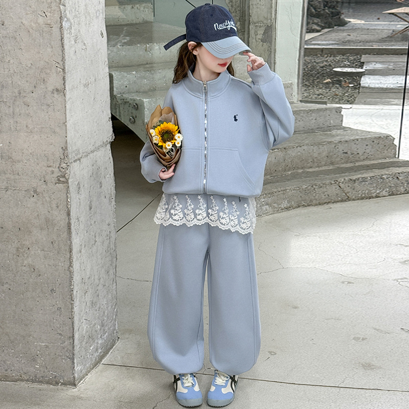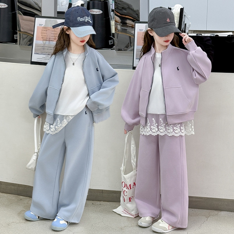 소녀의 봄과 가을 세트 2025 새로운 어린이 스포츠 자수 지퍼 자켓베이스 셔츠 캐주얼 바지 3 피스 세트