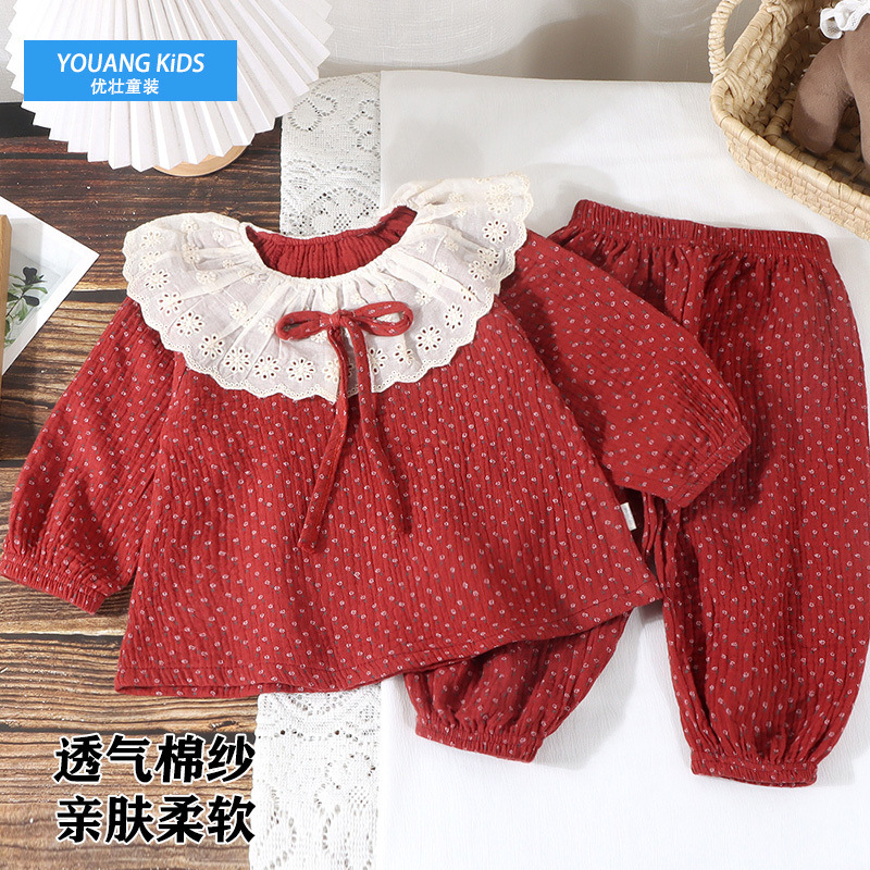여자 면 원사 잠옷 어린이 봄과 여름 순면 레이스 홈 옷 여성의 보물 얇은 더블 거즈 달콤한 속옷 가을