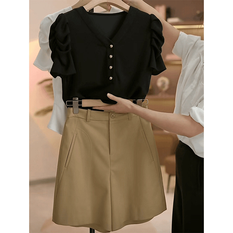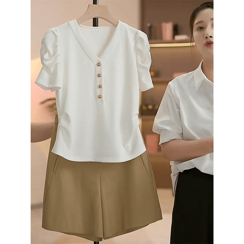 여름 세트 여성 2025 새로운 세련된 패션 반팔 티셔츠 슬리밍 올 매치 캐주얼 와이드 레그 반바지 투피스 세트