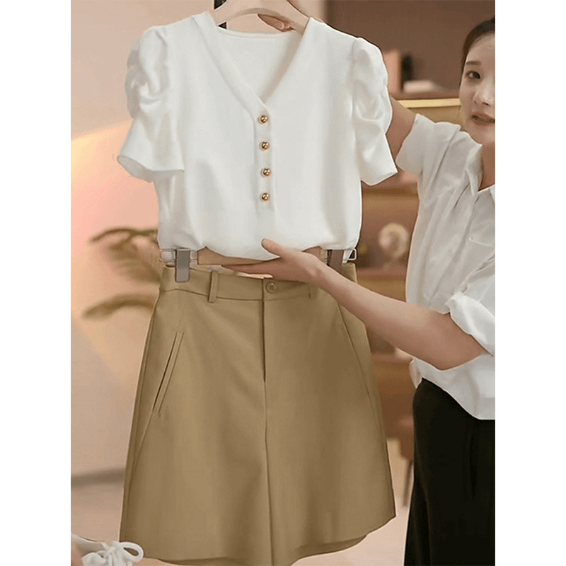 여름 세트 여성 2025 새로운 세련된 패션 반팔 티셔츠 슬리밍 올 매치 캐주얼 와이드 레그 반바지 투피스 세트스토어 가기