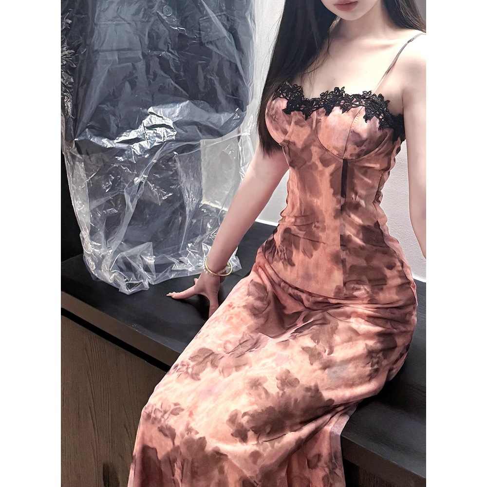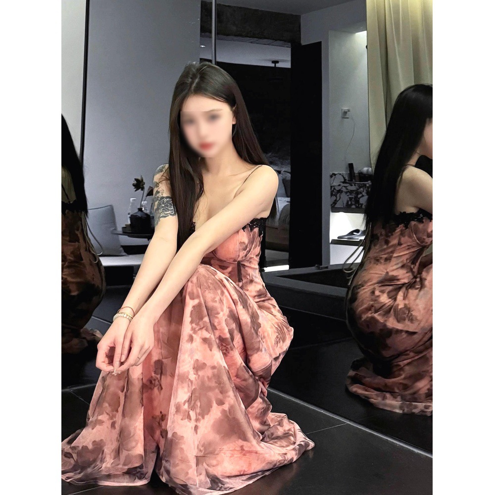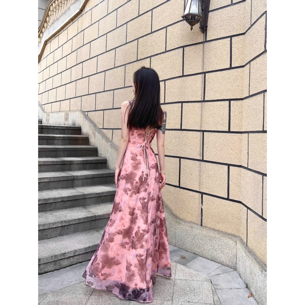 여름 스파이스 소녀 아름다운 슬링 원피스 가슴 패드 우아한 고귀한 타이트 허리 슬리밍 홀리데이 스타일 꽃 긴 원피스