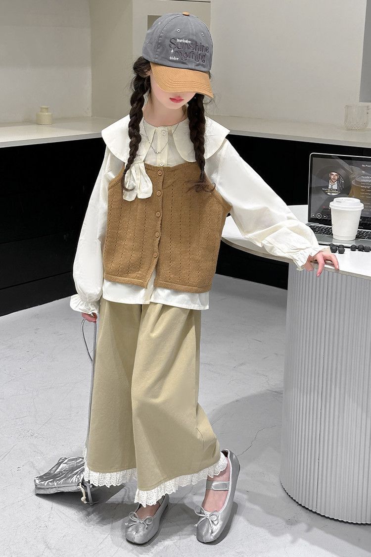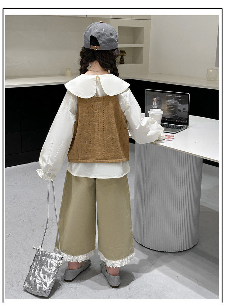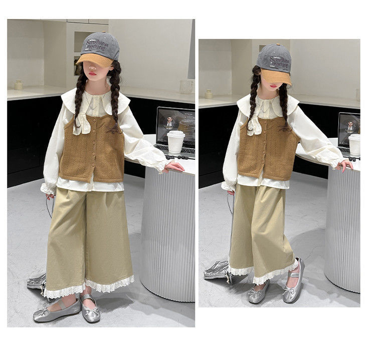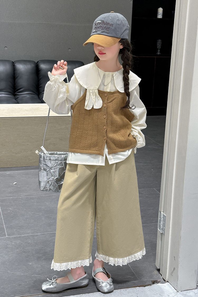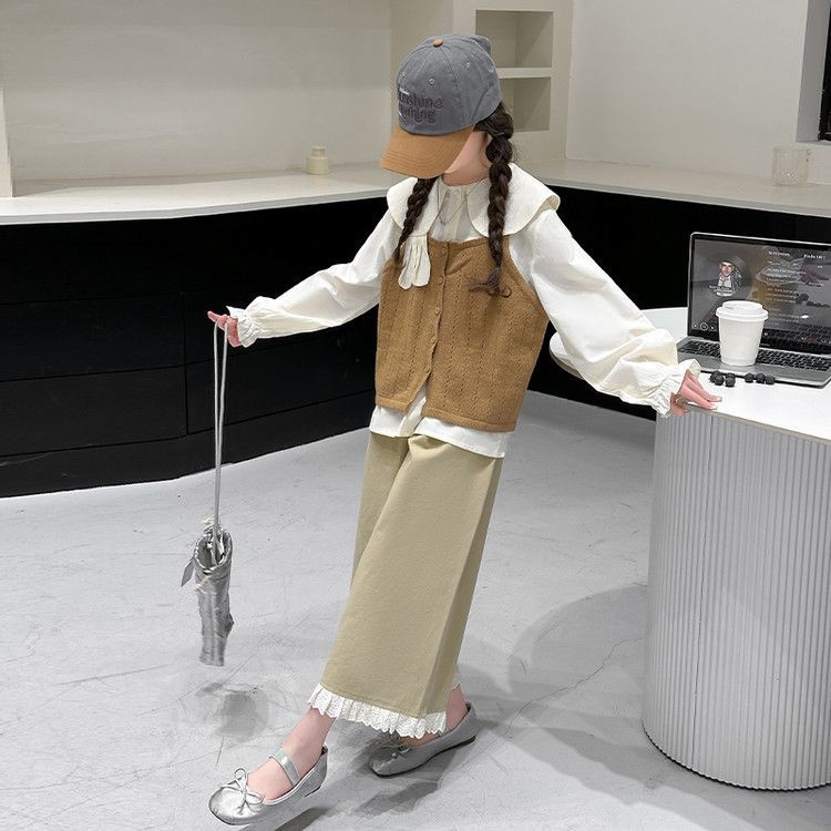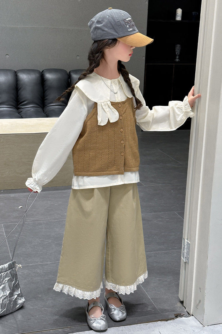 소녀의 봄 세트 2025 새로운 어린이 서양식 인형 칼라 셔츠 소녀 조끼 넓은 다리 바지 3 조각 세트