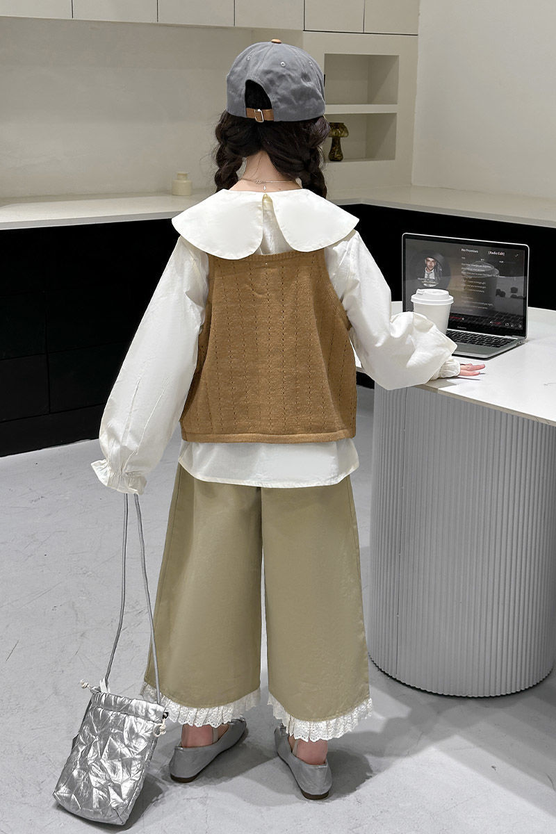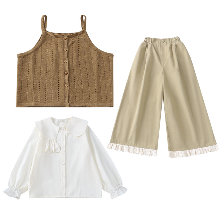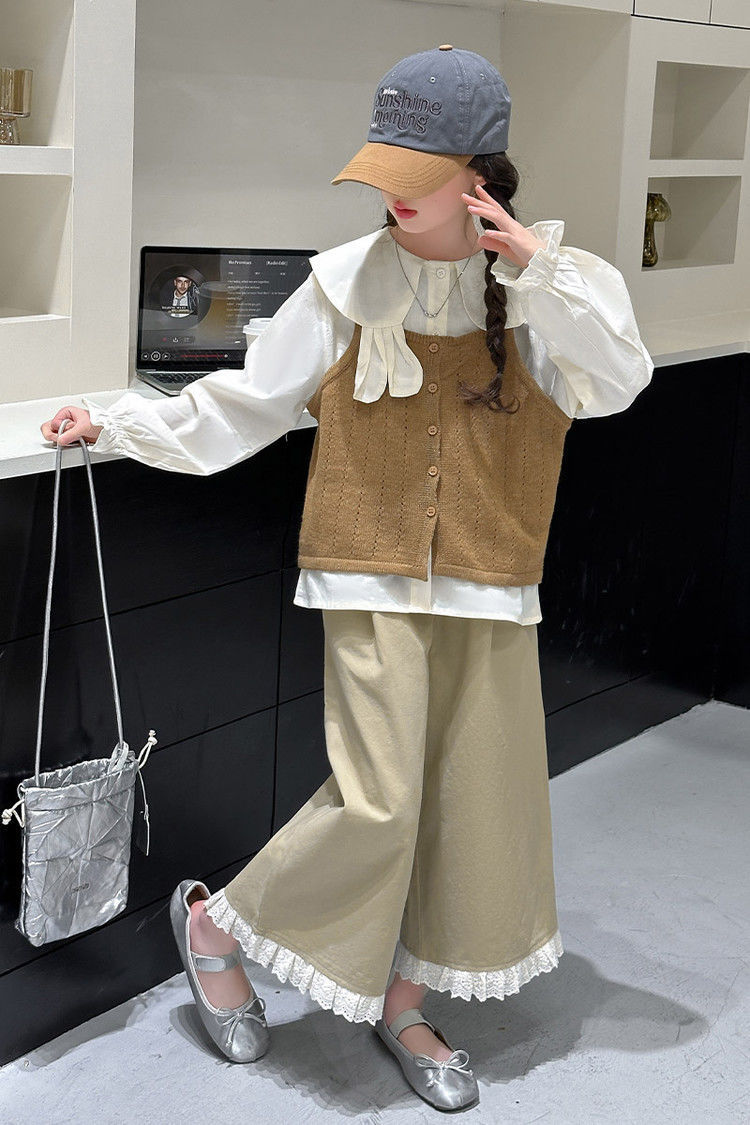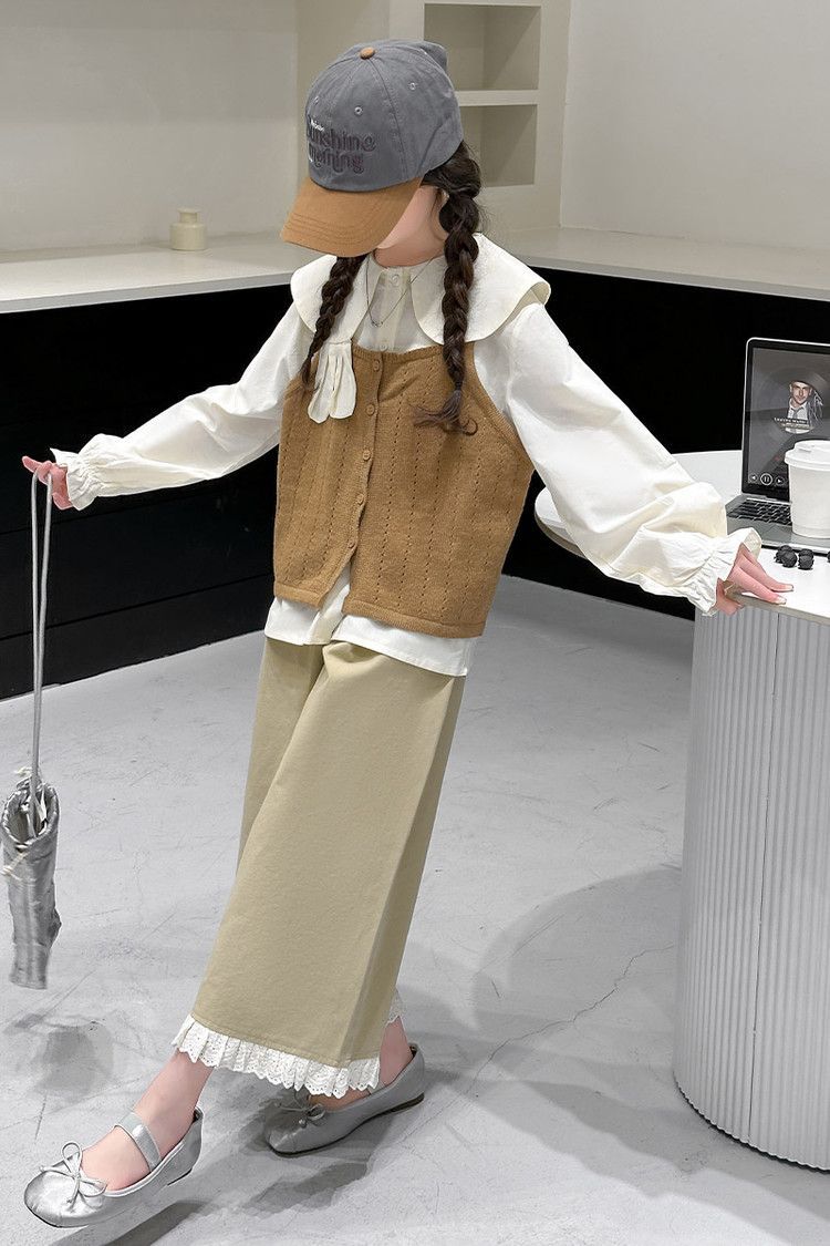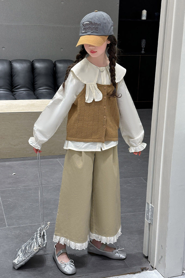 소녀의 봄 세트 2025 새로운 어린이 서양식 인형 칼라 셔츠 소녀 조끼 넓은 다리 바지 3 조각 세트