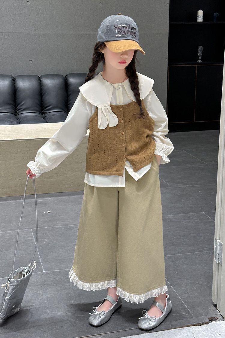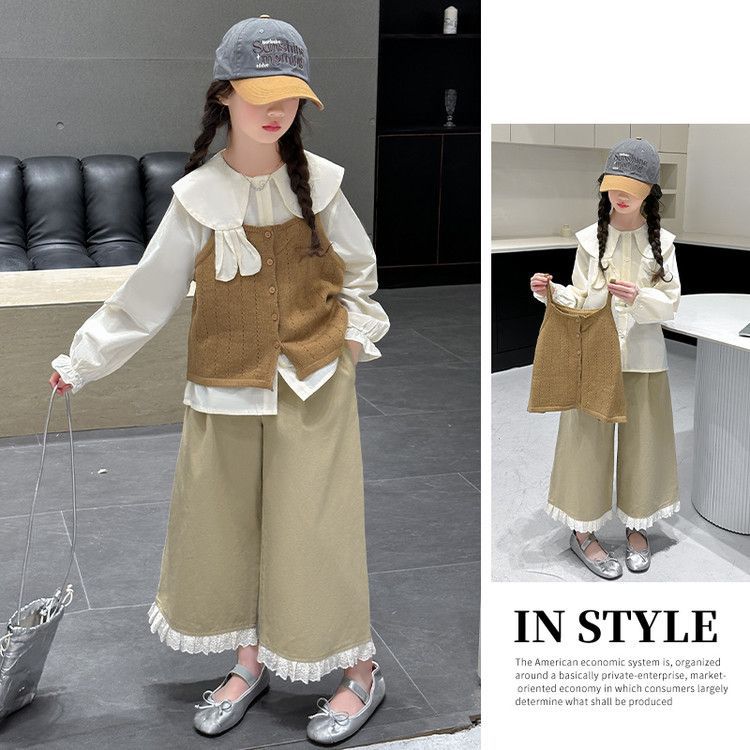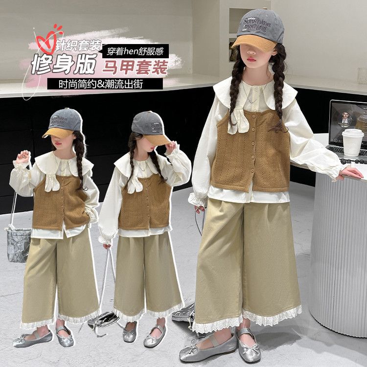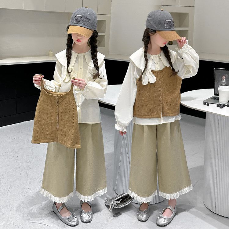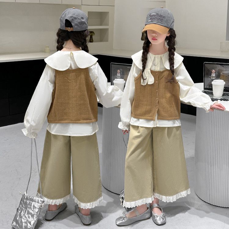 소녀의 봄 세트 2025 새로운 어린이 서양식 인형 칼라 셔츠 소녀 조끼 넓은 다리 바지 3 조각 세트스토어 가기