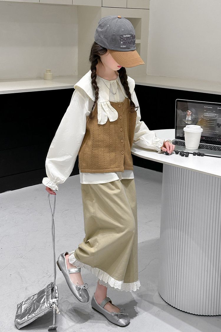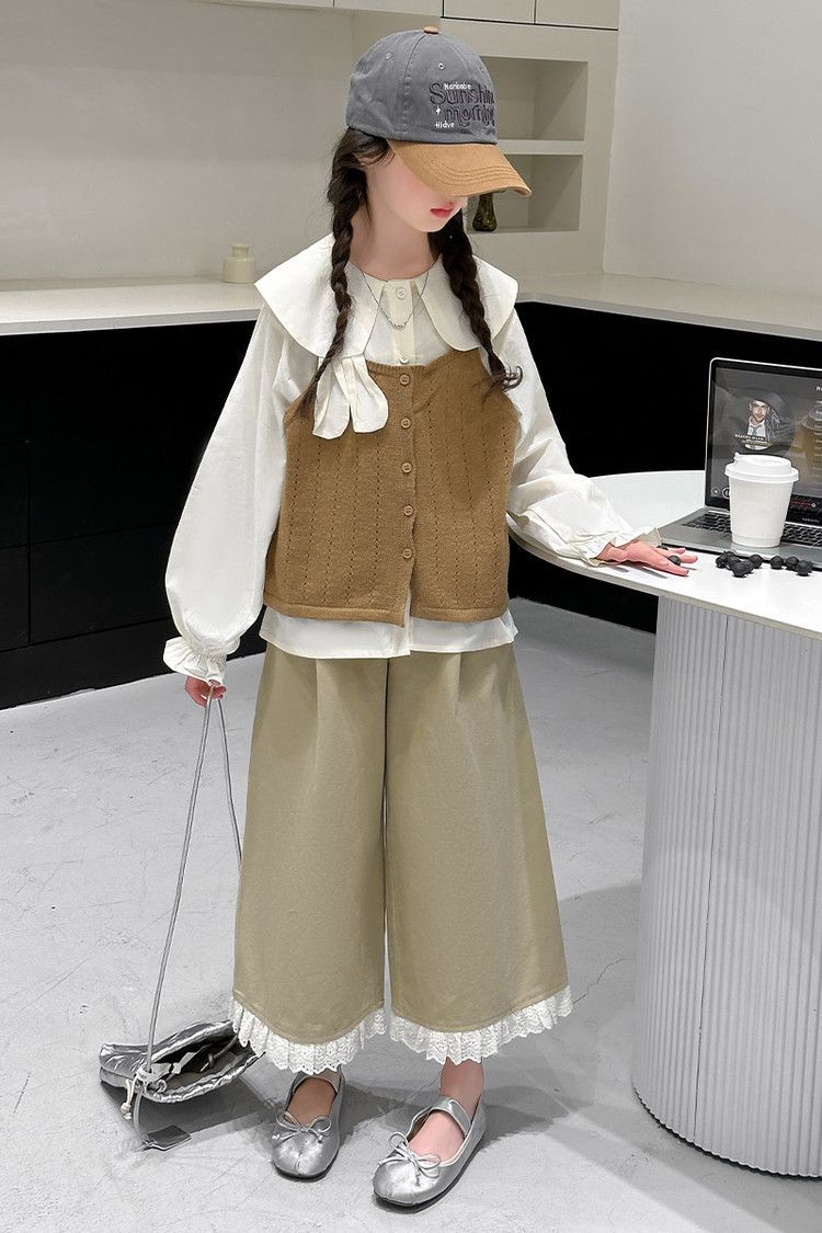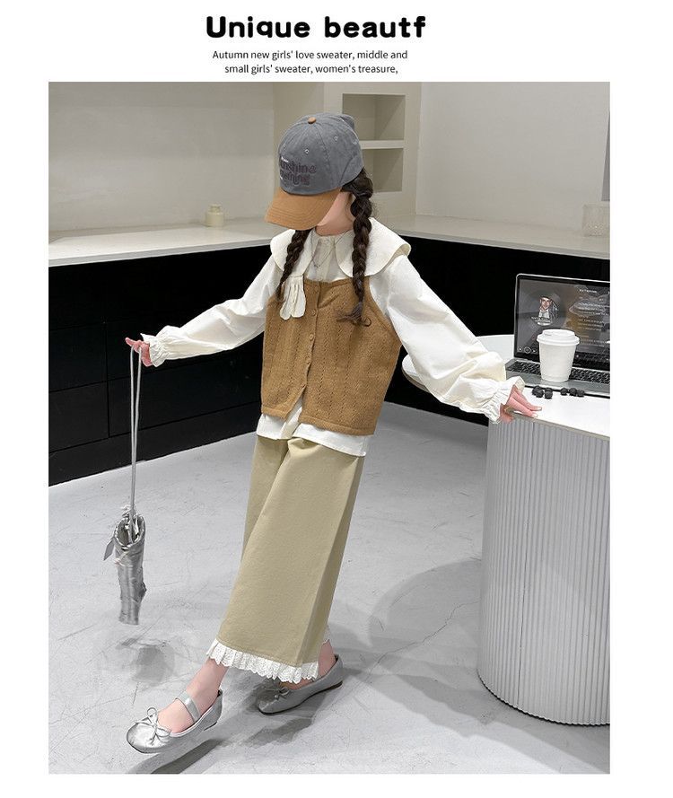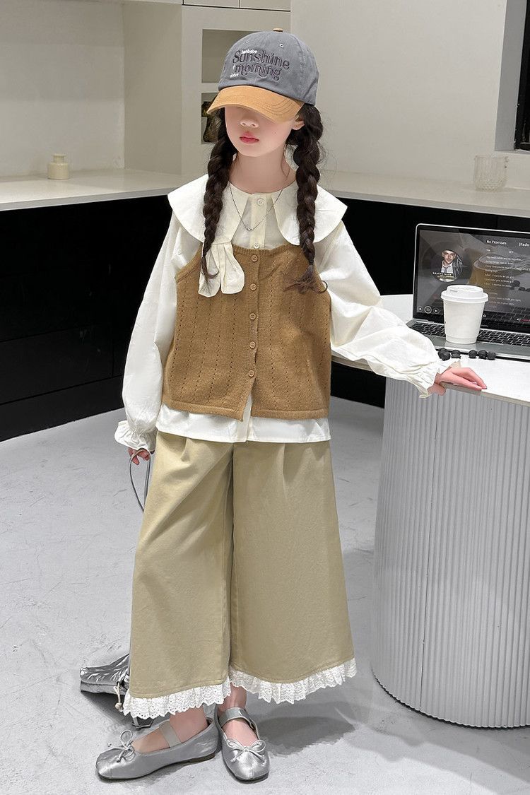 소녀의 봄 세트 2025 새로운 어린이 서양식 인형 칼라 셔츠 소녀 조끼 넓은 다리 바지 3 조각 세트스토어 가기