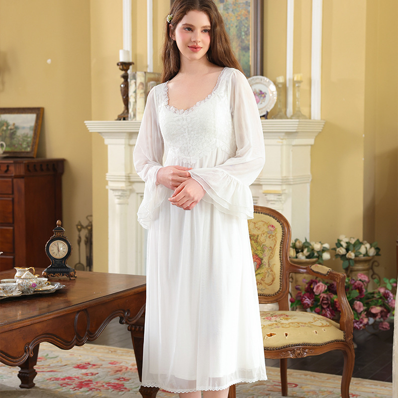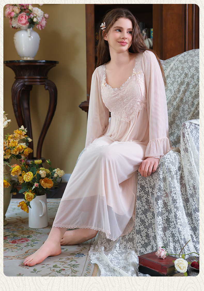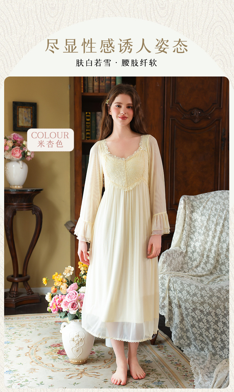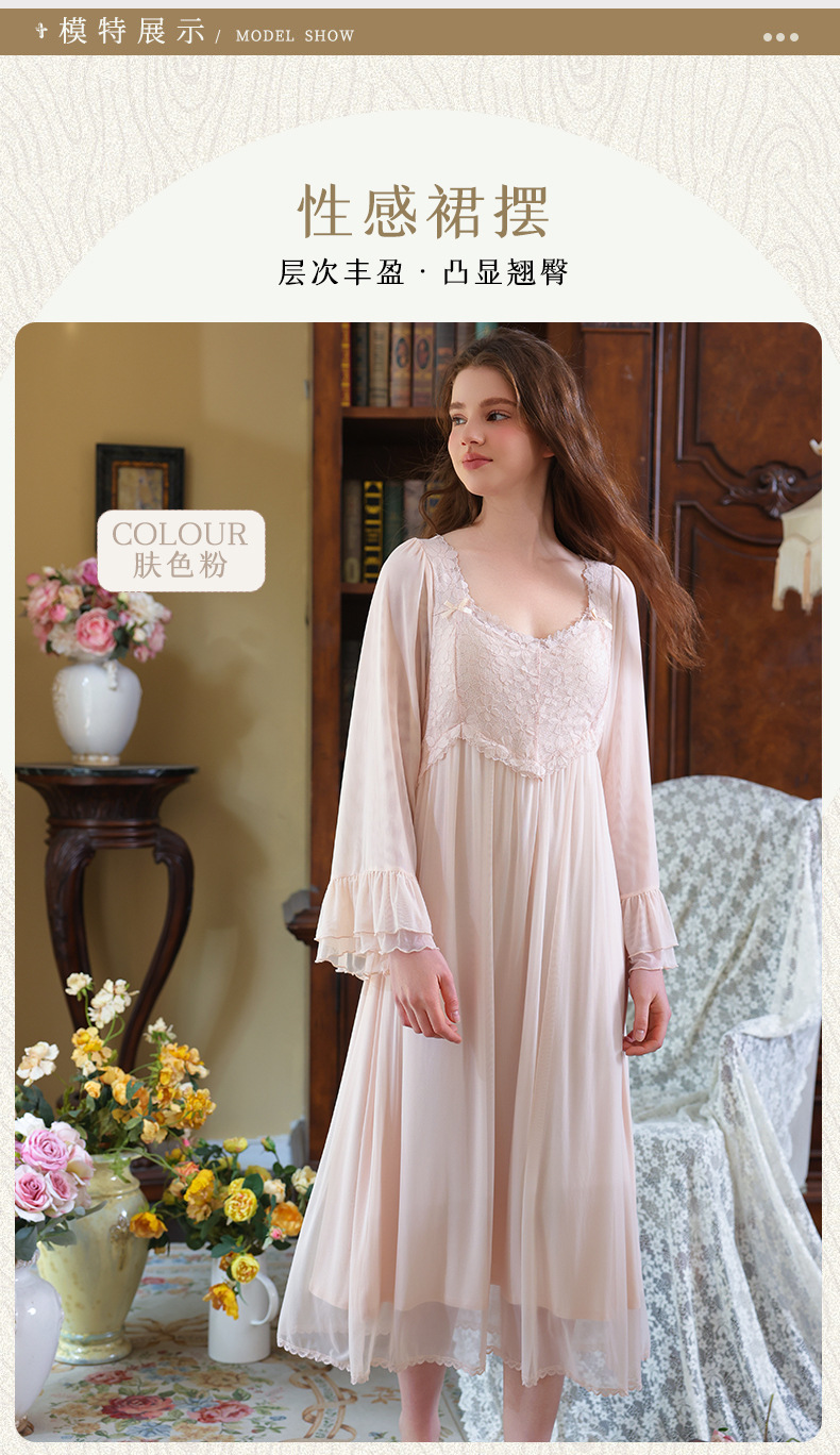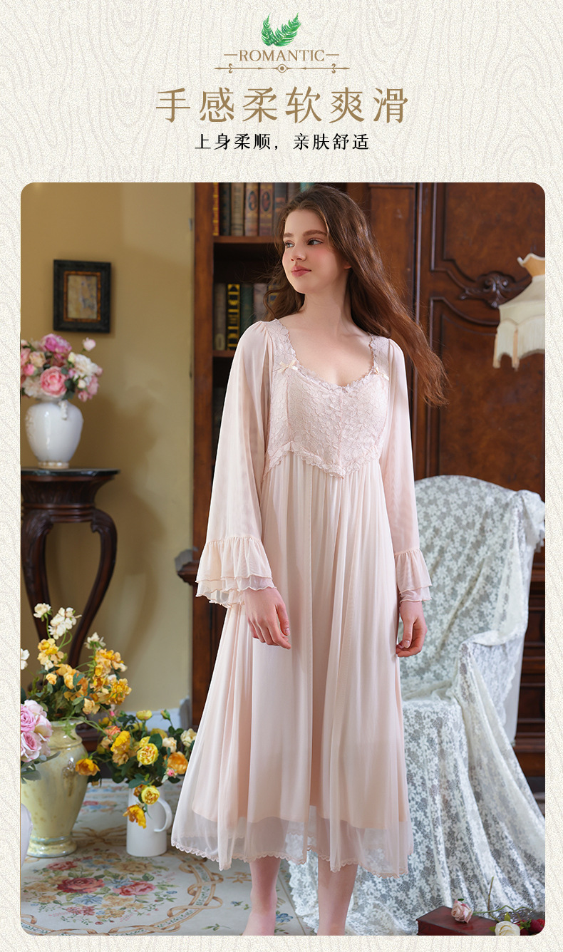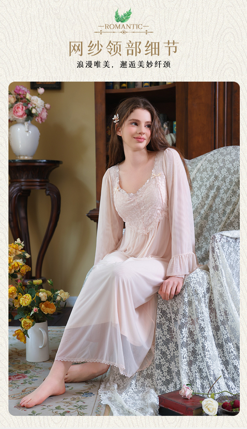 프렌치 스타일 잠옷 봄 가을 여성용 긴 소매 레이스 섹시한 순수한 매력 궁전 스타일 여성용 긴 잠옷 가슴 패드 포함