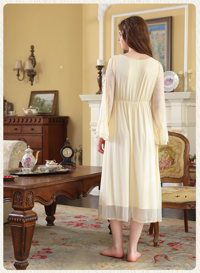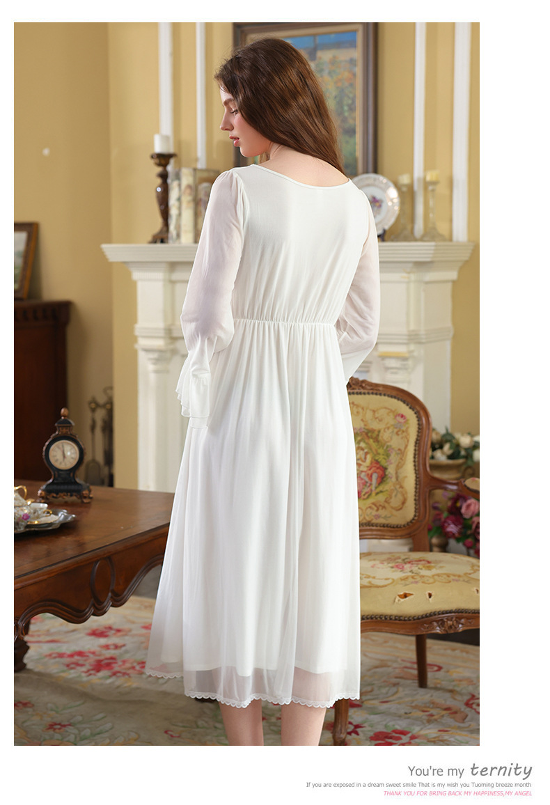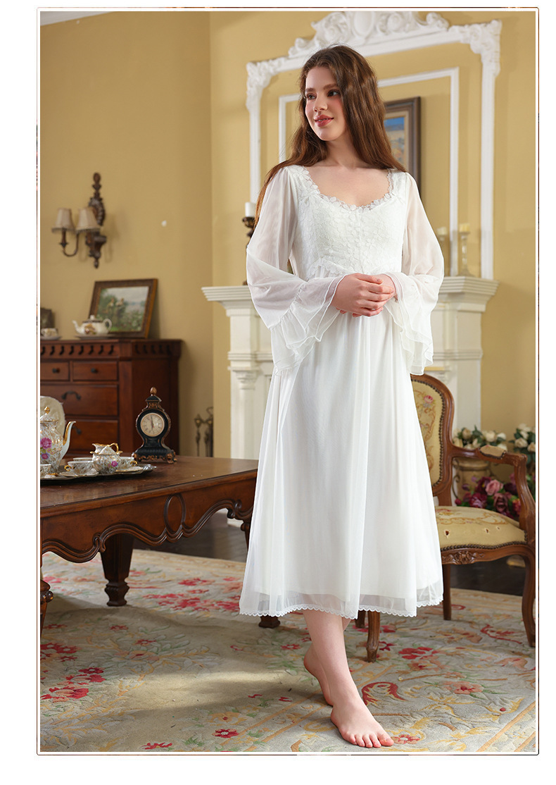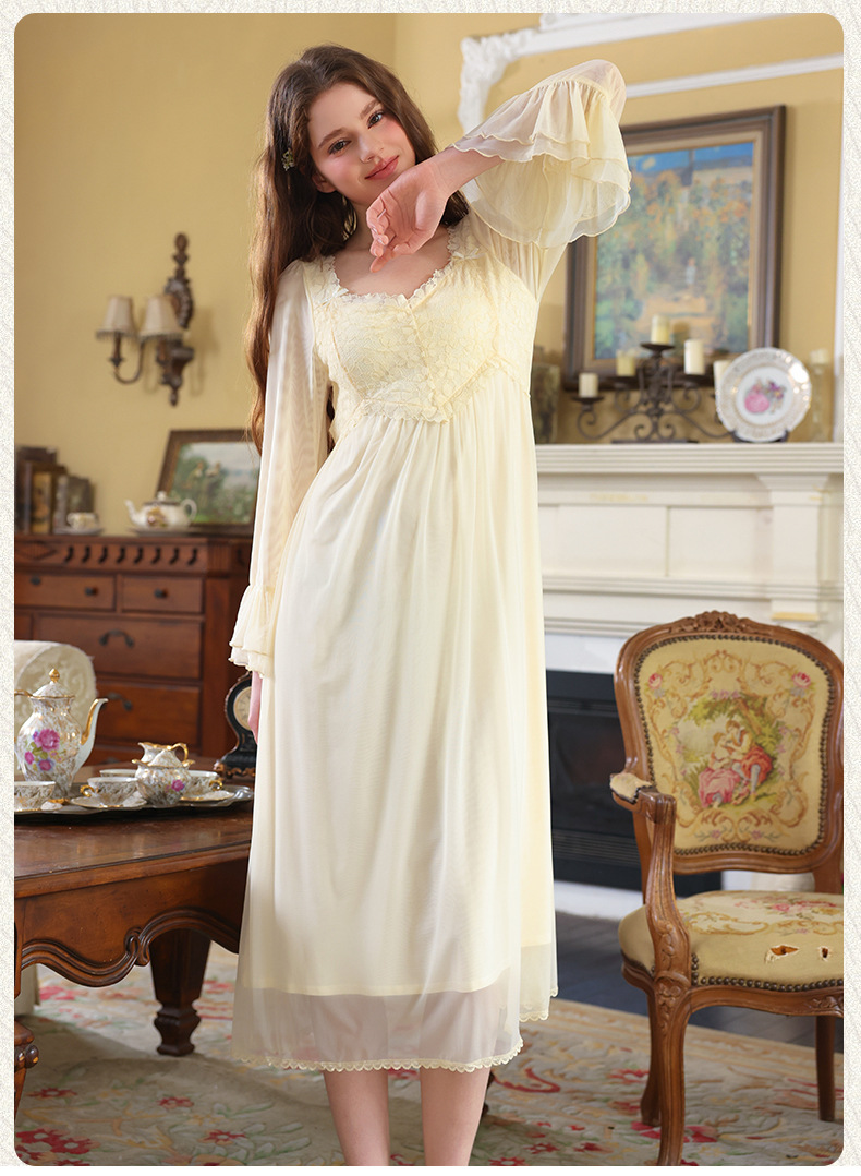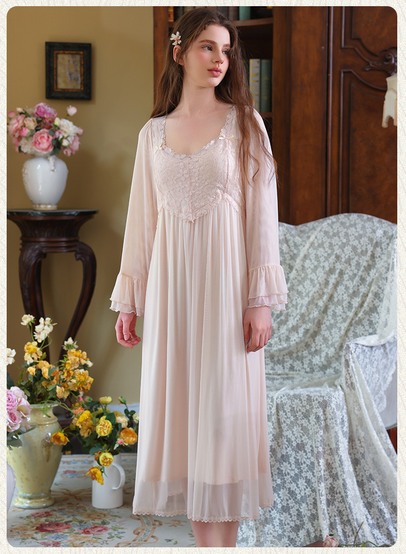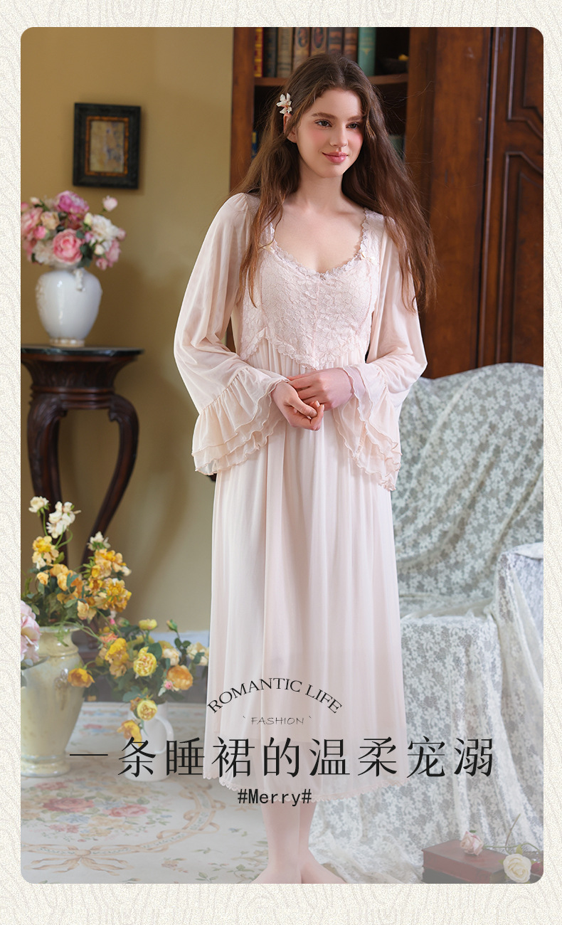 프렌치 스타일 잠옷 봄 가을 여성용 긴 소매 레이스 섹시한 순수한 매력 궁전 스타일 여성용 긴 잠옷 가슴 패드 포함