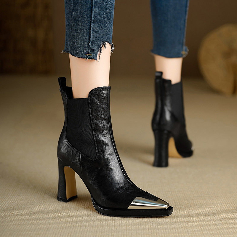 우아한 금속 머리 두꺼운 힐 마틴 부츠 여성의 2025 가을과 겨울 새로운 포인팅 된 중간 부츠 하이힐 스트레치 부츠스토어 가기