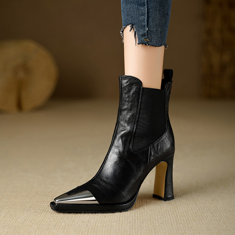 우아한 금속 머리 두꺼운 힐 마틴 부츠 여성의 2025 가을과 겨울 새로운 포인팅 된 중간 부츠 하이힐 스트레치 부츠