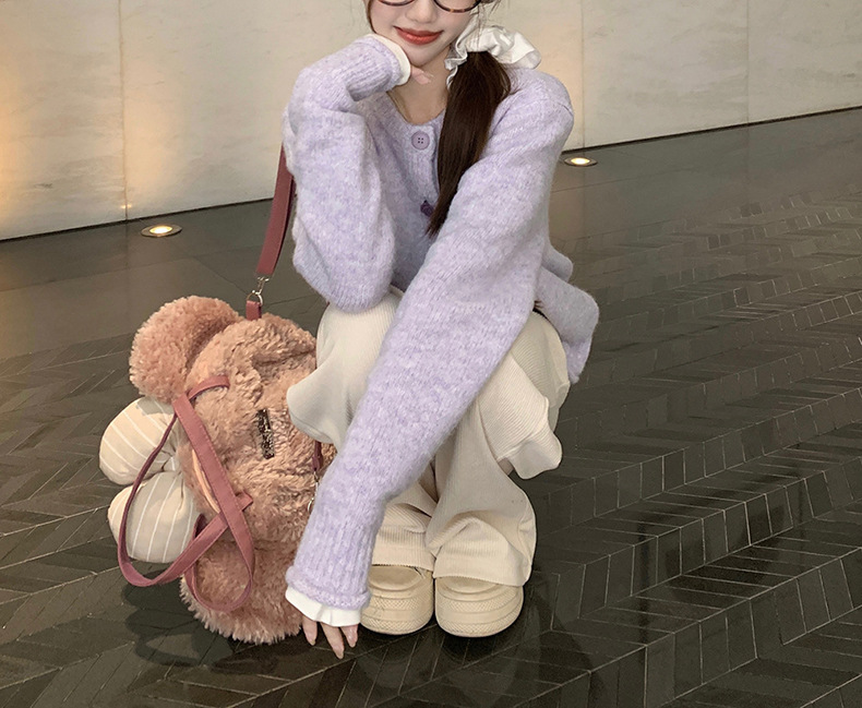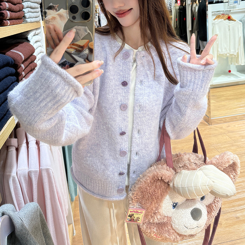 KANING 한국 스타일 고급스러운 보라색 니트 재킷 여성용 2025 가을 신상 달콤하고 세련된 라운드 넥 가디건 여성용스토어 가기