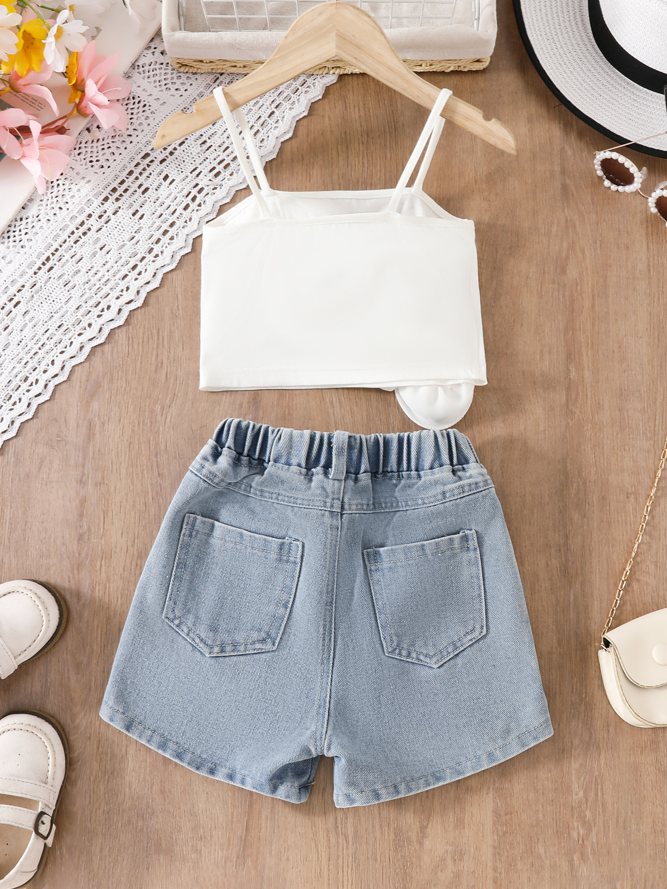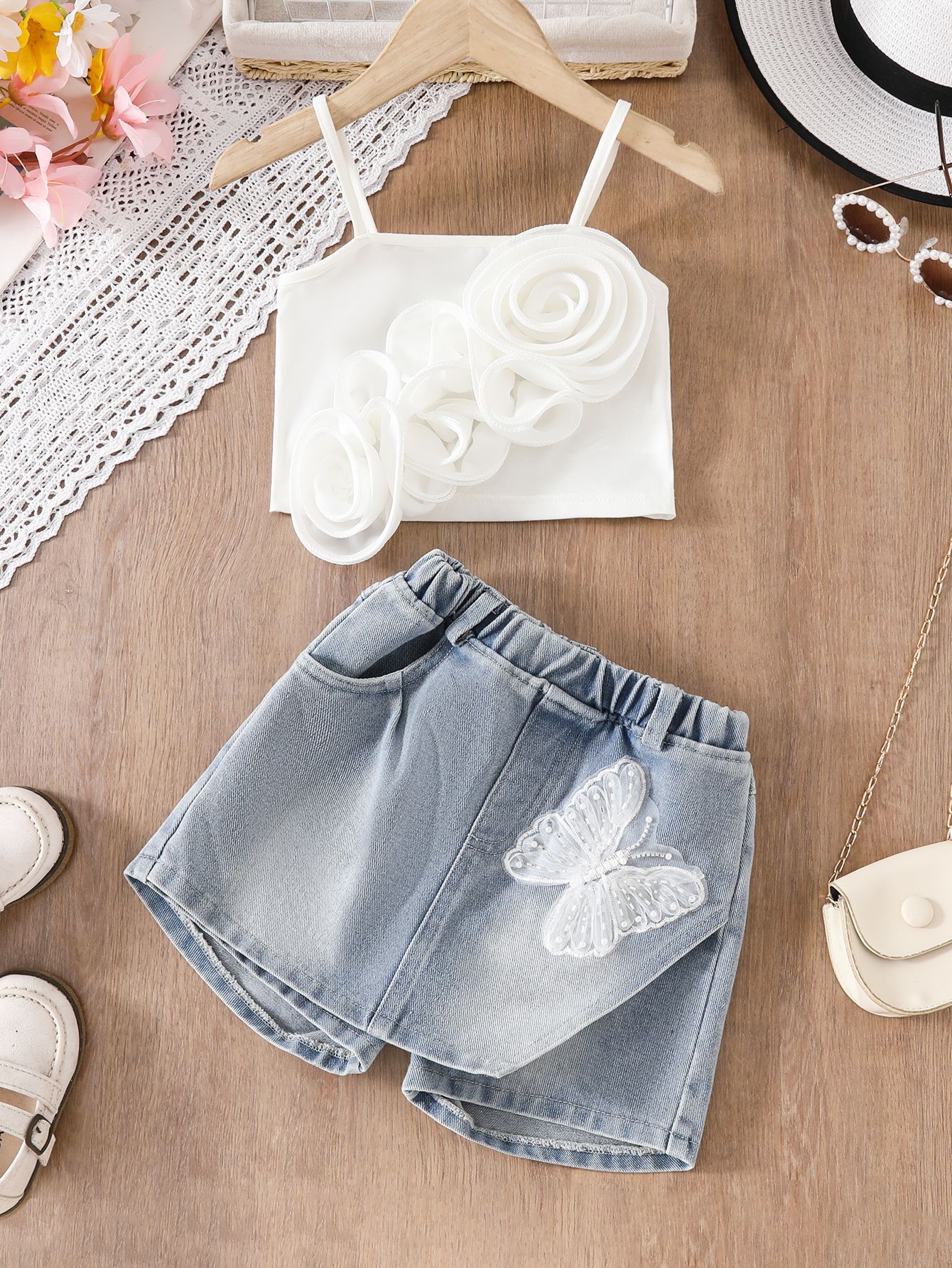 소녀 2025 여름 폭발 중소 어린이 새 3 차원 꽃 슬링 티셔츠 나비 데님 반바지 세트스토어 가기