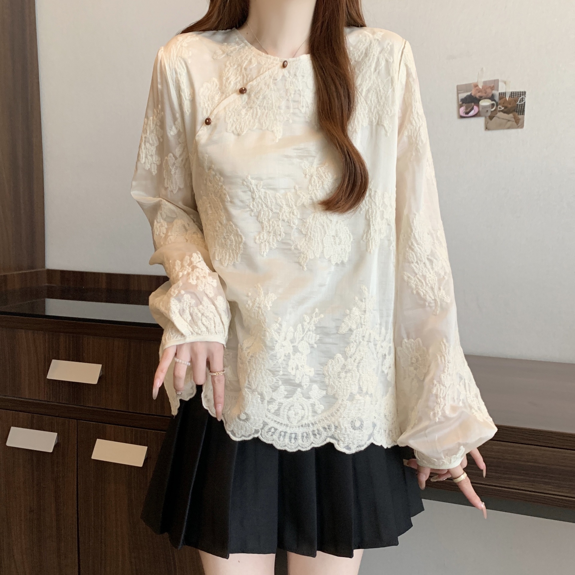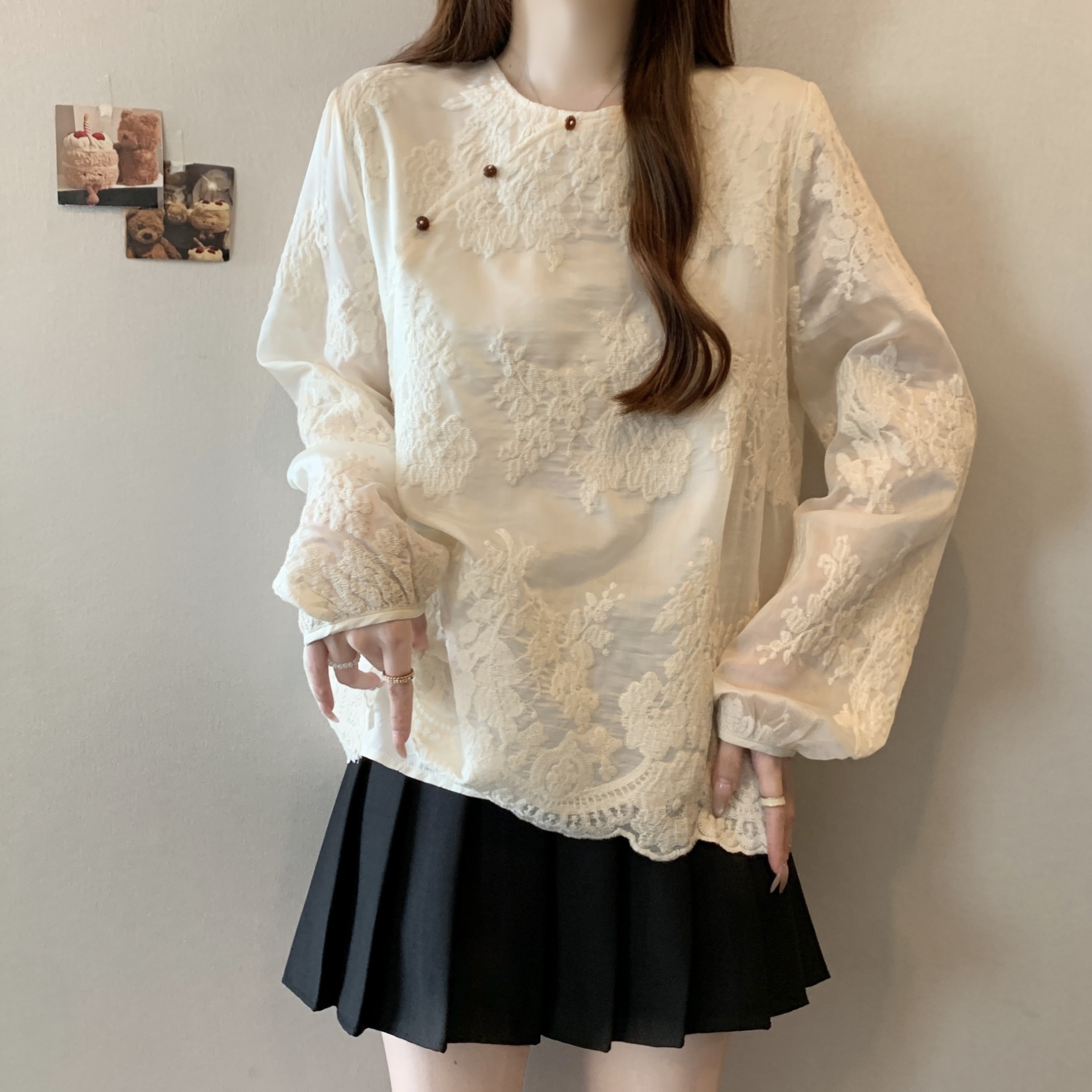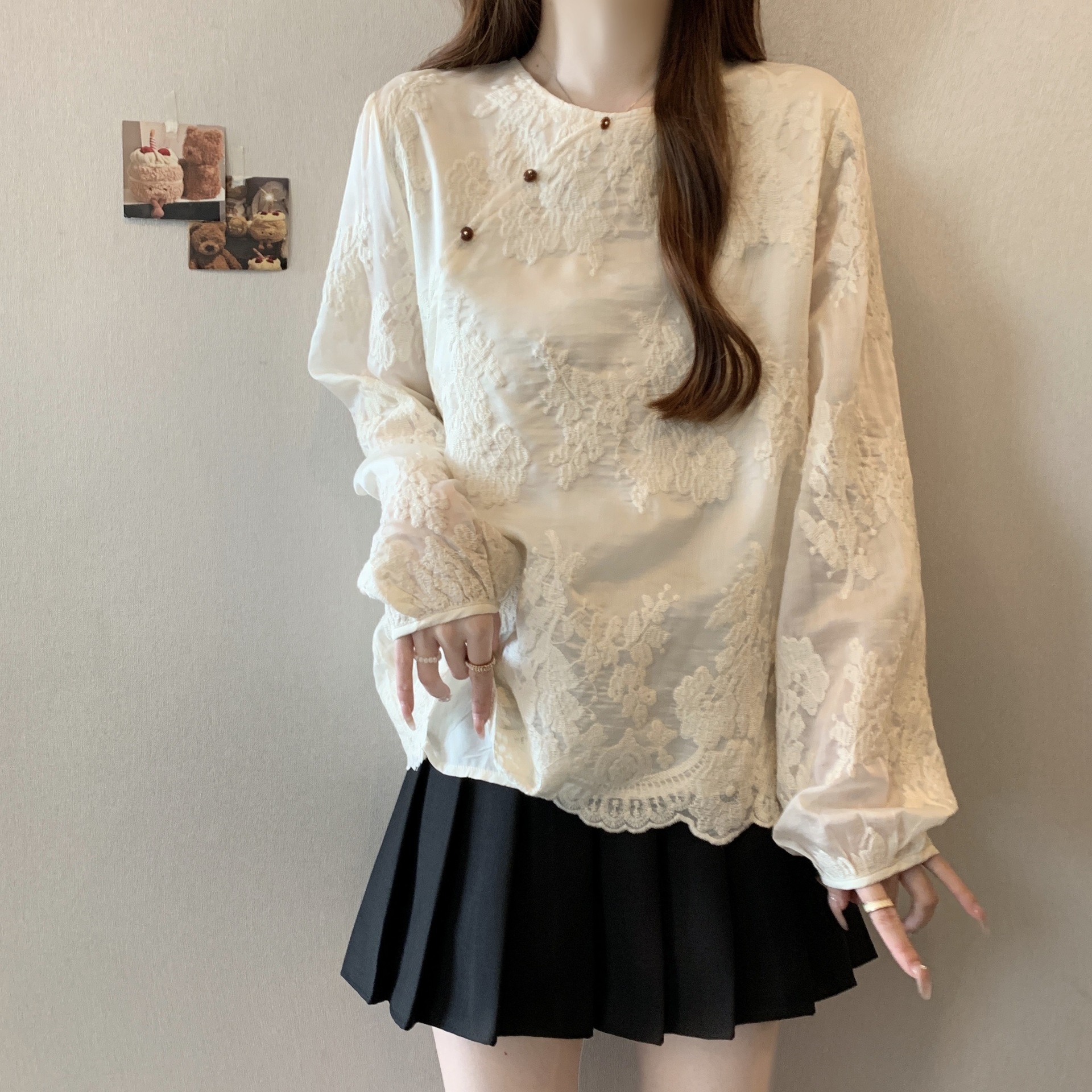 빈티지 Guofeng 중공업 레이스 자카드 셔츠 여성용 봄 플러스 사이즈 통통녀 슬리밍 웨스턴 스타일 틈새 탑