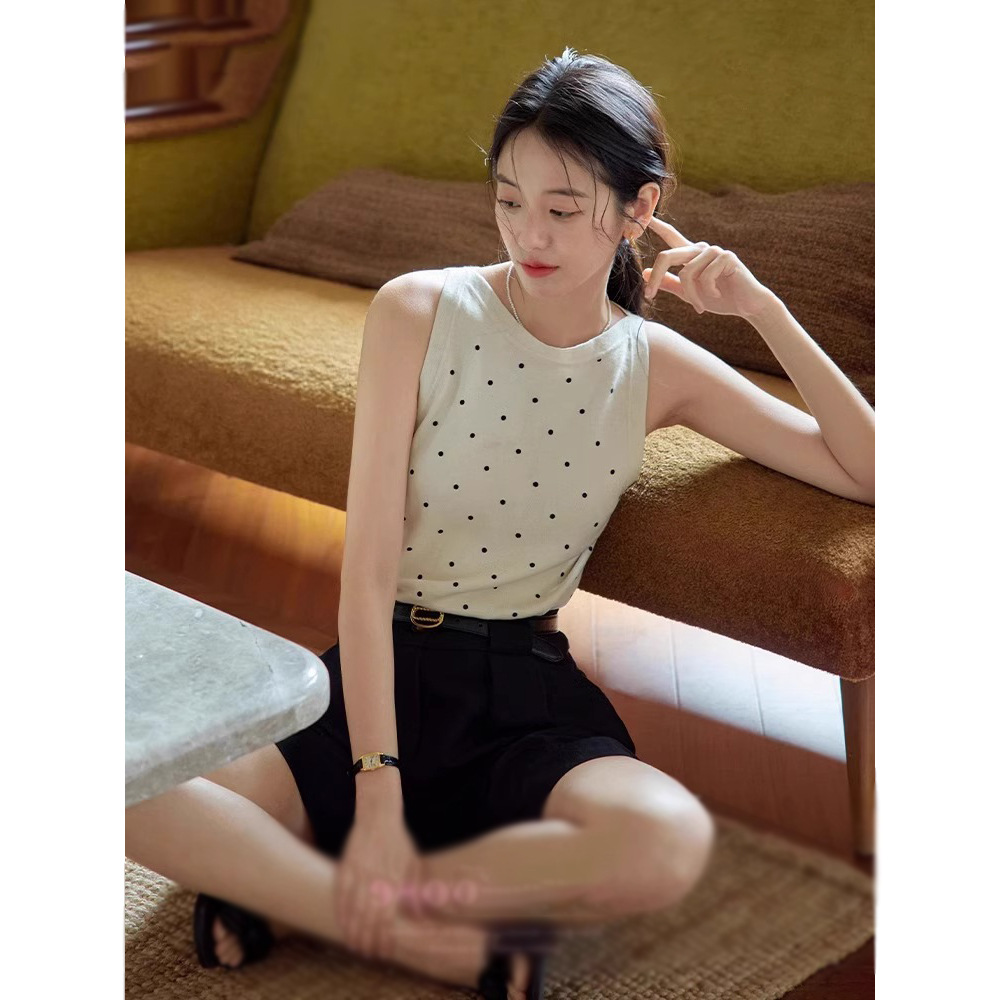 네이비/아이보리 웨이브 도트 조끼 슬링 여성 여름 프렌치 레트로 민소매 아우터 탑스토어 가기