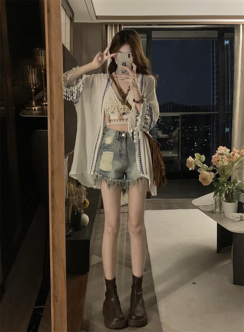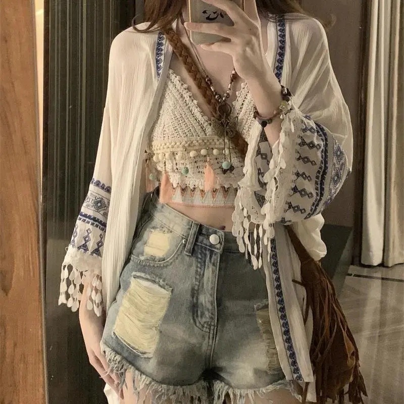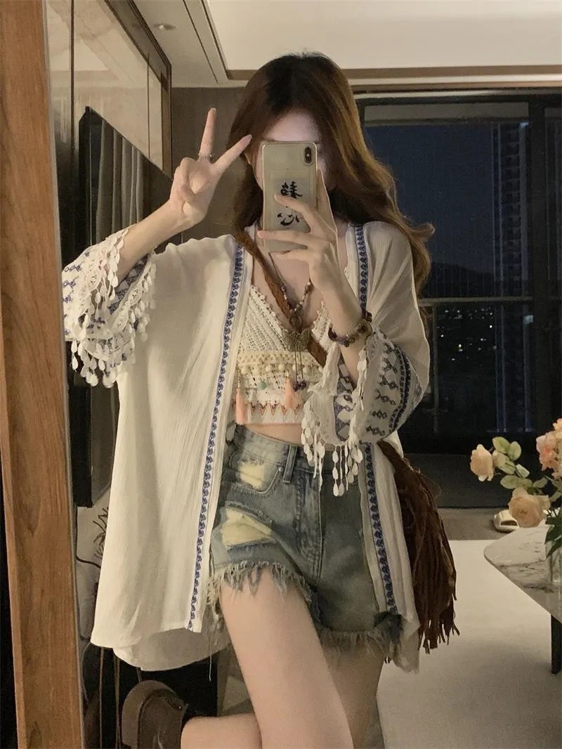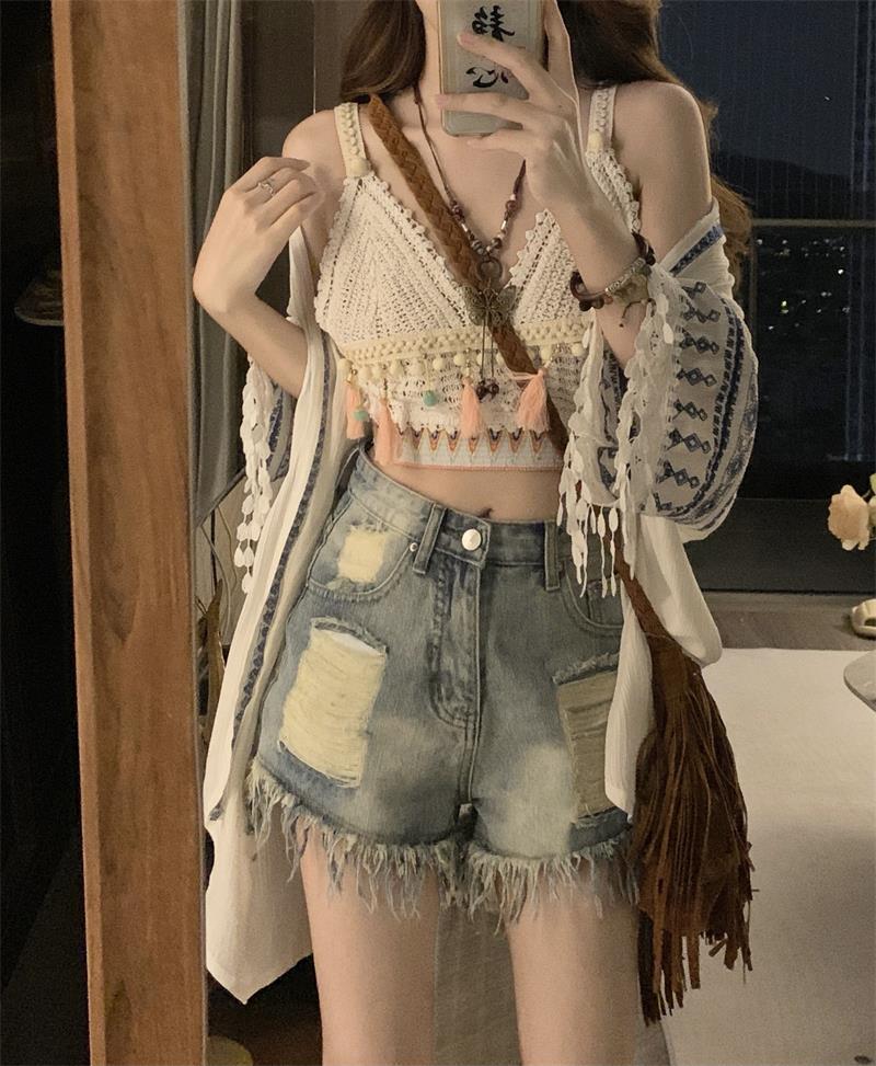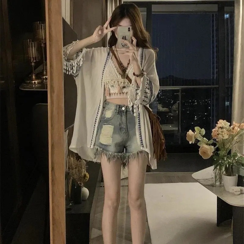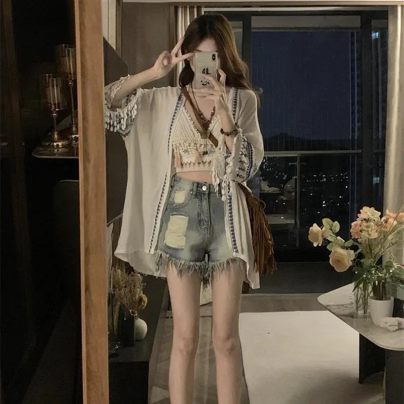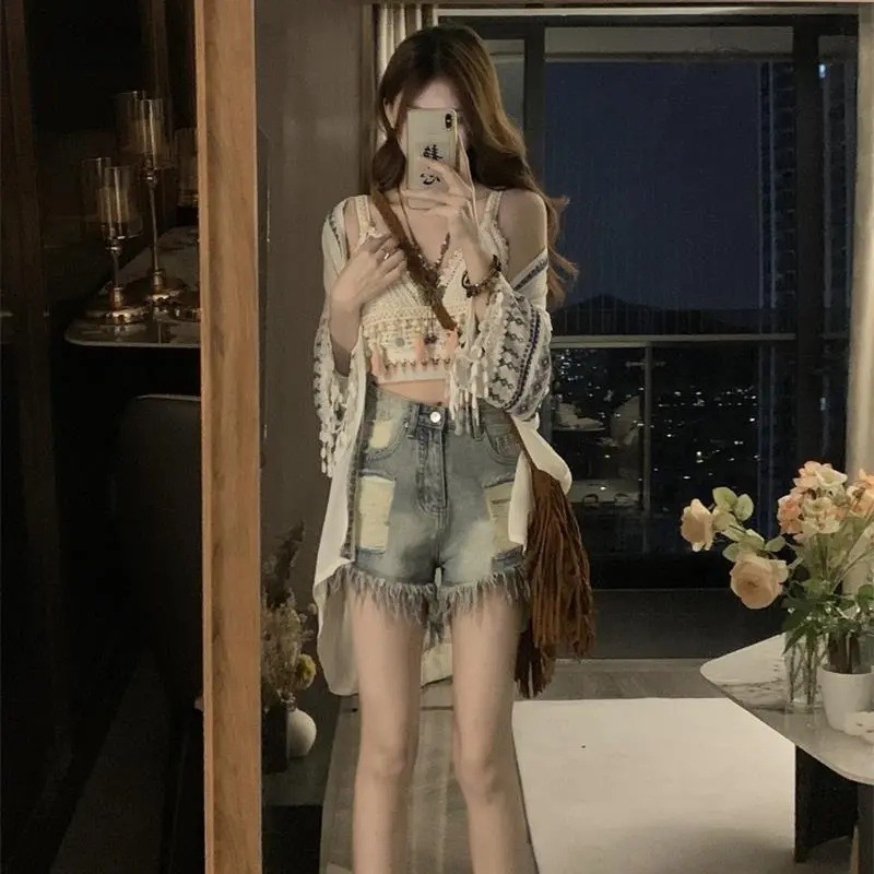 여름 새로운 보헤미안 스파이스 걸 태슬 할로우 스트랩 수 놓은 목도리 카디건 데님 반바지 3 피스 세트