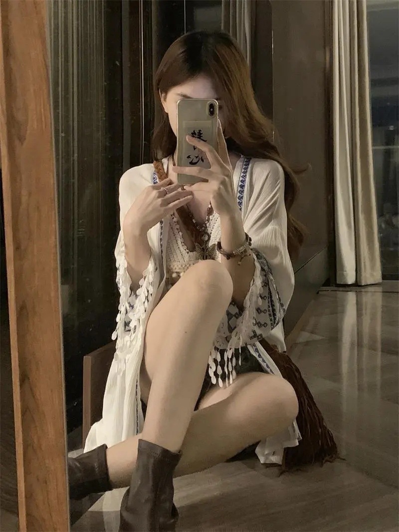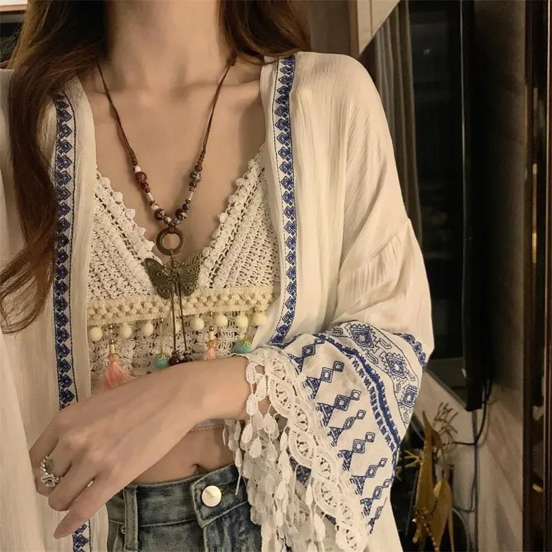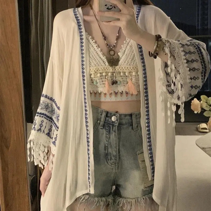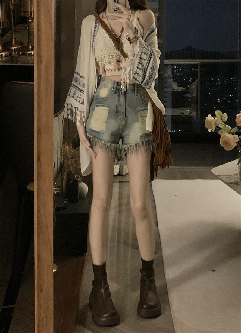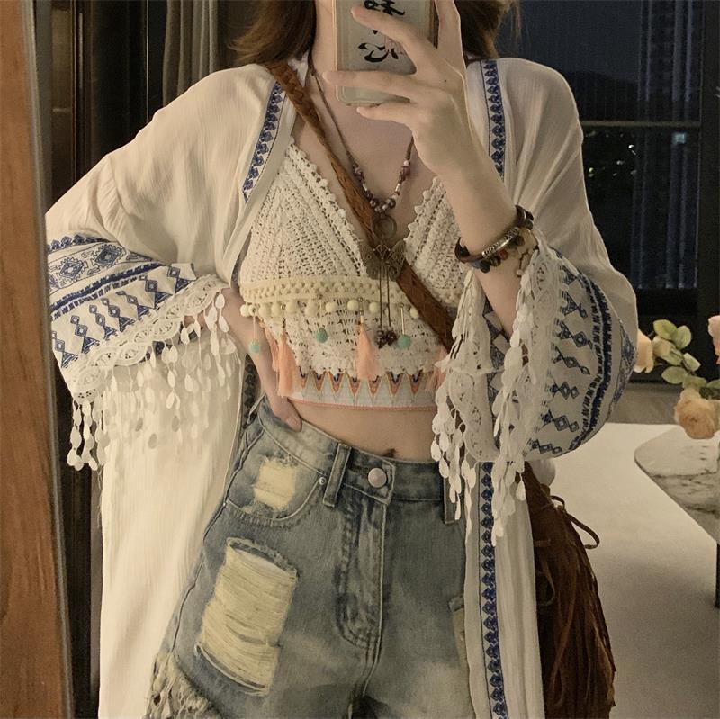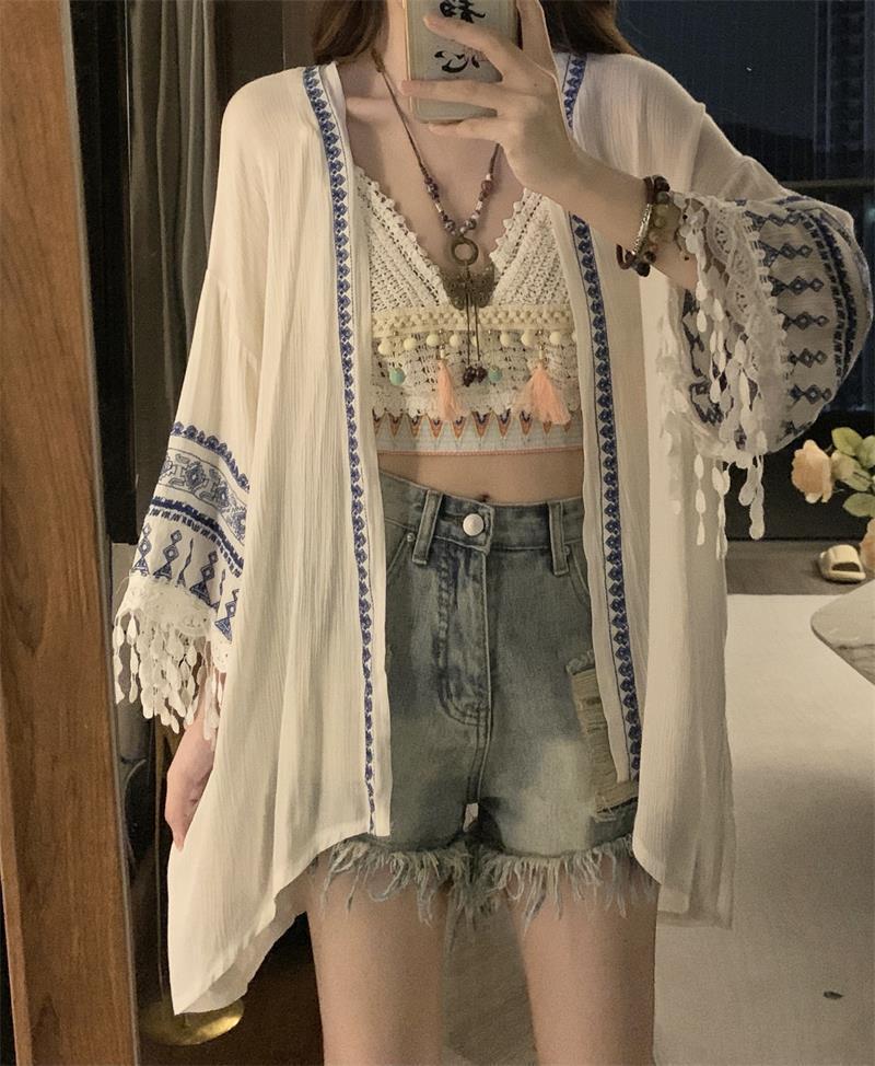 여름 새로운 보헤미안 스파이스 걸 태슬 할로우 스트랩 수 놓은 목도리 카디건 데님 반바지 3 피스 세트