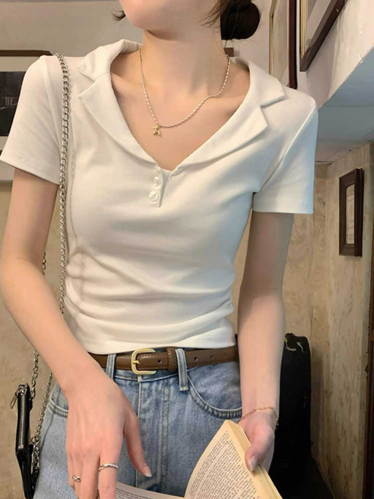 화이트 칼라 어깨 반팔 티셔츠 여성용 여름 디자인 콜라본 폴로 셔츠 슬림핏 허리 쇼트 탑