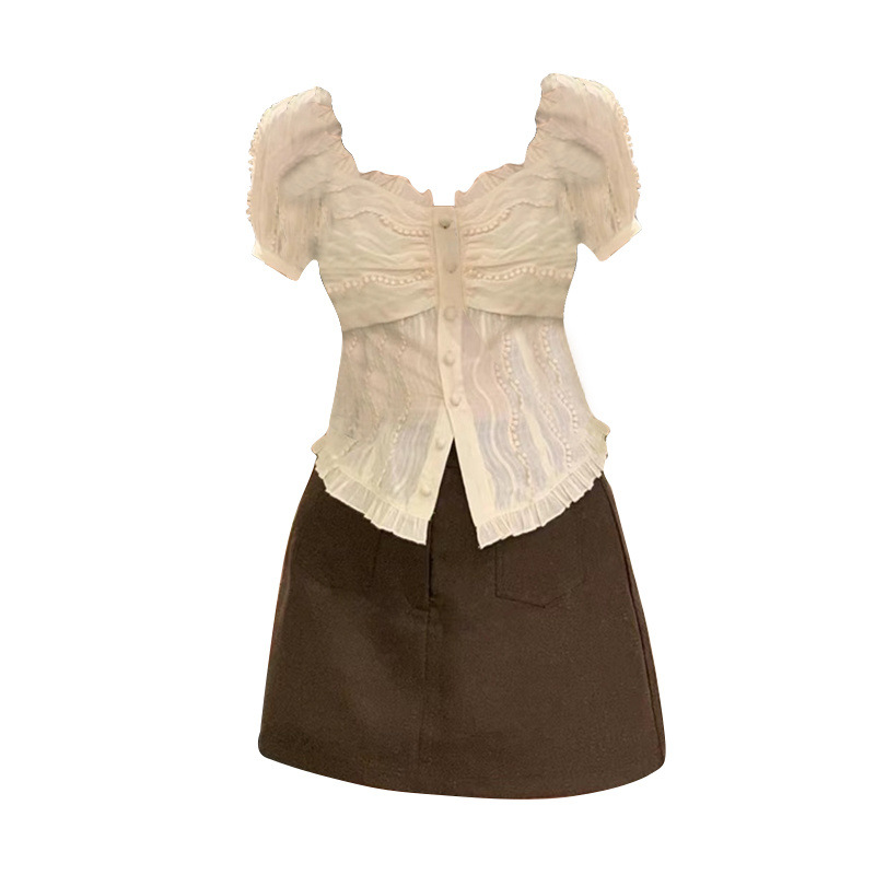 플러스 사이즈 순수한 욕망 스타일 디자인 센스 레이스 퍼프 슬리브 타이트 허리 셔츠 통통 높은 허리 슬리밍 짧은 치마 세트 여름스토어 가기